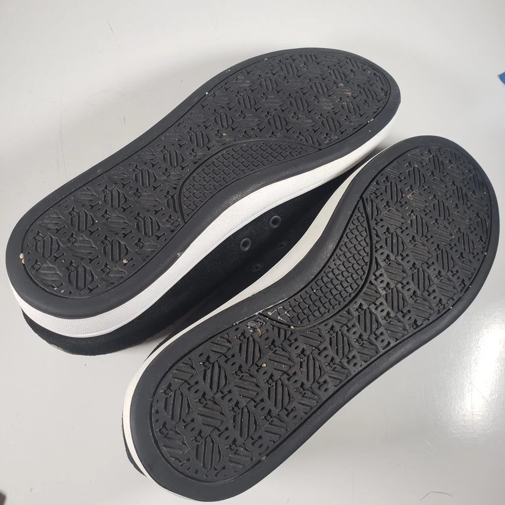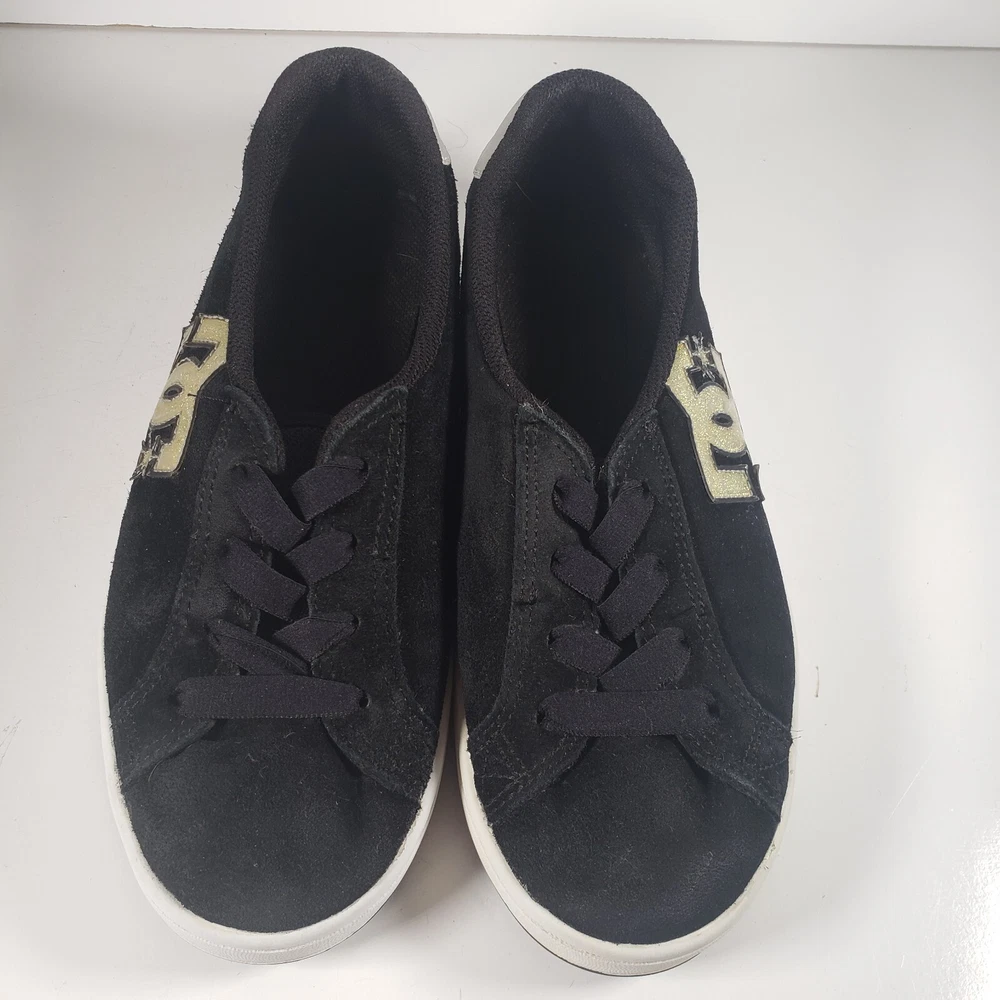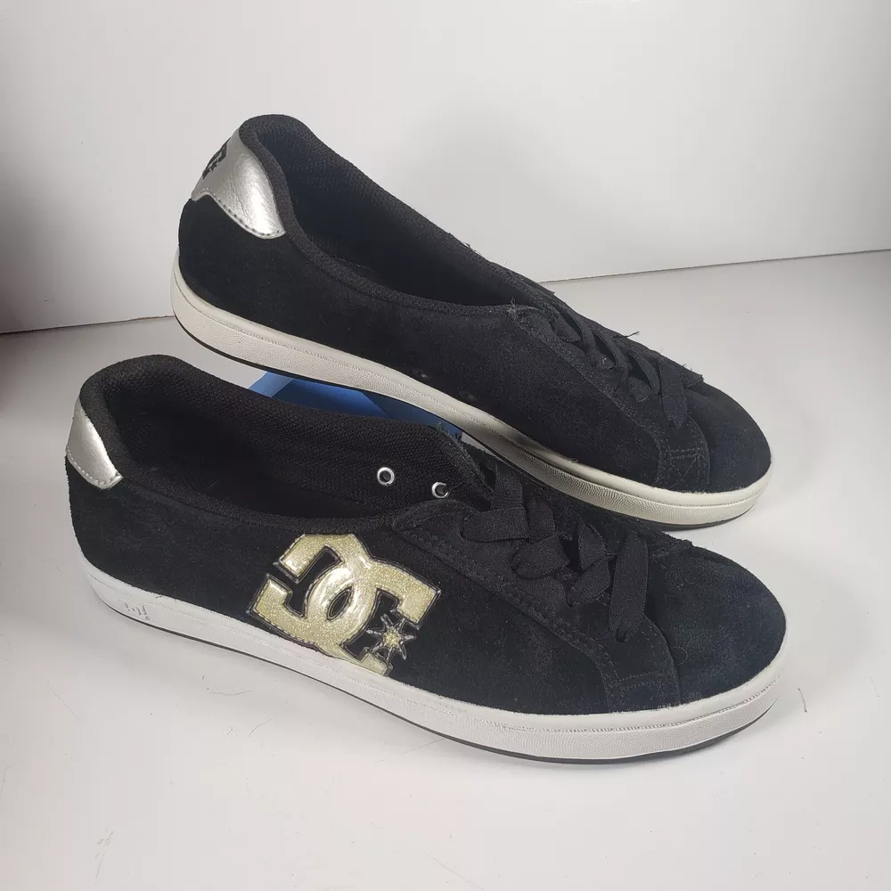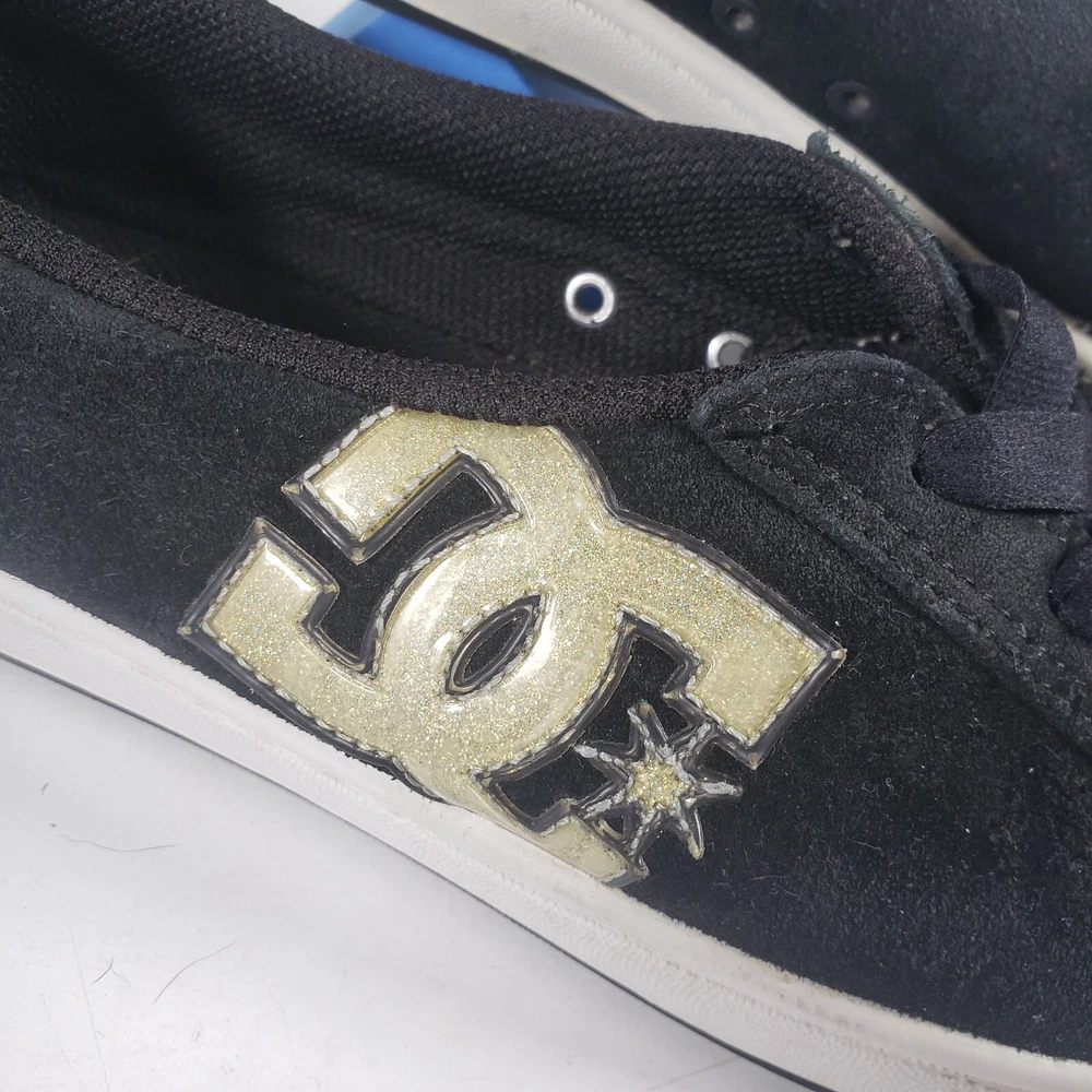 DC Court Slim TX Slip-On Black Suede Skate Sneakers Wns Size 7.5 Sparkly Gold DC on the side. Silver on the back. EUC, Super Clean and no damage.