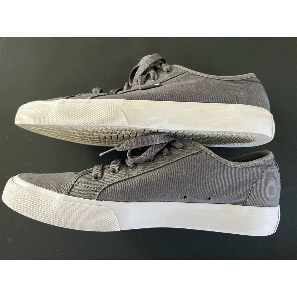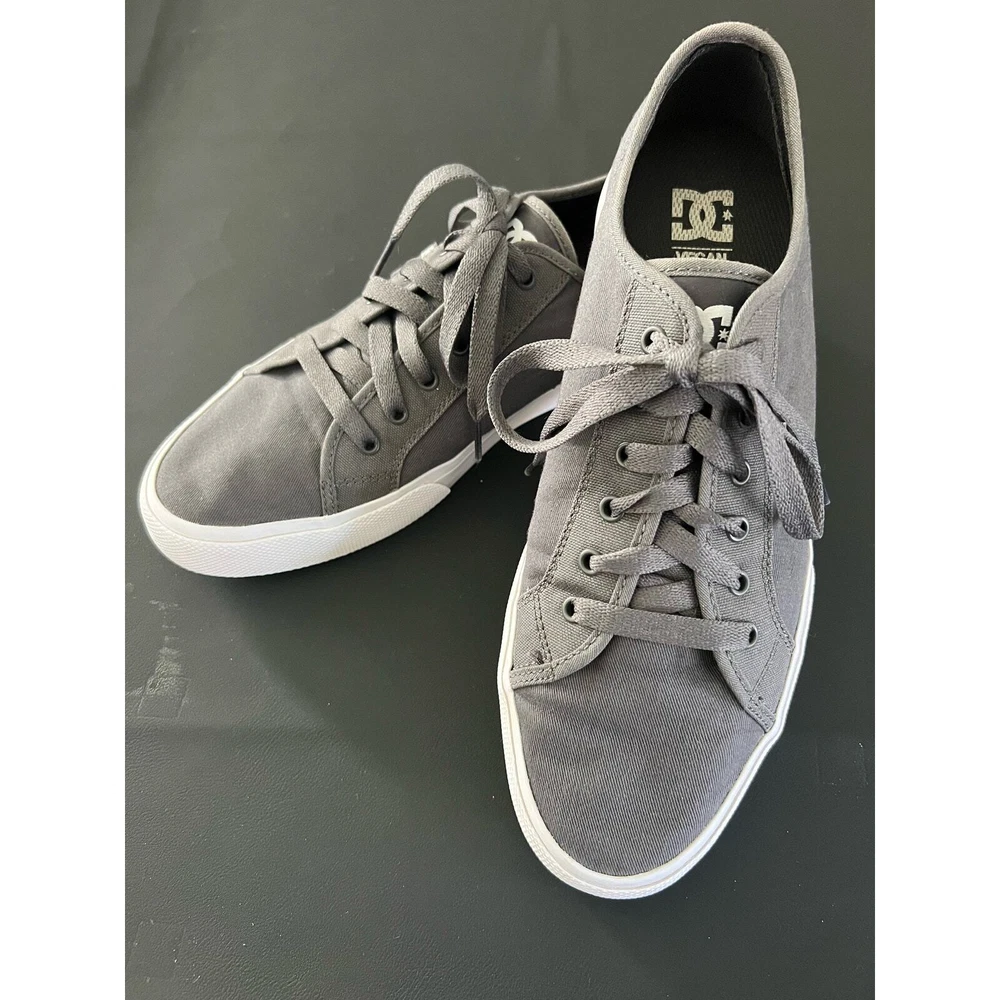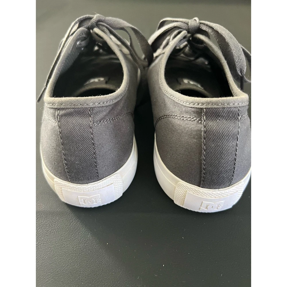 DC Manual TXSE ADYS300678 gray low top lace up sneakers. Vegan friendly canvas. Men's size 11. Good pre-owned condition. Some staining on sides (white rubber parts) but no stains on canvas or wear on tread. See pictures for details.