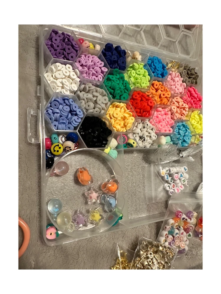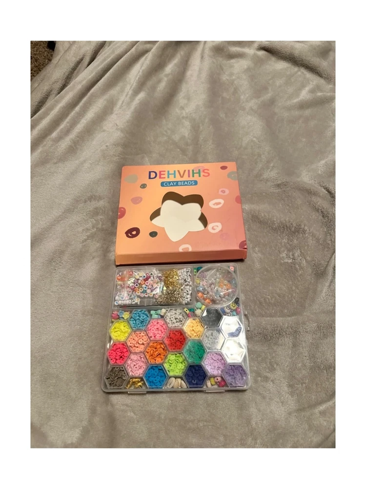 DEHVIHS Clay Beads Kit, 6000PCS Friendship Bracelet Making Kit, 21 Colors with 26 Types of Charms Preppy Polymer Heishi Beads with Letter Beads Jewelry Making Kit Product Details Color: Colorful Brand: Unbranded MPN: Does not apply UPC: Does not apply EAN: Does not apply Brand: DEHVIHS Age Range (Description): Kid Color: Colorful Item dimensions L x W x H: 7.09 x 7.87 x 0.71 inches Material: polymer clay heishi Brand: DEHVIHS Age Range (Description): Kid Color: Colorful Item dimensions L x W x H: 7.09 x 7.87 x 0.71 inches Material: polymer clay heishi Seasons: All Seasons Included Components: 2 rolls of elastic thread, scissors, tweezers, 21 colors of clay beads, 3 varieties of letter beads, 25 varieties of charms and accessories Number of Pieces: 6000 Style: Unique Special Feature: Polymer Clay Heishi, Versatility, Personalization Art Craft Kit Type: Clay Beads, Friendship Bracelet Making Manufacturer: DEHVIHS Product Dimensions: 7.09 x 7.87 x 0.71 inches Item Weight: 6.4 ounces Date First Available: November 18, 2023 [Unlock Your Creativity]: This comprehensive beading kit provides you with a wealth of inspiration. 21 vibrant colors of clay beads (about 260pcs per color, 5460pcs in total), 3 varieties of letter beads (104pcs in total), and an assortment of 25 varieties charms and accessories (436pcs in total). We've also included 2 rolls of elastic thread, a pair of scissors, and tweezers. Let your imagination soar and indulge in endless DIY fun! [Premium Quality Material]: Our clay beads are crafted from polymer clay heishi, offering a lightweight and comfortable feel. Perfect for any occasion, from beach outings to parties and banquets, these beads ensure both style and comfort. [Versatile Creations]: Dive into a world of possibilities! Use this clay bead kit to craft friendship bracelets, necklaces, anklets, or even charming cell phone pendants. Bond with your kids over cheerful family DIY time or create heartfelt DIY gifts for birthdays, Valentine's Day, Mother's Day, Christmas, and Thanksgiving. [Ideal DIY Gift]: Explore various color combinations and letter bead arrangements to unveil unique designs with distinct meanings. Enhance not only your crafting skills but also color cognition, hands-on ability, concentration, and patience. This kit fosters a harmonious and enjoyable family atmosphere, strengthening parent-child relationships through shared DIY experiences. [Important Reminders]: For the safety of children, it's advisable to supervise their use of this clay beads kit to prevent accidental ingestion. If you have any questions or need assistance with our product, feel free to reach out. Your satisfaction is our priority!