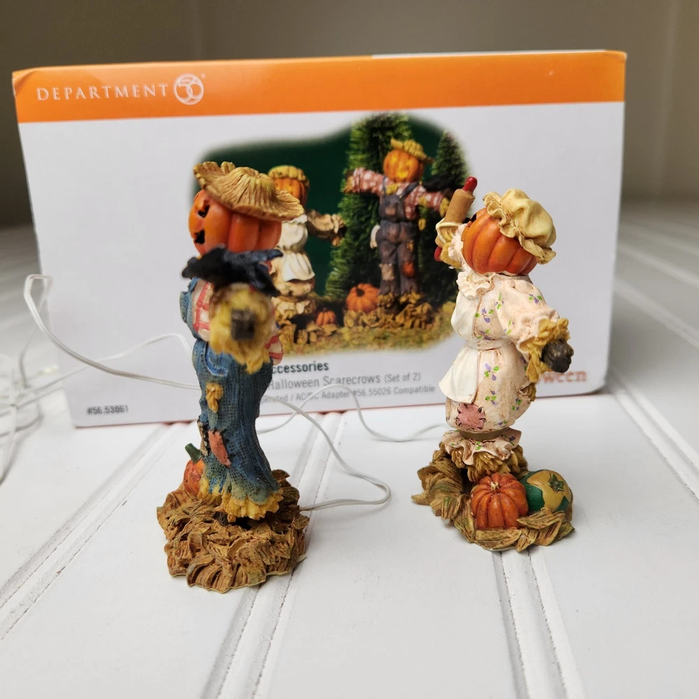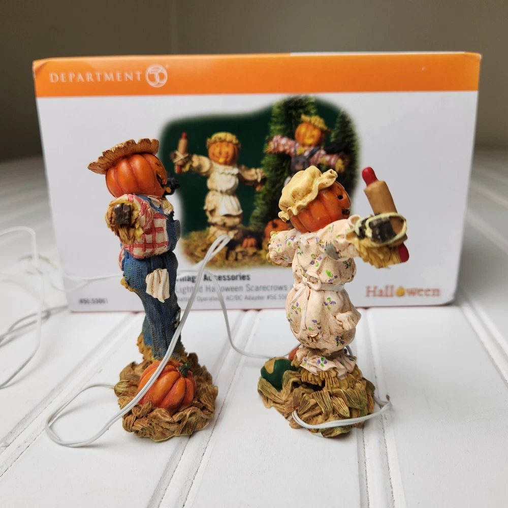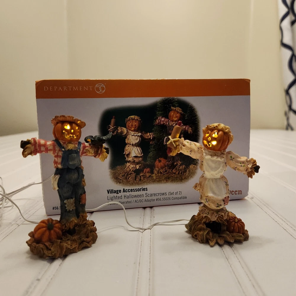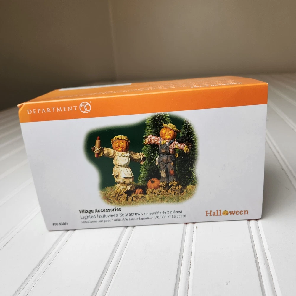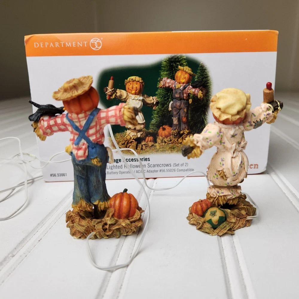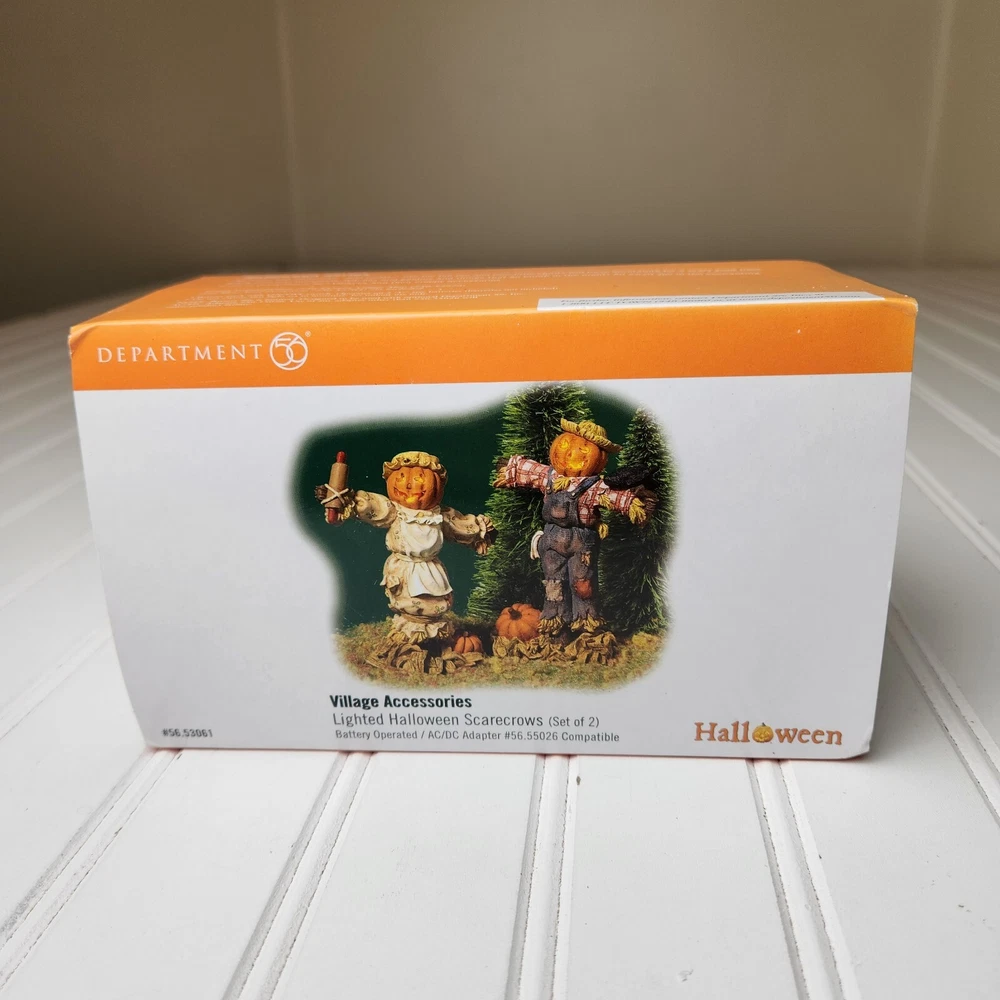 This is a DEPT 56 Halloween Village accessory featuring LIGHTED HALLOWEEN SCARECROWS, which are new open box. It is a collectible item that would make a spooky addition to a Halloween-themed display or village. This accessory is perfect for decorating during the Halloween season and would add a festive touch to any holiday display. Takes two c batteries not included. New open box never displayed. Batteries not included