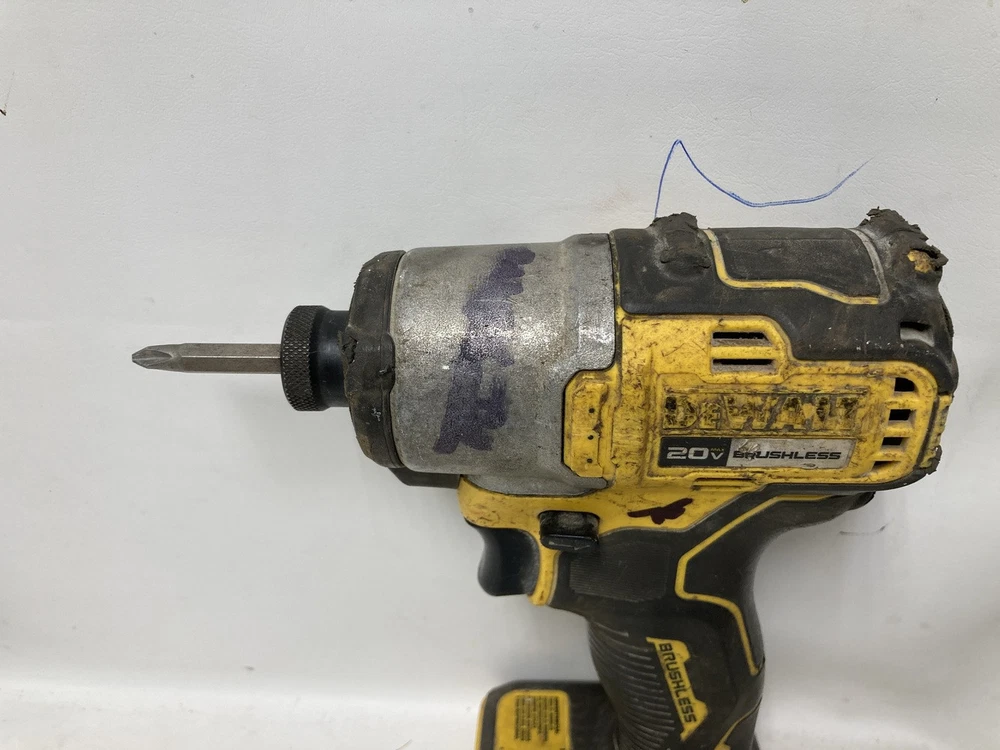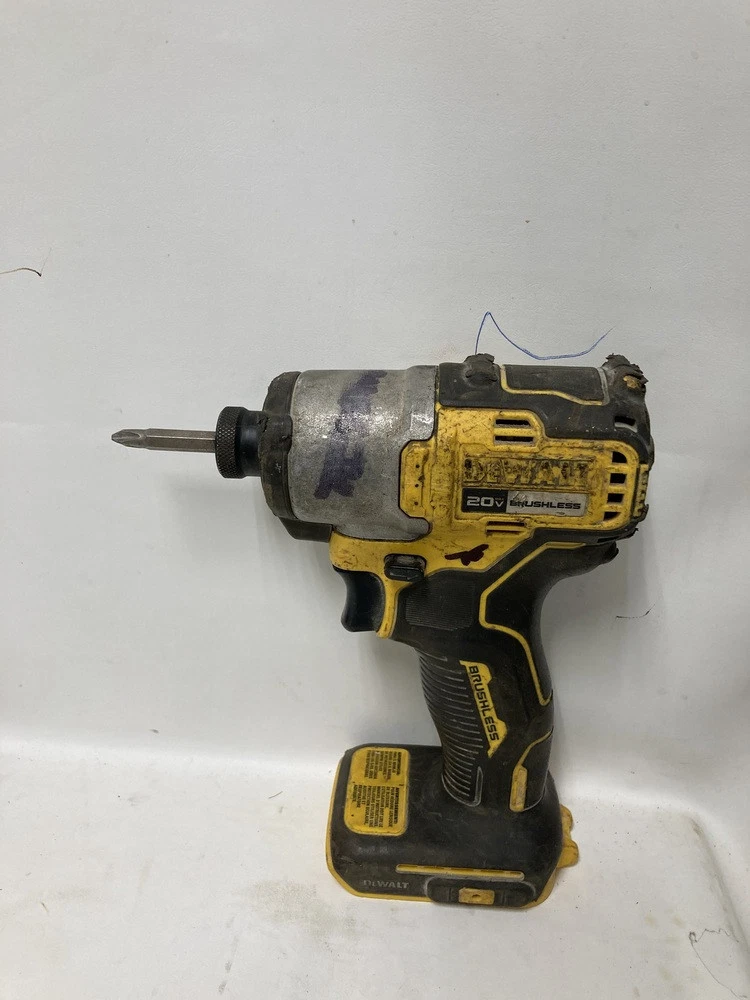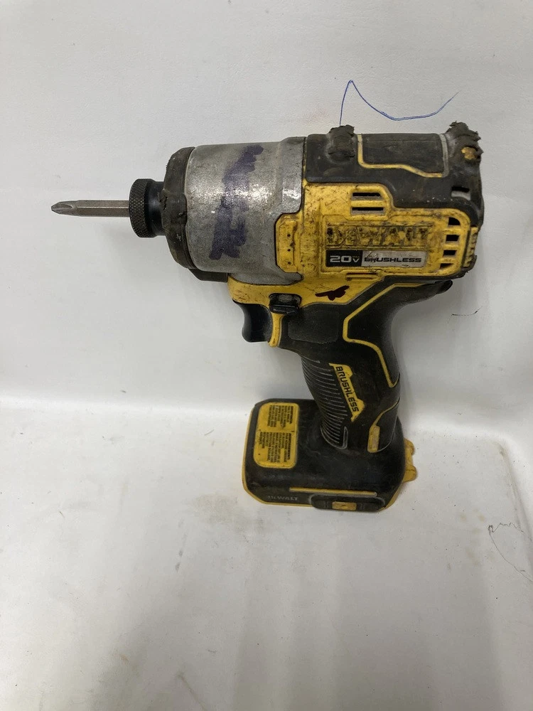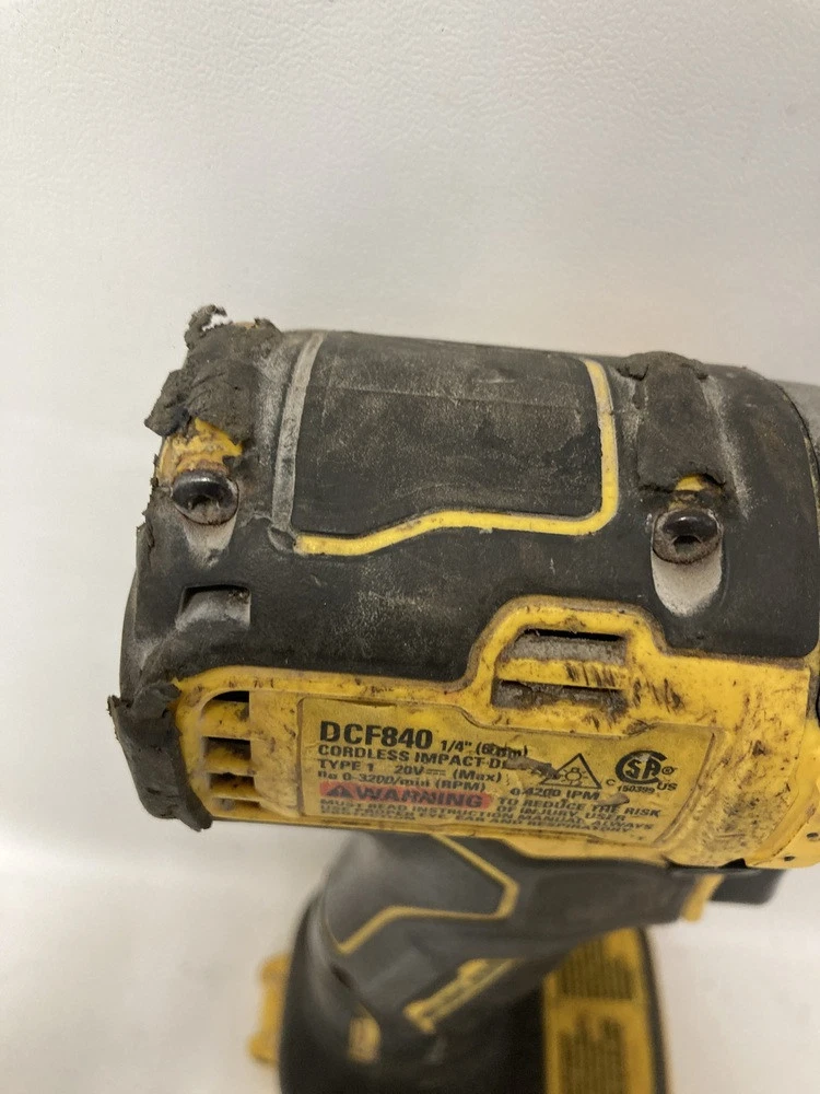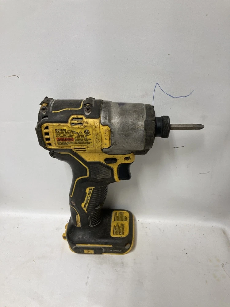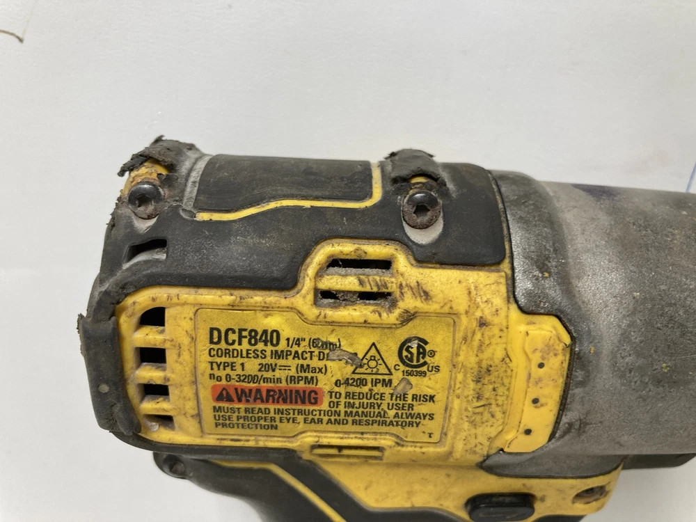 DEWALT DCF840 PREVIOUSLY OWNED IMPACT DRILL TESTED AND WORKS GREAT TOOL ONLY NO BATTERY 20 V BRUSHLESS MOTOR SOME SIGNS OF WEAR AND TEAR FROM PREVIOUS USE