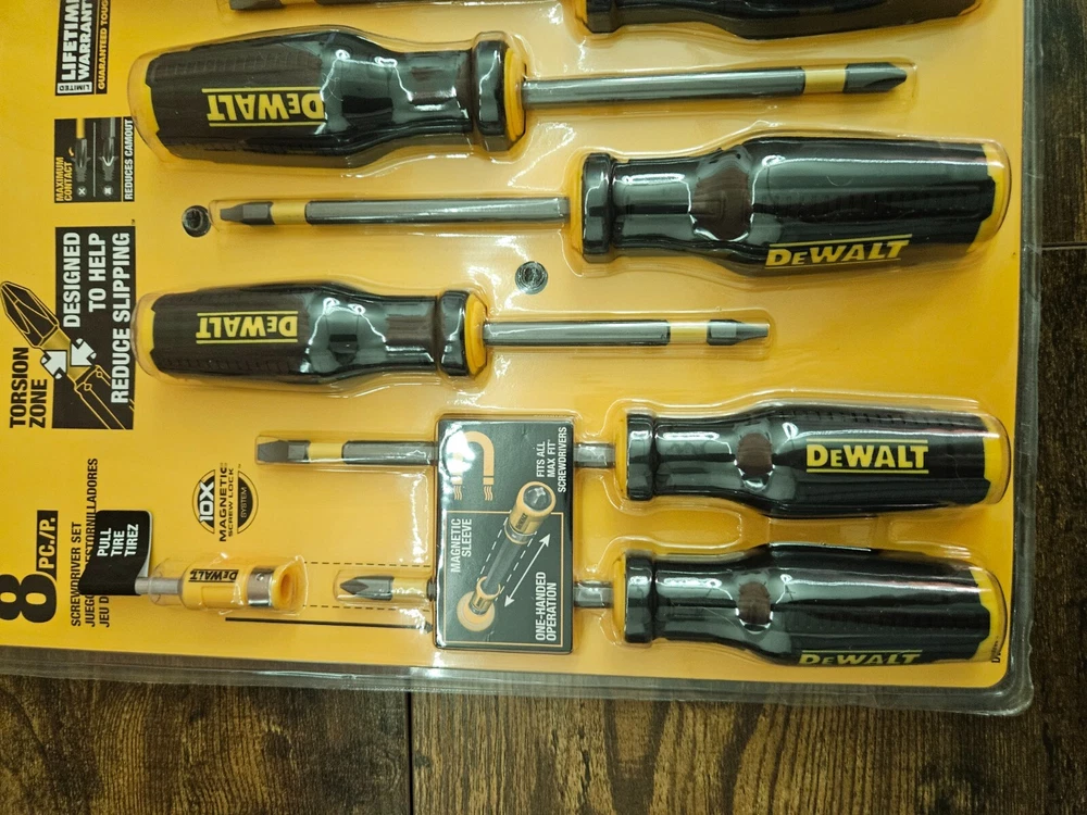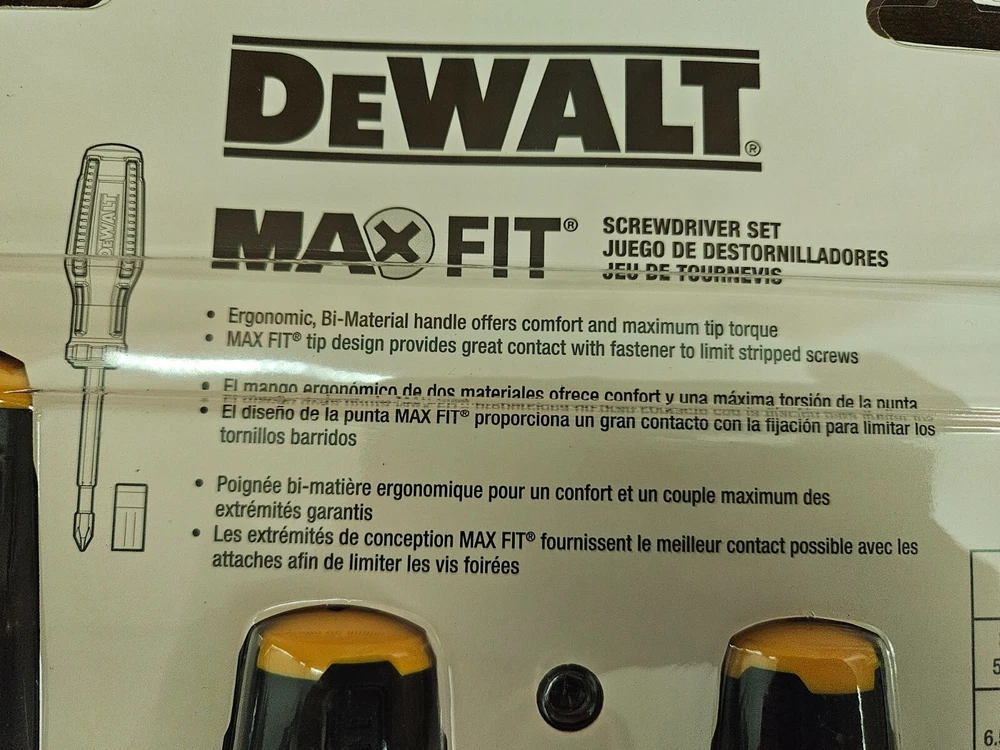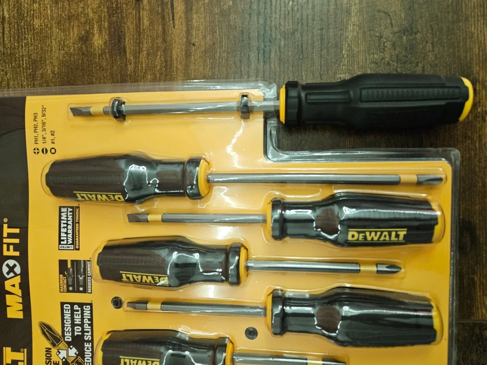 The DeWalt Max Fit Phillips/Slotted Assorted Screwdriver Set includes 8 pieces of screwdrivers designed for various tasks. With a cushion grip feature, it provides comfortable handling during use. The set is suitable for standard (SAE) measurements and comes in a sleek black color, reflecting the high-quality and durability characteristic of the DEWALT brand. Perfect for home improvement and workshop projects, this screwdriver set is a reliable tool for both professionals and DIY enthusiasts.