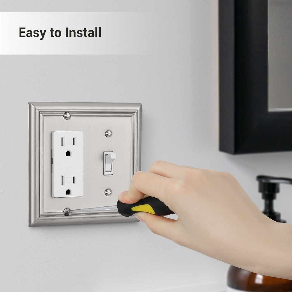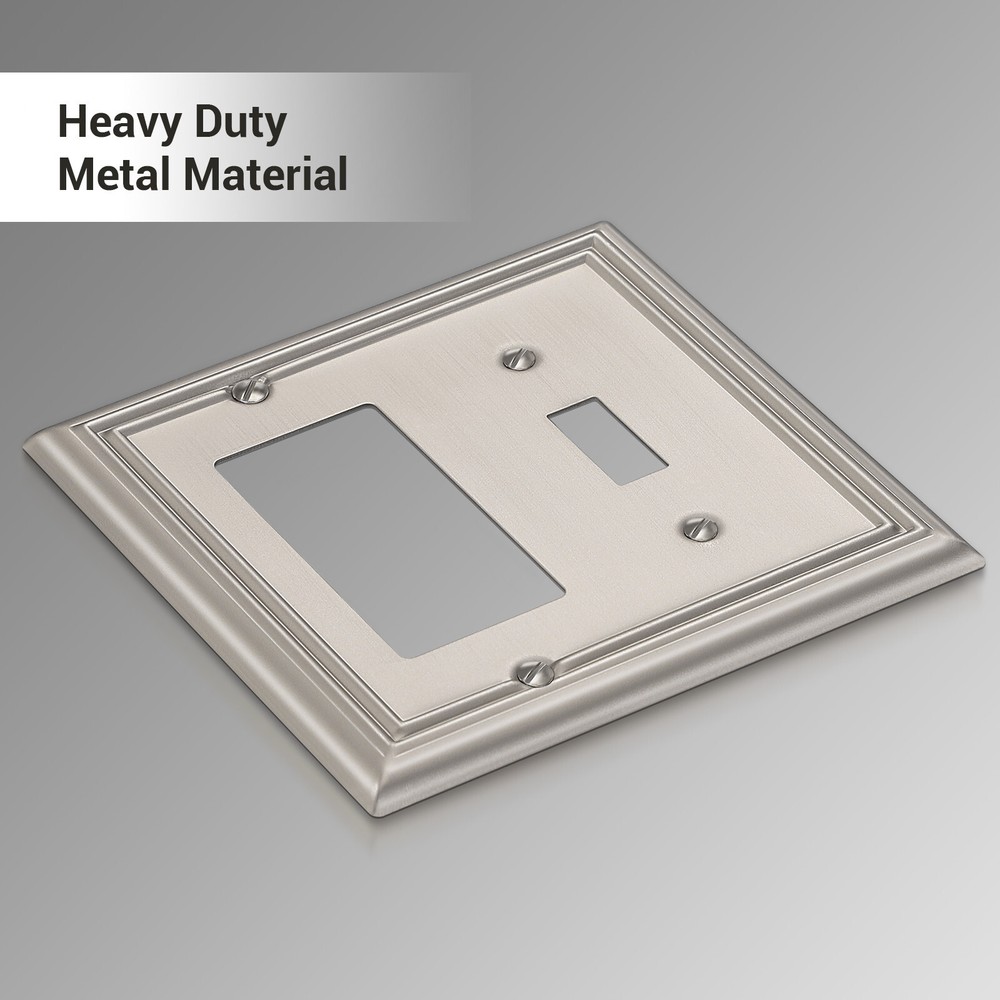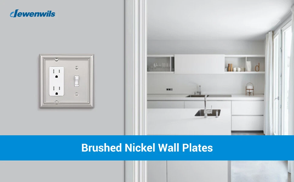 DEWENWILS Combo Toggle/Decorator Wall plates, Brushed Nickel Double Outlet Covers, 2-Pack About this item 【Elegant&Simple Design】Brushed nickel finish fits with texture on the edge, giving your home a nice modern look; making the receptacles or light switches more decorative 【Durable Metal Construction】Made of thick sturdy metal, heavy duty quality for harsh conditions; never easy to broke, the outlet cover will maintain its finish for years 【Easy Installation】The matching screws are already included, install the metal wall plate in minutes, ideal for updating or remodeling anywhere of your home 【Wide Application】The brushed nickel wall plates match in various formats, can be widely used in dimmer, toggle switch, outlet receptacle, GFCI outlets etc. 【Product Details】Packaged wall plates for covering standrad outlets, with mounting screws included; 1-year warranty and friendly customer service Specification: Material: Matel Finish Type: Brushed Nickel Package Includes: 2* Metal Wall Plate 1* User Manual