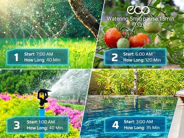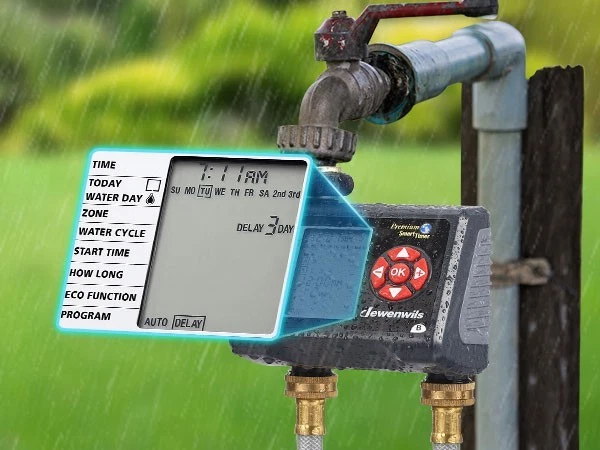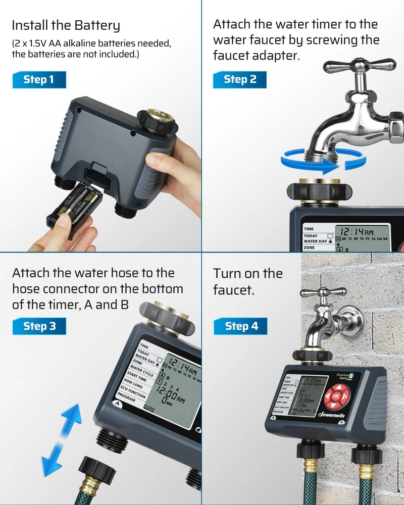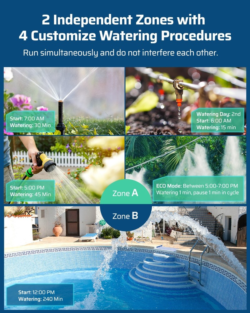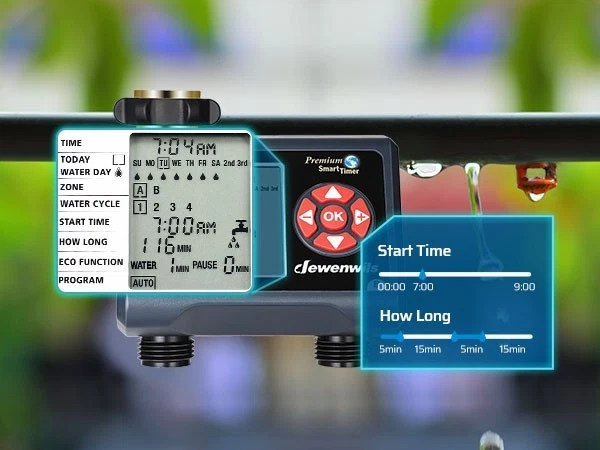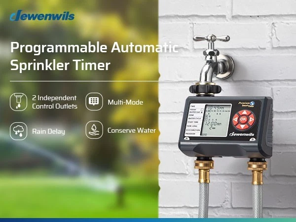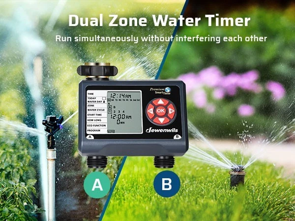 DEWENWILS Sprinkler Timer 2 Zone, Water Timer for Garden Hose, Programmable Hose Timer Faucet Watering with Automatic/Rain Delay/Manual Mode, Outdoor Irrigation Controller for Lawn, Yard Product description Mesh filter Added metal filter that can eliminate 99% of water impurities and prevent them from entering the interior to create blockages Upgraded Leakproof Design Pure zinc integrated tap connector is durable and can prevent water leakage during use Waterproof Battery Compartment The internal rubber ring around the battery tray protects the battery from moisture Big LCD Screen With 3.4" large easy to read LCD screen, details of all functions and working statuses are displayed intuitively About this item [Easy to Program & Setup] With 3.4" large easy to read LCD screen, details of all functions and working statuses are displayed intuitively, 5 program buttons make your settings easy as adjusting a digital watch, easy to select the days, start time, duration and frequency of your watering schedule, this watering timer can work throughout the summer once set up and programmed [Upgraded Leakproof Design] Pure zinc integrated tap connector is durable and can prevent water leakage during use, it supports standard 3/4 outdoor water faucet; ABS plastic shell is sunscreen and waterproof for outdoor use; the water timer for garden hose won't reduce your water pressure and can withstand water pressure of up to 120 psi [8 Programs for 2 Independent Zones] 2 zones( A and B) can be controlled independently on the same day, each zone has up to 4 watering cycles per day, this water-efficient sprinkler timer can meet your watering needs with different hoses throughout the day, ideal for sprinkler, watering or drip irrigation systems for lawn, garden, yard, potted plants, vegetable, etc. [Multiple Functions] ECO Mode allows connected devices to be on/off for a specific duration and repeat intermittently in your scheduled period, achieving deep plant watering with less consumption; Rain Delay Mode to avoid over-watering plants/flowers during rain and save water; Manual Mode is designed for temporary urgent needs without interrupting the preset auto programs [Hassle free on Vacation] Powered by 2 1.5V AA batteries (not included), the low battery indicator warning helps to replace battery in time, once forget to replace it when you are away on holiday, the hose timer for watering will keep OFF to avoid overwatering to save your garden and conserve water; when power is back on, just reset the current time, the previous watering schedules are still kept