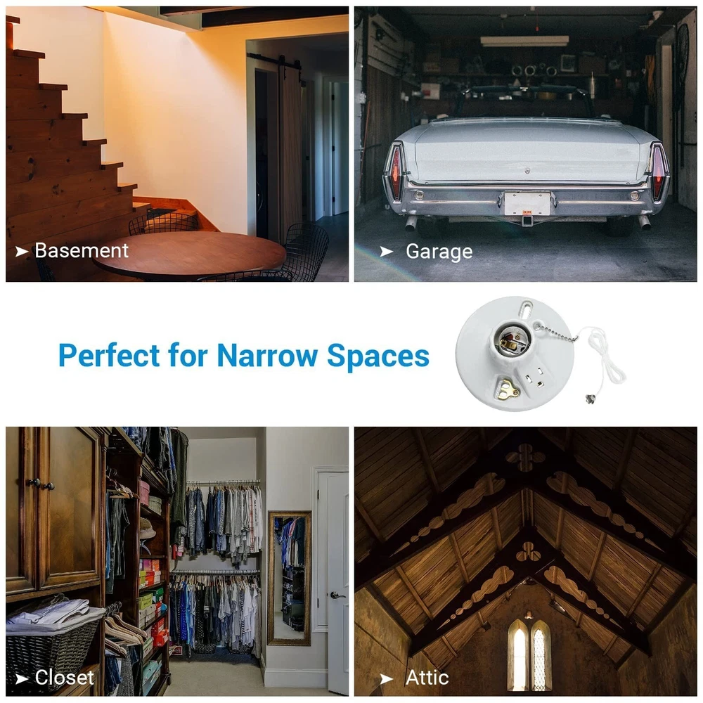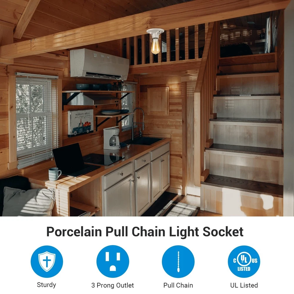 DEWENWILS Light Socket with Grounded Outlet, Porcelain Pull Chain Light Fixture, E26/E27 Base, 2 Pack, UL Listed Brand DEWENWILS Material Porcelain Color White Base Type Medium Product Dimensions 3.5"W x 4.5"H About this item STURDY LIGHT SOCKET BASE - Made of porcelain materials, the light socket offers robust quality in use, providing a new lighting location in narrow spaces, including basement, garage ,closet, attic, etc. ONE GROUNDED OUTLET - Equipped with an always-on 3 prong outlet, you can have a power place for an additional lights or appliance EASY INSTALLATION - The porcelain light socket is specially design for easy installation, saving your trouble from drilling holes, suitable for different outlet box sizes SMOOTH PULL CHAIN - Using pull chain to turn on/off the bulbs on the light socket, 90cm pull chain operates smoothly and long enough for use COMPATIBLE BULBS - E26/E27 bulb base, compatible with incandescent, CFL or LED bulbs (max. 660W), power rating: 125 VAC, 15A, INDOOR use only, UL Listed (Item does not ship to Miami&Doral, FL), have any problem please contact us !