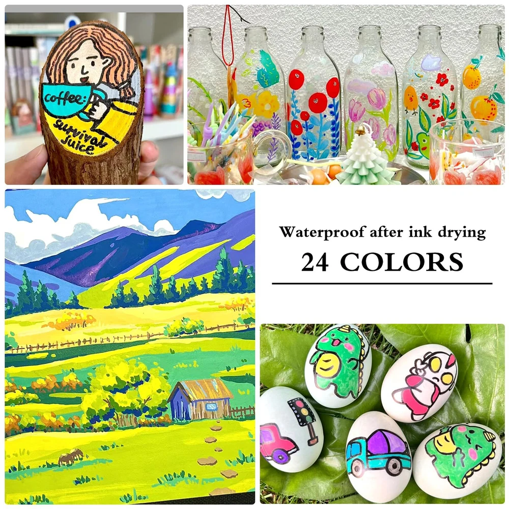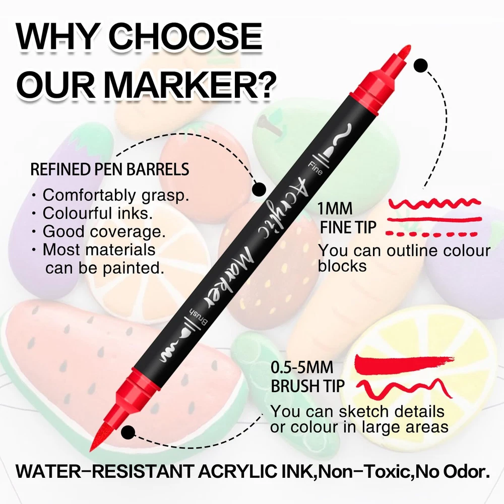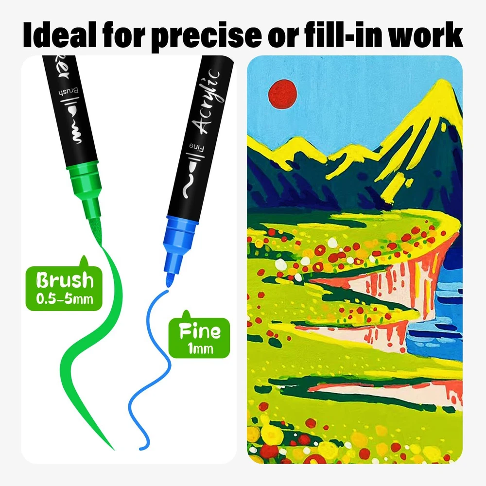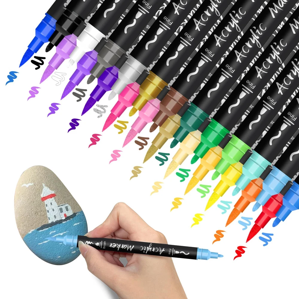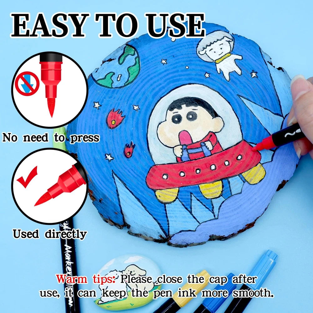 ใ26 ๐๐๐๐ง๐๐ฃ๐ฉ ๐๐ค๐ก๐ค๐ง๐จใRich color range means more mixability and fun. dual tip acrylic paint pens are long-lasting and opaque ink,waterproof .quick drying characteristics ensuring that your artwork is smudge-free, and you can complete your project faster.perfect for artists,children,students,adults to use on arts and diy crafts projects. ใ๐ฟ๐ช๐๐ก ๐ฉ๐๐ฅ ๐๐๐ง๐ฎ๐ก๐๐ ๐ฅ๐๐๐ฃ๐ฉ ๐ฅ๐๐ฃ๐จ ใEach acrylic markers come with a 1-5mm brush tip and a 1mm fine tip.the dual tip design meets different coloring needs,the fine tip is suitable for outlining, fine line work,perfect for fine details on small projects. ใ๐๐๐จ๐ฎ ๐ฉ๐ค ๐ช๐จ๐ใThese paint pens have a new design, very easy to color, no need to shake and press the tip before use, just open the cap to use the pen. Reminder: please cover the pen cap in time after use and store it horizontally to keep the pen and ink smoother. ใ๐๐ช๐๐ฉ๐๐๐ก๐ ๐๐ค๐ง ๐ข๐ช๐ก๐ฉ๐๐ฅ๐ก๐ ๐จ๐ช๐ง๐๐๐๐๐จใDual tip acrylic paint pens can work well on variety of surfaces.such as rocks painting,fabric,ceramic, glass, wood, plastic, leather, canvas, resin, plaster,shoes,tire,blackboard and almost any solid surface.great for artists,students,teenagers & adult. ใ๐๐๐๐ฉ๐ช๐ง๐๐จใThey are paint,won't bleed and won't soak through or warp the paper.And could actually highlight over a dark color.The color saturation is amazing it's not sheer at all.It dries fast and feels smooth. ใ๐ซ๐๐๐ ๐๐๐ ๐๐๐๐๐๐๐ ๐๐๐๐๐ ๐๐๐๐ใCompared to a single headed pen, it makes it more convenient for you to use and quickly capture instant artistic inspiration. ใ๐๐๐๐ ๐๐ค๐จ๐ฉ ๐๐๐๐๐๐ฉ๐๐ซ๐๐ฃ๐๐จ๐จใCompared to a single headed pen, you only need to pay about half the price to have different line thicknesses