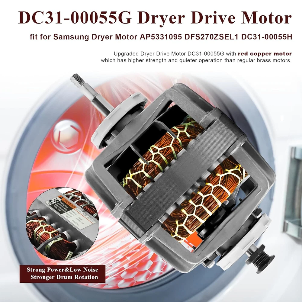 DFS270ZSEL1 Dryer Motor fit for Samsung AP5331095 Dryer Motor fit for Samsung DFS270ZSEL1 DC31-00055H DC31-00055G DC31-00055D fit for Samsung DV45K6200EZ DV328AEW DV40J300EW DVE50R5400V prime&swift Product Details Brand: prime&swift Model Name: DFS270ZSEL1 Dryer Motor fit for Samsung Dryer Motor DC31-00055G DC31-00055D DC31-00055H Speed: 1630 RPM Voltage: 120 Volts Horsepower: 0.33 hp Powerful Motor: DC31-00055G dryer drive motor made from superior-quality red copper motor. The thick red copper wires were tightly wrapped around on high silicon steel sheets providing strong power for powerful drum spinning,quieter operation Dryer Motor DFS270ZSEL1 fit for Samsung clothes dryer DV4 DV5 DV3 DVE DVG DV2 series like DV42H5200 DV45H6300 DV45H7000 DV42H5600 DV48J7770 DV42H5400 DV45K6500 DV45K6200 DV50K7500 DV50K8600 DV48H7400 DV330AEW DV350AER DV40J3000 DV42H5000 DV52J8700 Drive Motor DC31-00055G AP5331095 fit for Samsung: DV5451AEW DV220AEW DV405ETPA DV48J7700 DV5471AEP DV210AEW DV330AGB DV331AEW DV393ETPA DV405GTPA DV457EVGS DV457GVGS DV45K7600 DVE45M550 DVE60M990 DV330AEB Quieter Motor: DC31-00055G DFS270ZSEL1 dryer motor fit for Samsung DV42H5200 Steam Front Load Dryer;Dryer motor made of thick red copper wire motor which ensures a higher rotation efficiency, stable performance, and low operating noise Fix Iissues for Samsung dryer motor: dryer makes humming sound/noise,dryer has bad vibration and drum wouldn't turn,dryer would shut off after 5 - 10 seconds of running,dryer tumbles but no heat,dryer wouldn't tumble,dryer won't turn the drum Easy To Install: Disconnected all the power and wear work gloves;Remove the top panel,front panel,back panel then remove drum,Remove the motor clamps,Remove the air duct then the blower wheel,Disconnect wires,remove drive motor,Install new motor Important repair note: Fan blade bolt attached to the motor shaft uses reverse threads,Lefty=tighty; Make sure the motor locator tab is properly inserted into mounting bracket slot; 120V 60Hz 1630RPM 5.3A 1/3HP Part Function: DFS270ZSEL1 Dryer Motor fit for Samsung DFS270ZSE DC31-00055G AP5331095;Dryer drive motor used in clothes dryer and turns the drive belt that spins the dryer drum;DC31-00055H DC31-00055G DC31-00055D fit for SAMSUNG dv328aew/xaa dryer motor