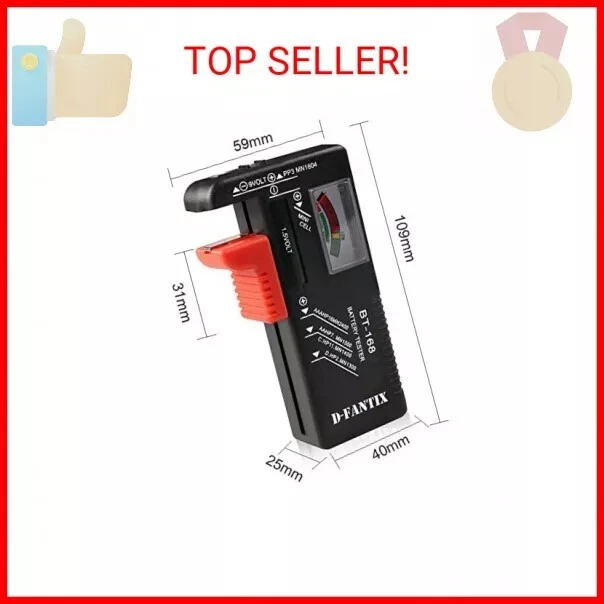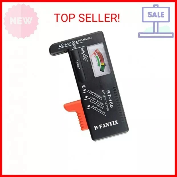 D-FantiX Battery Tester, Universal Battery Checker Small Battery Testers for AAA AA C D 9V 1.5V Button Cell Household Batteries Model BT-168 - SMALL & PRACTICAL - Simple but effective battery tester checker for home (BT-168) , compact size and lightweight,easy to carry - BATTERY TESTER FOR ALL BATTERIES - The universal battery tester works with standard and rechargeable household batteries: AA, AAA, C, D, 1.5V,9V and button type - REQUIRE NO BATTERY TO OPERATE - Easy-to-read ,the analog display needle moves on a color-coded, calibrated scale to quickly identify "good" (green), "low" (yellow), and "replace/recharge" (red) battery status. No batteries required.It is activated by the battery being checked - PERFECT FOR HOME USE - Great small battery tester can tell you if your battery is good, low, or needs to be replaced.A must buy for anyone who uses regular or rechargeable batteries on a regular basis - SAVE BATTERIES - You can simply test battery voltage to determine whether the capacity of the battery is low or high. It won't directly detect the battery capacity precisely. This will keep us from wasting perfectly good batteries by throwing out good ones