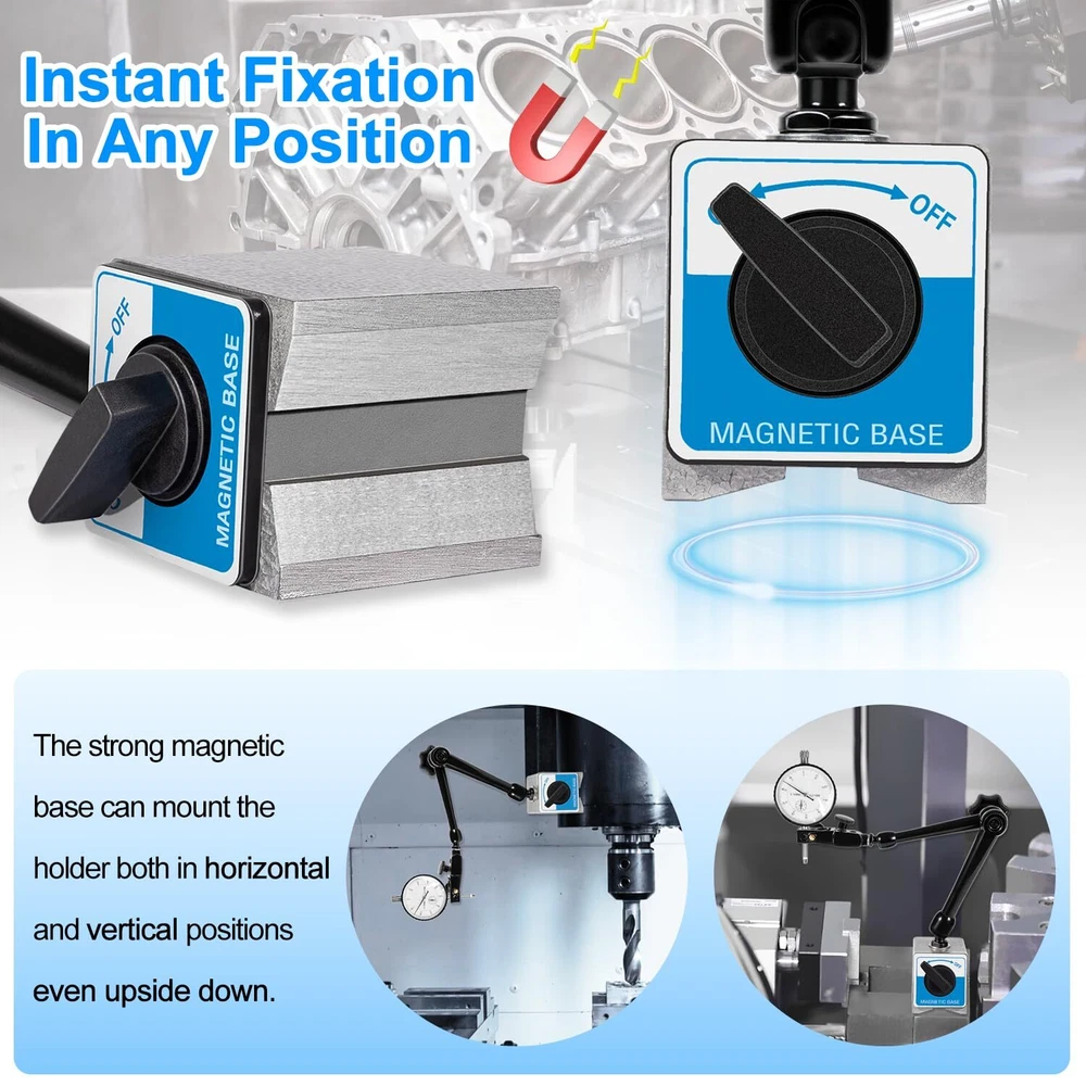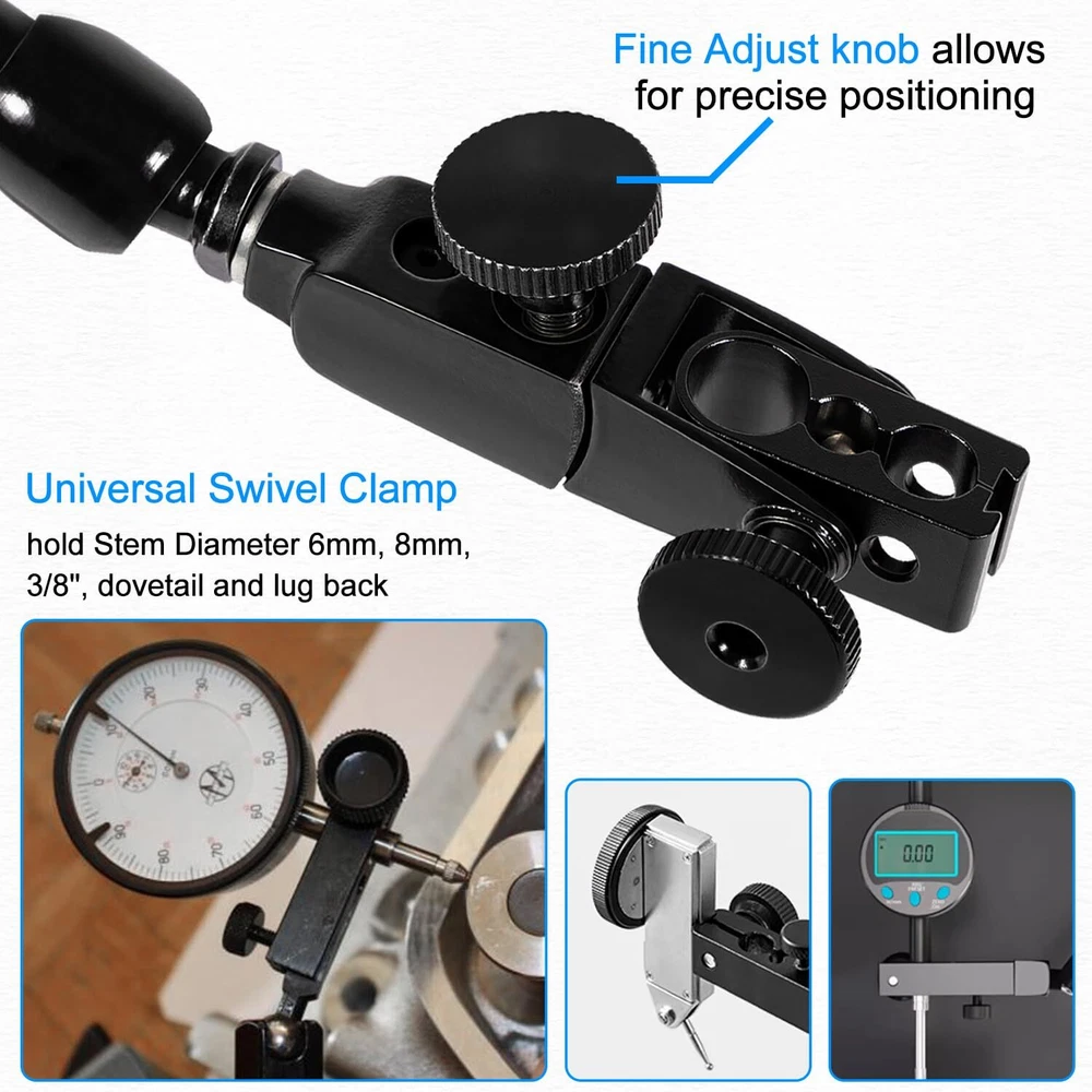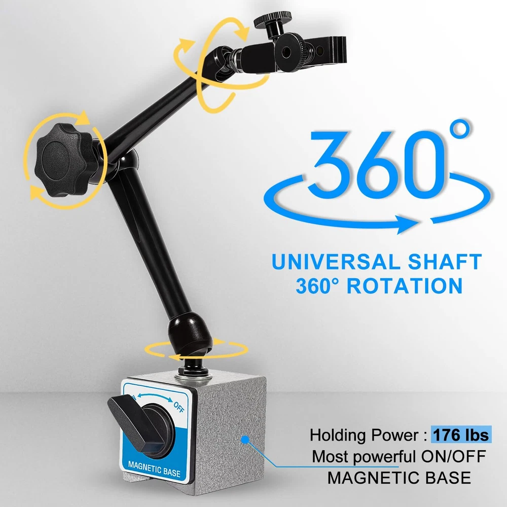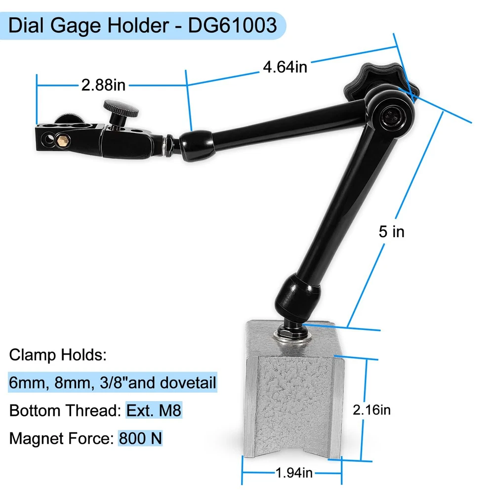 DG61003 Replacement Regular Duty Dial Gage Holder Mag Base w/Metal Fine Adjust & Universal Swivel Clamp - for Magnetic Digital Dial & Test Indicator Gauge 【Wide Application】 Compatible with Most Dial/Digital Indicators. Used in various applications such as 3D printer, lathe, woodworking, workshop, CNC machine, table saw, etc. 【Durable Construction】 Crafted from robust stainless steel, copper, plastic and magnet materials to withstand regular use in industrial environments. Simple setup and intuitive adjustments streamline the measurement process. 【Quick and Easy Set Up Gages】 Fine Adjust knob allows for precise positioning. Universal Swivel Clamp for hold Stem Diameter 6mm, 8mm, 3/8", dovetail and lug back, suitable for use with a wide range of instruments. Robust articulating arm system with central clamping mechanism, which helps you easily mount the holder at the right position with the dial gauge on top and provides ample reach and flexibility for various applications. 【Instant Fixation In Any Position】 Feature a powerful 176 lbs holding power with an on/off switch for convenient use. The strong magnetic base can mount the holder both in horizontal and vertical positions, even upside down. Ensures stable attachment to any ferrous metal surfaces, supporting the indicator for more accurate measurements. 360° magnetic holder options are perfect machining companions for when you need versatility and accuracy the most. CONTACT US: If you meet any problem after receiving our product, please feel free to contact us. We will try our best to solve your problem. SHIPPING POLICY: Orders will be ship out within 1-2 business days after payment has cleared. Orders from Saturdays, Sundays or holidays will process on next business day and will be ship within 24 hours. Please allow 10-30 days for international deliveries. Some shipments could take longer subject to your local customs authorities. RETURE & WARRANTY: 1 We accept 30 days return guarantee for all Items If you are unsatisfied with something you bought from us, you may send it back within 30 days of receipt, and we shall be happy to exchange or refund. 2 Leave a message note in returned box quoting your item(s) ID and buyer ID. 3 All returned products must be in their original condition and packaging. Unfortunately, if products have been assembled or modified, we cannot take them as returns. 4 It is important that we know when your return is expected. Please save your return tracking number or post receipt, and email it to us. We need this in case there are any issues during transit. 5 Refund will only be issued upon our receipt of the returned parcel. Please allow 2 working days for us to process with your return. ABOUT REPLY: If you have any questions, please feel free to email our service specialists 24 Hours a Day, 7 Days a Week, and we will reply you ASAP. If no response within 24 Hours, please check the spam of mail box or kindly re-send it to us. ABOUT FEEDBACK: Please contact us before leaving Netural or Negative feedback if you are not satisfied our service or products. Good communication is helpful for both of us to resolve any problems and issues. We work hard to make sure EVERY CUSTOMER 100% SATISFIED and resolve any problem for you and always leave positive feedback to all our customers. If you are satisfied with our service, please leave FOUR 5-Detailed Selling Rating (DSR). Thanks!