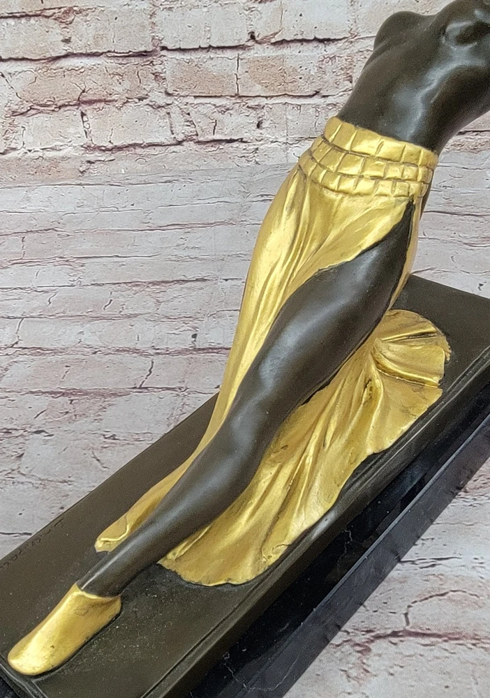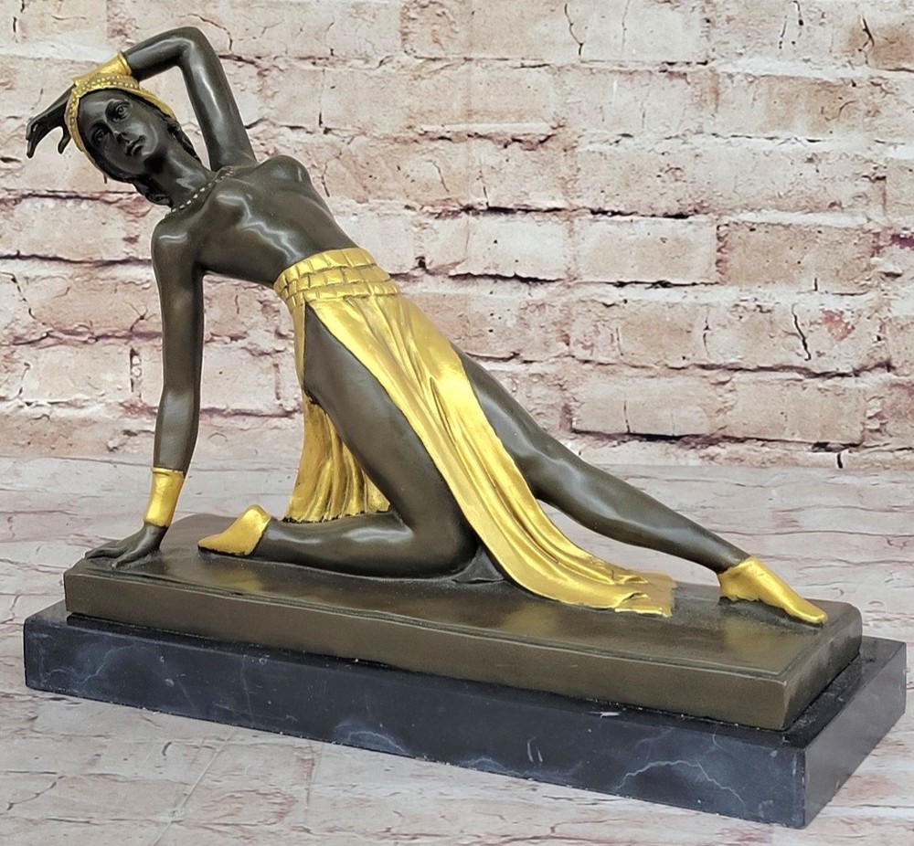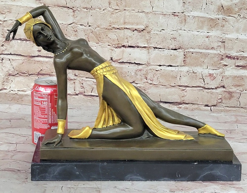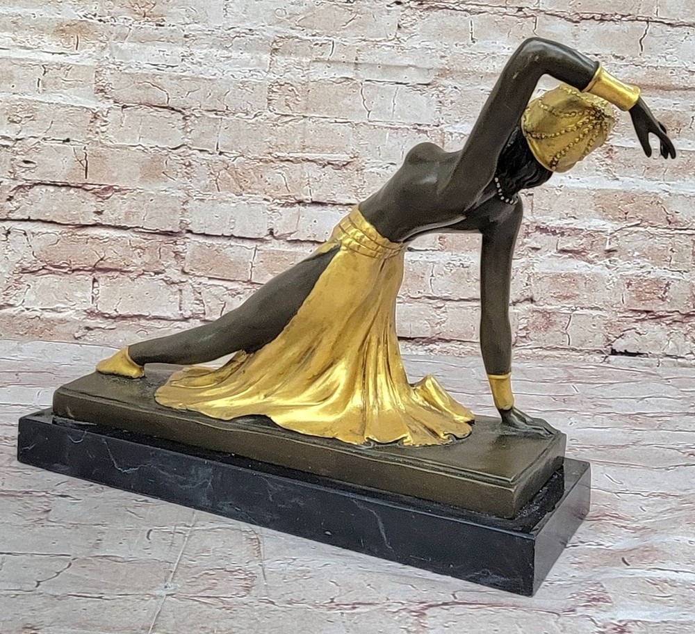 Condition : This sculpture is in perfect condition. Bronze Dimensions with Marble Base: Height 11" x Width 13" Marble Dimensions:13" X 5" Height without base:10" Weight:15 LBS Inventory:34EP175J7443 The Grace and Agility of "The Exotic Dancer" "The Exotic Dancer" is a mesmerizing bronze sculpture that captures the elegance and flexibility of a performer from the Ballet Russe, one of Chiparus' most renowned works. In this striking piece, the dancer is depicted in a graceful yet dynamic pose, kneeling on one knee while extending her other leg straight out in front of her. Her body leans back, supported by one arm, while the other arm curves gracefully around her head, showcasing the fluidity and agility of her movement. The elongated form of her pose accentuates the elegance of her figure, inviting admiration from all who gaze upon her. Intricate Detailing and Artistic Craftsmanship Every detail of the dancer's attire is meticulously rendered, from her skin-tight leotard that clings to her upper body to the flowing skirt that elegantly reveals her thighs through its slits. The gold belt cinches her waist, adding a touch of opulence to her ensemble, while gold beads and bangles adorn her neck and wrists, further enhancing her exotic appearance. The headpiece, adorned with intricate gold beads, completes the ensemble, harmonizing perfectly with her red dress. The careful attention to these details highlights the artistry of Chiparus and his ability to bring the vitality and energy of a ballet performance to life in bronze. A Masterpiece of Timeless Beauty Crafted using the ancient lost wax method, this 100% bronze sculpture is a testament to the timeless beauty and enduring appeal of Chiparus' work. The rich gold and brown patina adds depth and dimension to the piece, enhancing its visual impact. Signed by the artist, D.H. Chiparus, "The Exotic Dancer" is not just a sculpture; it is a celebration of the grace, agility, and elegance of the ballet, frozen in time for all to admire. This piece is a true collector's item, perfect for anyone who appreciates the intersection of art, dance, and history. SIGNED CHIPARUS EXOTIC DANCER ART DECO BRONZE SCULPTURE HOME DECORATION FIGURINE Video will open in a new window Using the eBay App? Paste link into a browser window: [isdntekvideo]