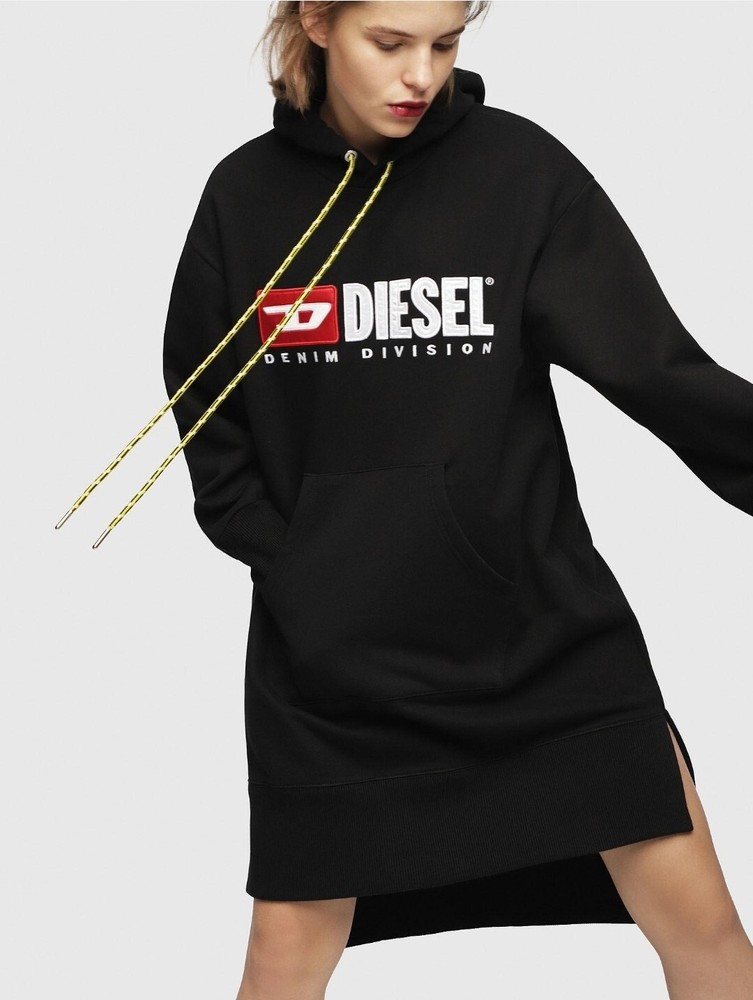 Elevate your casual wardrobe with this stylish Diesel hoodie dress. The perfect combination of comfort and fashion, this oversized jumper features a hooded neckline, long sleeves and an embroidered logo accent. Made from high-quality cotton material, it's machine washable for easy care. This black hoodie dress is ideal for the colder seasons, with its autumn, winter and spring features. Perfect for a relaxed fit, it's great for casual occasions and can be personalised with no instructions. Whether you're out for a casual meet up or just lounging at home, this hoodie dress is the perfect addition to your wardrobe.