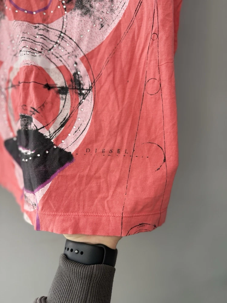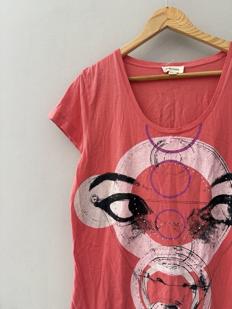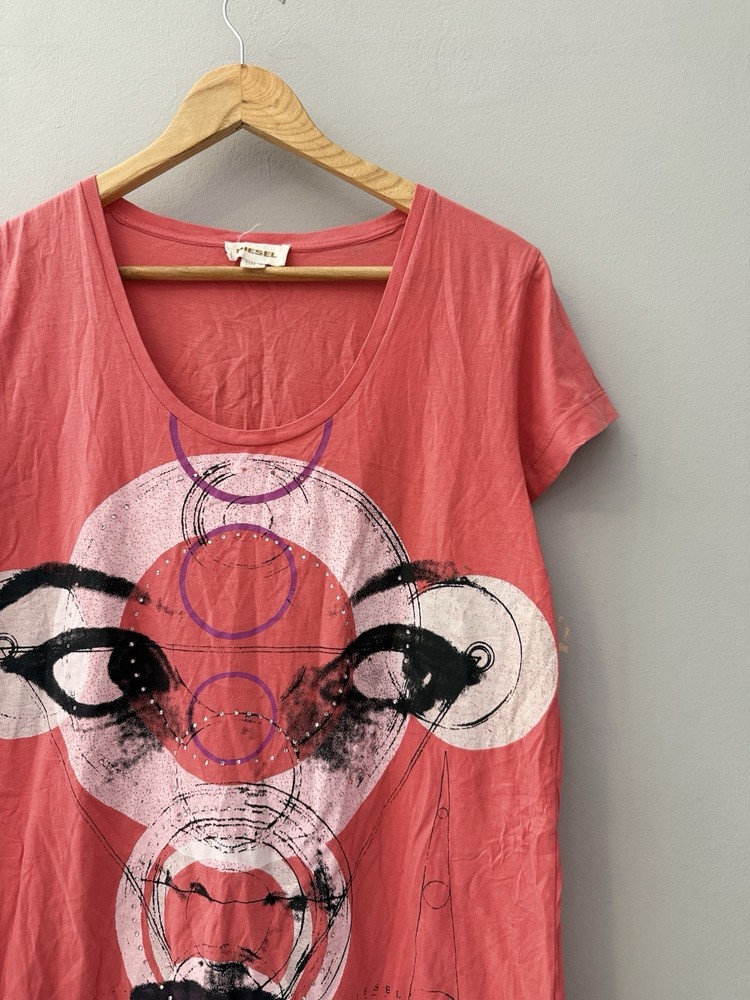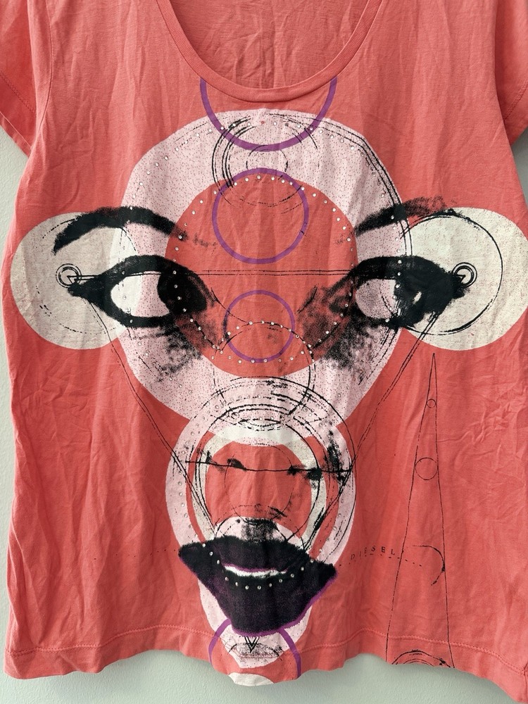 Authentic Vintage Diesel Graphic Tee Add a touch of avant-garde to your wardrobe with this unique Diesel t-shirt. Featuring a striking abstract face graphic with geometric elements and subtle rhinestone detailing, this piece captures the iconic edgy aesthetic of the brand.