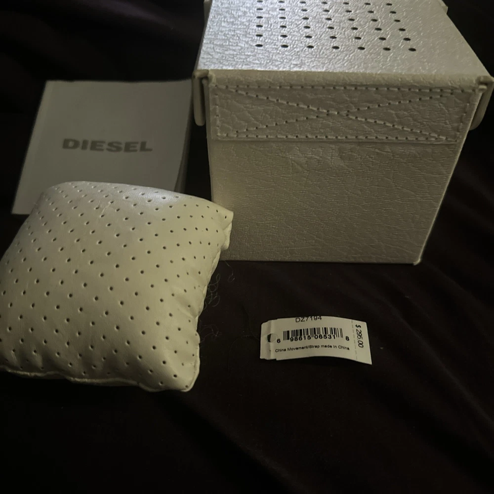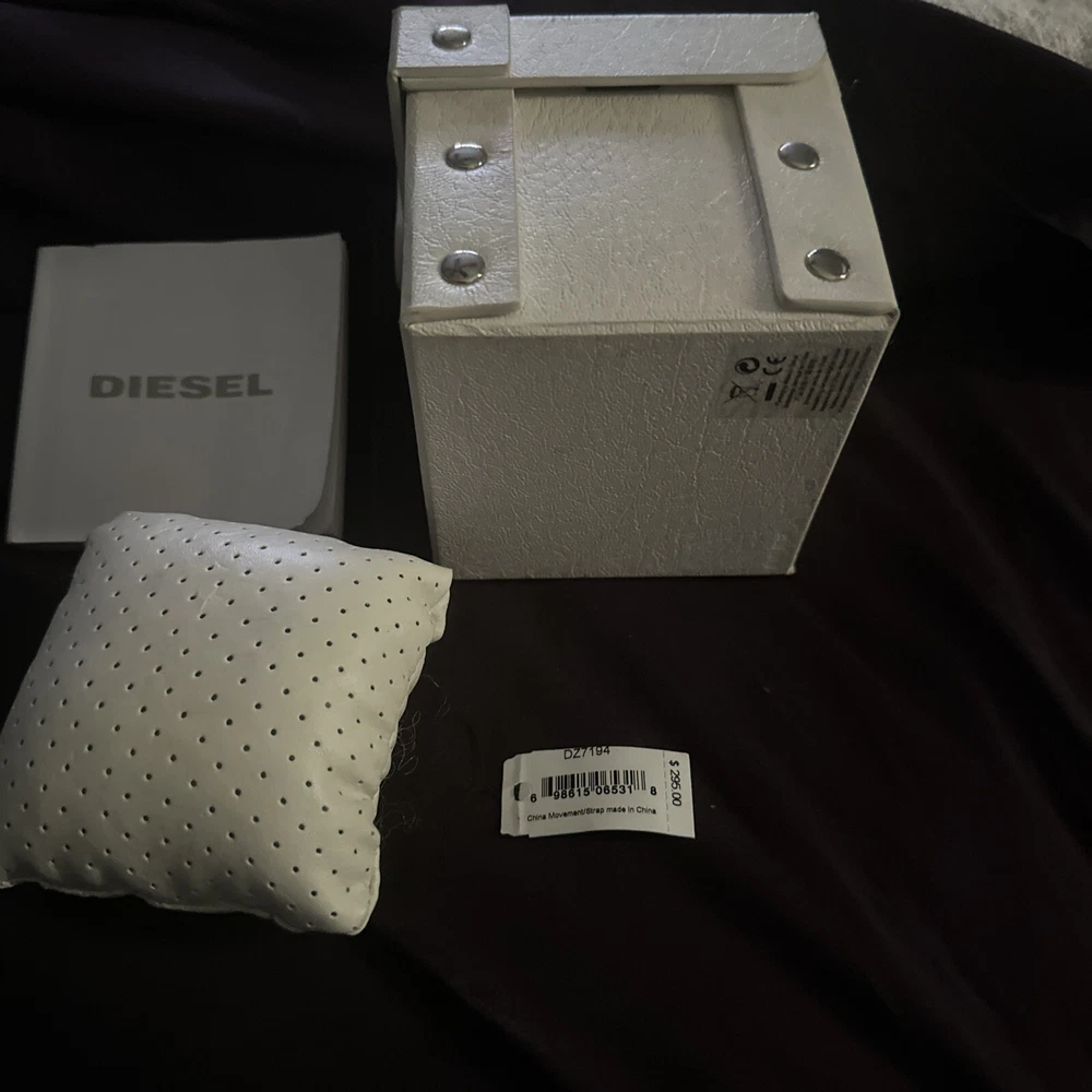This storage box with pillow from Diesel is perfect for storing your favorite watches. The box can hold up to 3 watches and comes in a stylish white color. The faux leather, metal, and fabric materials make this box a durable and long-lasting addition to your collection. The box is perfect for those who want to keep their watches safe and organized. The pillow adds a touch of comfort to the box, making it a great addition to any room decor. This storage box with pillow is a must-have for any watch enthusiast. Box only…. No watch Signs wear view pictures of inside area etc has some faded areas on side stains inside