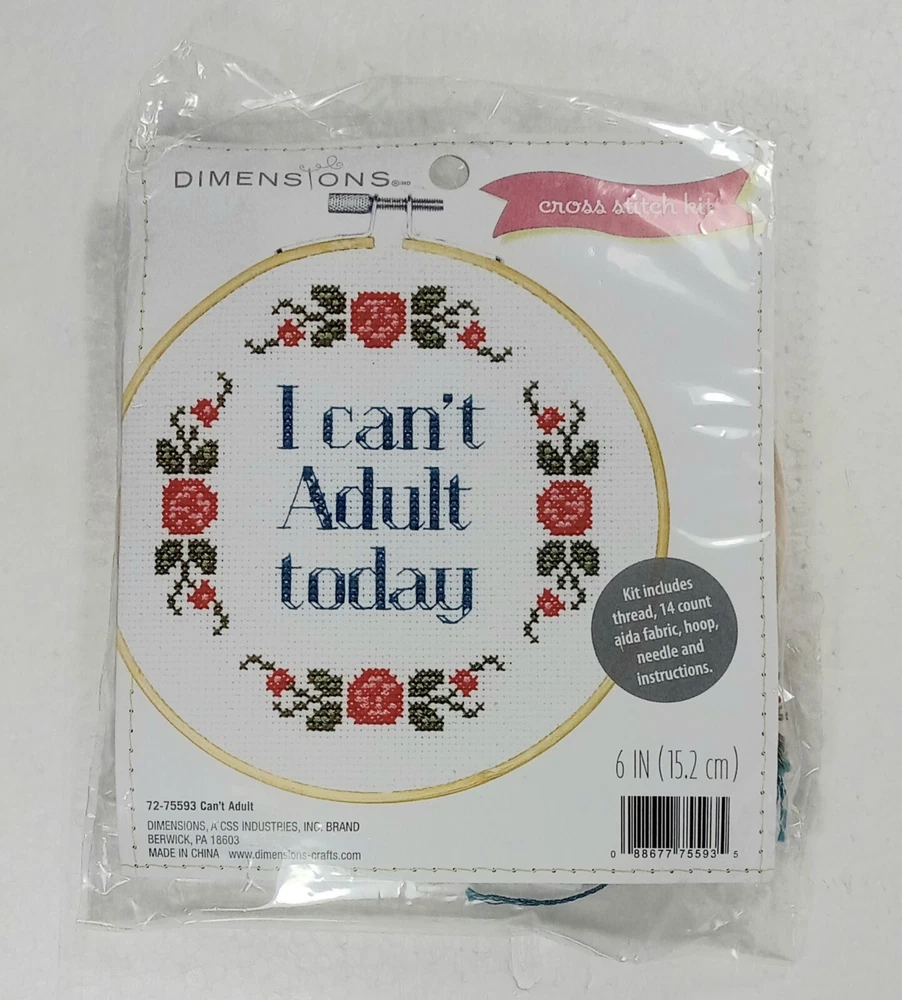 Express your creativity with this DIMENSIONS Cross Stitch Kit featuring the phrase "I CAN'T ADULT" in a small, round hoop included. This kit has everything you need to create a beautiful cross-stitch masterpiece. The brand is well-known for its high-quality products, and this kit is no exception. The hoop is bundled with the kit, making it a complete set for you to start stitching right away. The theme of the kit is words and phrases, and it features a style of small cross-stitching. This kit is perfect for those who love to create and express their unique style. Make a statement with this DIMENSIONS Cross Stitch Kit and create a beautiful piece of art that will last a lifetime.