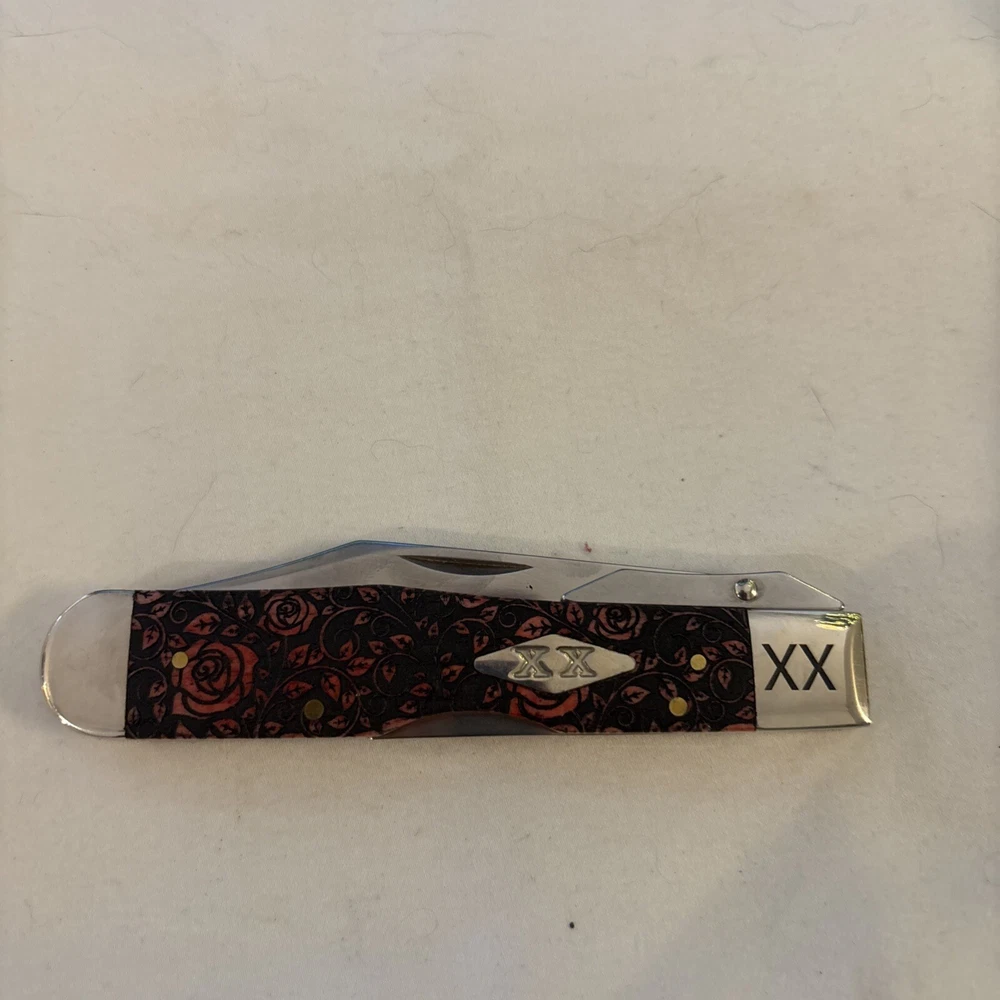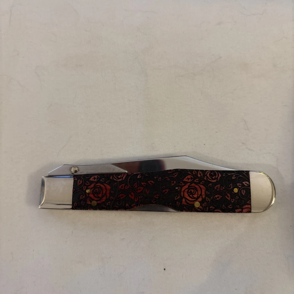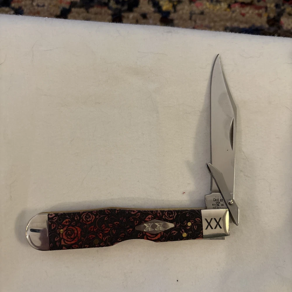 This Case XX pocketknife is a unique addition to any collection. The blade range of 2.76 - 4in. and clip point blade type make it a versatile tool for everyday use. The ambidextrous opening mechanism and mid lock lock type ensure safety and ease of use. The knife features a beautiful red rose handle made of bone and a plain edge blade. It is an original item from the United States and part of the SFO 1 Of 500 product line. The knife comes with a California Prop 65 Warning, making it a compliant product.