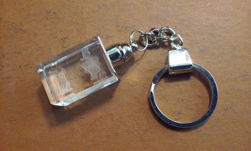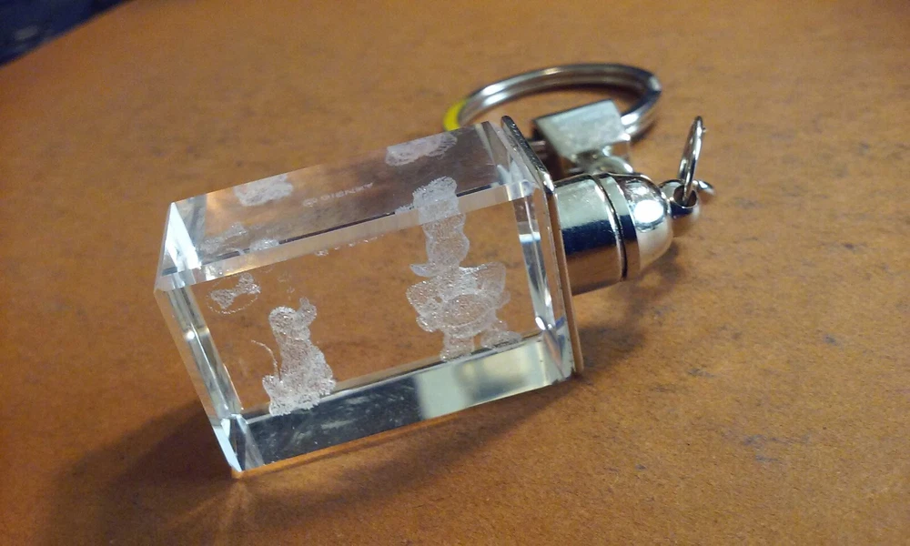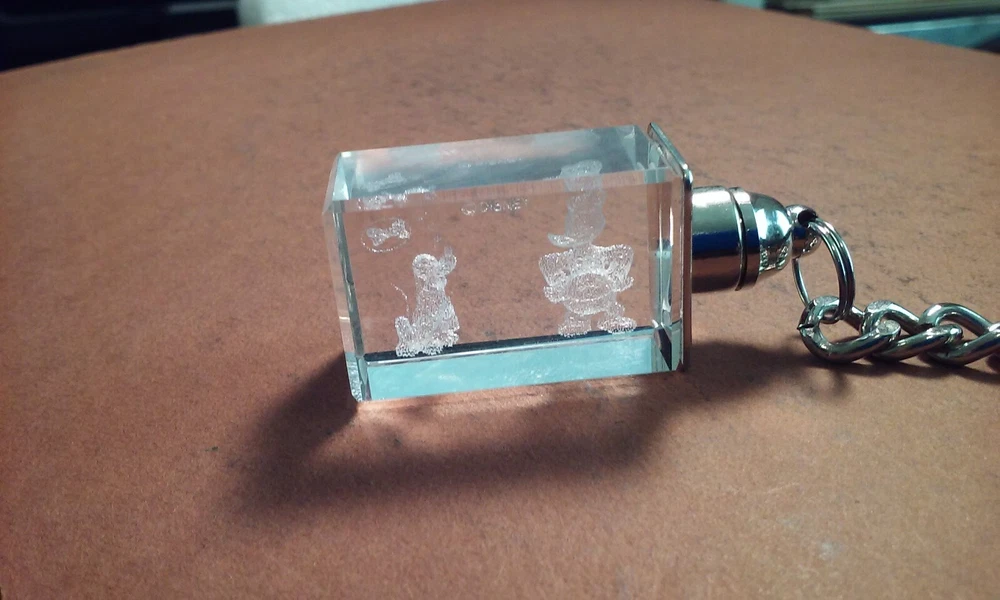 DISNEY DONALD DUCK & Dog Bolivar Laser Etched Image Clear Glass Cube Keychain