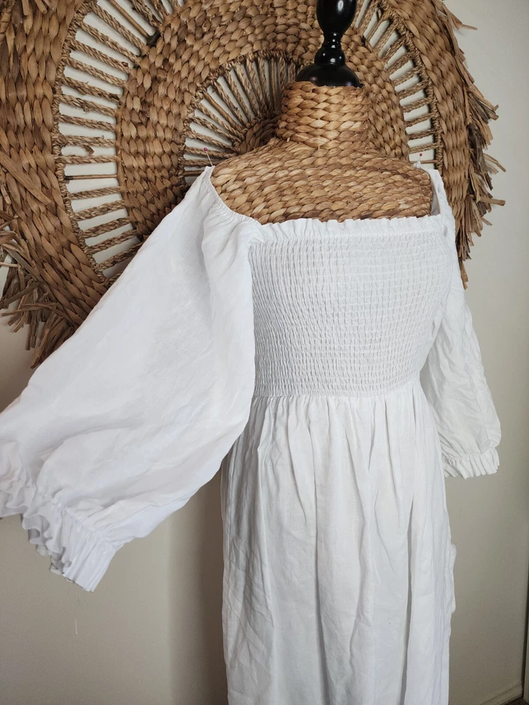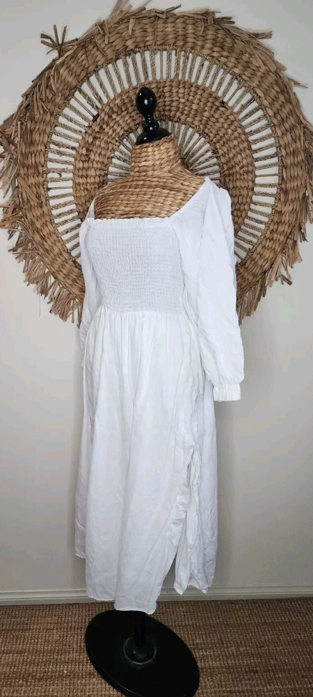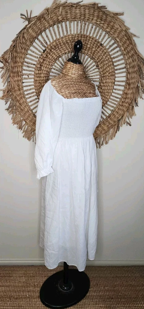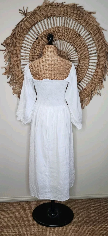 DISSH White Puff Sleeve Linen Dress Size 14 Classic Bohemian Gypsy Measurements: Bust not stretched out 34cm Bust stretched out 55cm Sleeve length 53cm Length 103cm. Please use photos for additional information and a guide as to how to rate them… Colour may vary from photo to photo… Please keep in mind that you are purchasing an item that is second-hand. Most items will show some sign of cosmetic wear throughout the item/garment. Sizes may vary so please read measurements. We do our best to show an accurate representation of the condition in the photos. Sent with Australia Post Standard Parcel in a small/medium or large satchel parcel type bag with a tracking number. All items are packaged and wrapped with extreme care, we use bubble wrapping and cardboard where necessary, and satchels and boxes to deliver clothing and other items. All garments are wrapped in tissue paper. We will recycle as much as we can in regards to packaging. I'm happy to combine purchases when applicable… Express postage upgrade $3