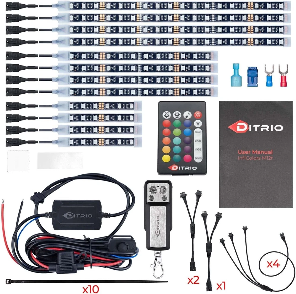 Quality & Reliability as Priorities: LED strip kits for motorcycles have difficult working conditions – fluctuating voltages, instantaneous higher currents etc., this LED strip kit focuses on how to make it work and last Maximum Brightness: LEDs with gold bonding wires – 30% higher electrical conductivity, 3.55% more light than the cost-effective material copper; 60 LEDs per meter, up to 1,000 Lumens per meter Bigger Capacities for Brighter Bikes: 3 x 3A big MOSFETs, wires of AWG 22 & 24, ensuring strips more than enough power supply even you double the strips for a bright “Christmas tree” 2 Additional Blinking Brake Lighting Styles: Besides the default solid red light as an additional brake signal, M12r now comes with 2 blinking styles, available via the 24-key remote Music Mode: An independent microphone in the control box, gold-plated pins, a 60X sensitivity, beautifully follows the rhythms of your music