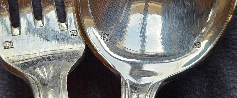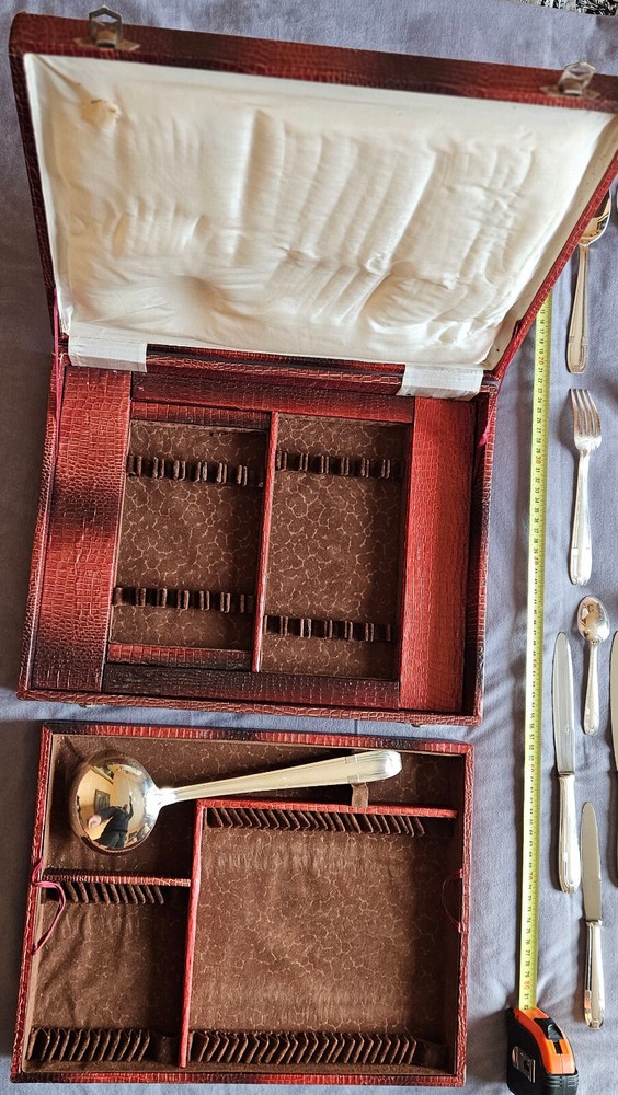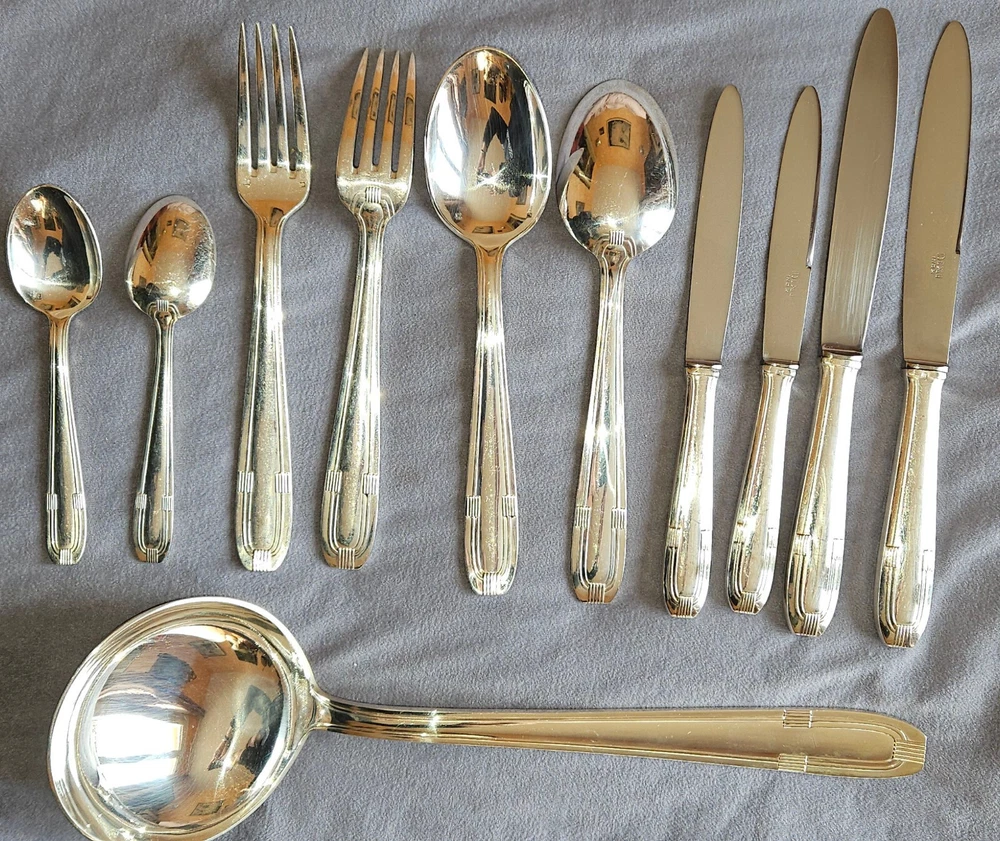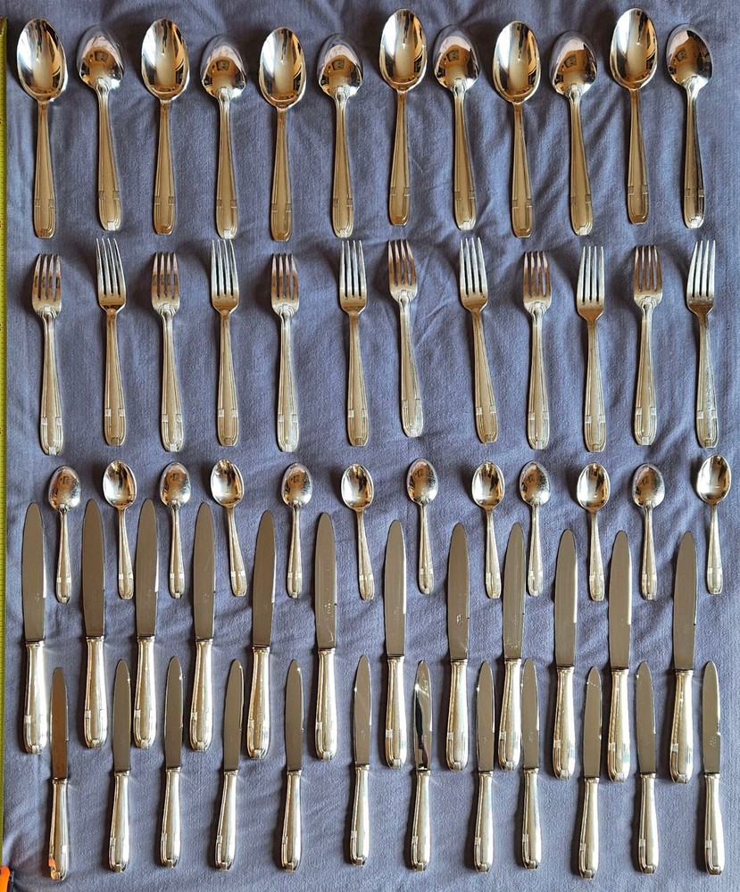Tous mes objets sont soit des objets anciens de brocante ou antiquités, soit des objets d’occasion plus ou moins récents. A ce titre, ils ont des marques du temps et d’usage que j’essaye de signaler au mieux en mettant plusieurs photos et en décrivant l’objet. Je vous demande donc par avance de bien lire le descriptif et regarder les photos qui font partie de la description des objets. Si vous avez besoin d’informations ou de photos complémentaires, n’hésitez pas à m’écrire suffisamment tôt avant la fin de la vente pour demander des précisions , en me laissant votre adresse e-mail pour la réponse et l’envoi de photos complémentaires. Objet N° : 9683 Maison d'Orfèvrerie DIXI : Ménagère en métal argenté composée de 61 pièces d'un très élégant modèle art déco présentée dans son coffret d'origine. Bon état d’argenture avec micro-rayures habituelles et normales sur du métal argenté qui a été utilisé, cette ménagère a été très bien entretenue. Composition de la ménagère : * 12 Couteaux de Table : Poinçon " 18 G - DIXI " Lames marquées " DIXI INOX " Longueur : 24,5 cm environ. Poids d'1 : +/- 95 grammes environ. * 12 Couteaux à fromage : Poinçon " 12 G - DIXI " Lames marquées " DIXI INOX " Longueur : 20,5 cm environ. Poids d'1 : +/- 54 grammes environ. * 12 Fourchettes de Table : Poinçons " COUVERTS DIXI " et " 100 G - DIXI " Longueur : 19,8 cm environ. Poids d'1 : +/- 82 grammes environ. * 12 Cuillères à soupe : Poinçons " COUVERTS DIXI " et " 100 G - DIXI " Longueur : 20,2 cm environ. Poids d'1 : +/- 90 grammes environ. * 12 Cuillères à café / dessert : Poinçons " COUVERTS DIXI " et " 24 G - DIXI " Longueur : 13,5 cm environ. Poids d'1 : +/- 33 grammes environ. * 1 Louche à potage : Poinçon " 12 G - DIXI " Longueur : 31,5 cm environ. Poids : 278 grammes environ. Poids Total Coffret garni : +/- 6.850 grammes environ. Un envoi de plusieurs objets groupés dans un même colis est envisageable dans le monde entier si le montant de la commande est suffisamment important et si le colis est réalisable (selon poids et dimensions), n’hésitez pas à me contacter si vous désirez acheter plusieurs lots en m’indiquant les références pour une étude personnalisée. N’hésitez pas à consulter ma boutique et tous mes objets en vente !