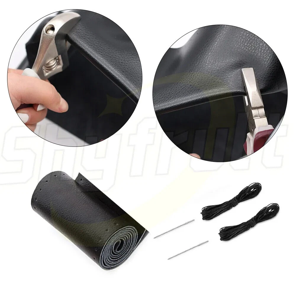 DIY 15" Leather-Car Steering Wheel-Cover with Needles Thread Stitch Wrap-