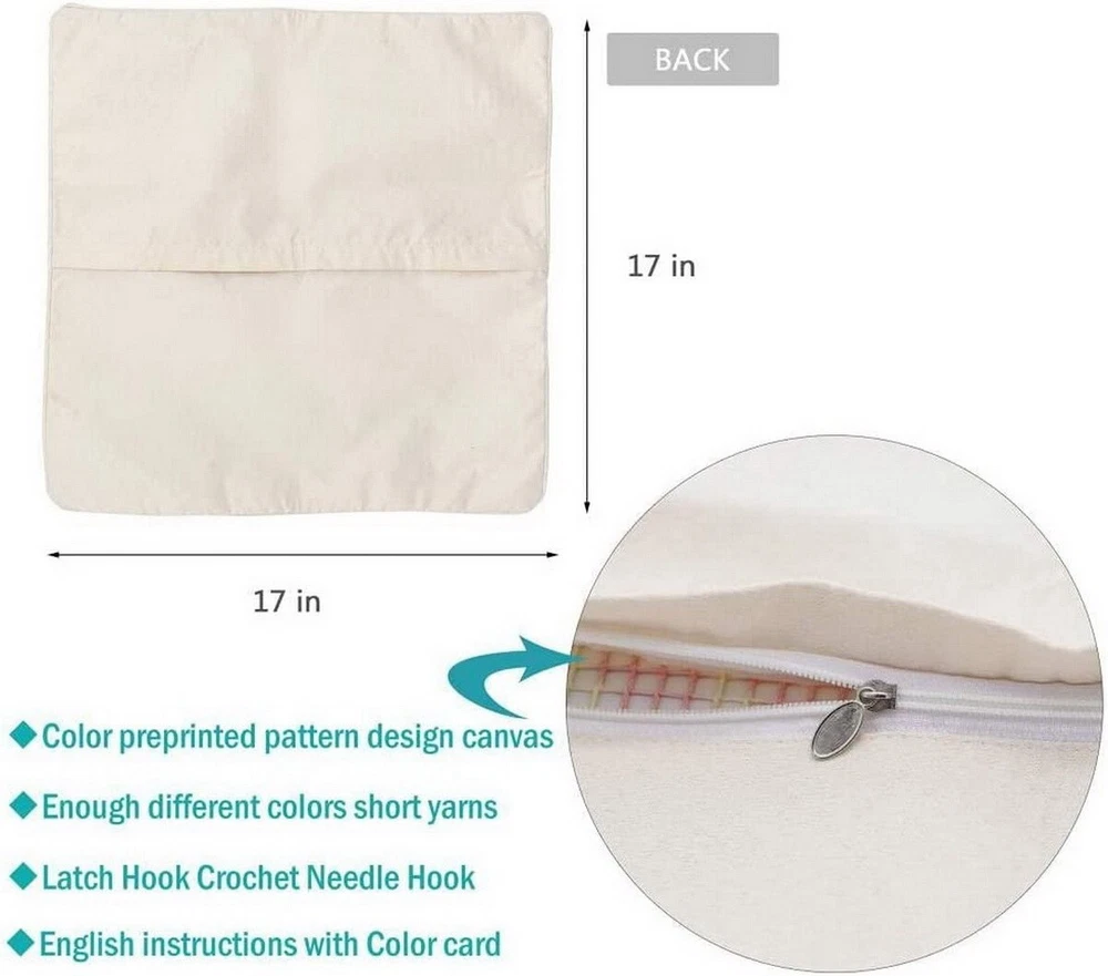 Hook Kits for Adults and Kids: This Pillow Cover size is 16.5*16.5 inches Kit Includes: high-quality printed canvas, one latch hook craft tool, pre-cut yarn pieces, detailed instructions and color printing, suitable for children and beginners.This kit contains a 50% polyester/50% cotton canvas Easy to Star:The color-coded canvas makes a easy start and ensures that you put it down and pick it up again .The possibilities are astounding Family Activity: Latch hook kits is a simple and easy to learn handicraft kit, you can invite anyone to do handicrafts together, suitable for children over 8 years old or adults. Enjoy the process of handcrafting together, find inner peace, relax body and mind, and improve hands-on skills Home decoration: The furry pillowcase is suitable for placing anywhere in the home, decorating sofas and seats, adding a unique color to your home