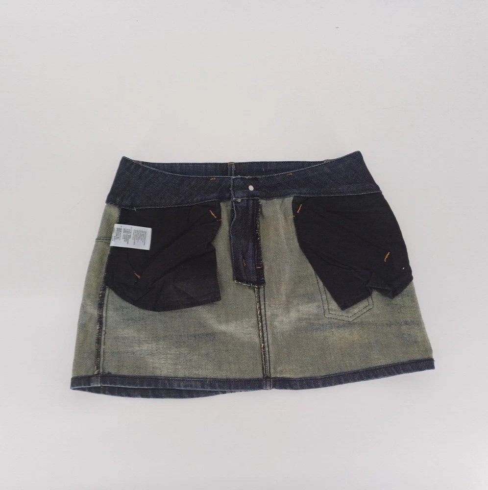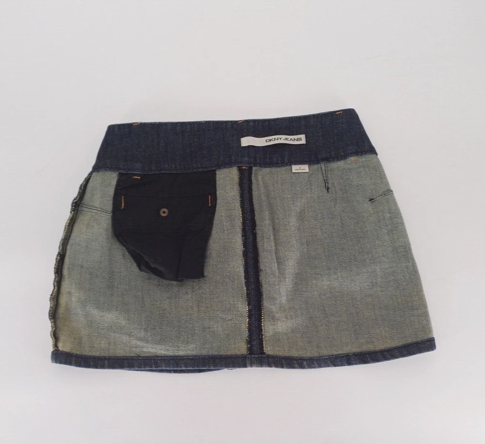 DKNY Jeans Denim Mini Skirt Women's UK Size 6. A dark blue mini skirt with zipper pockets on the front and a pocket on the back. It’s in good condition however there is some discolouration on the inside of the skirt and a light mark on the back. Measurements: Waist size: 30 inch Length: 13.5 inch