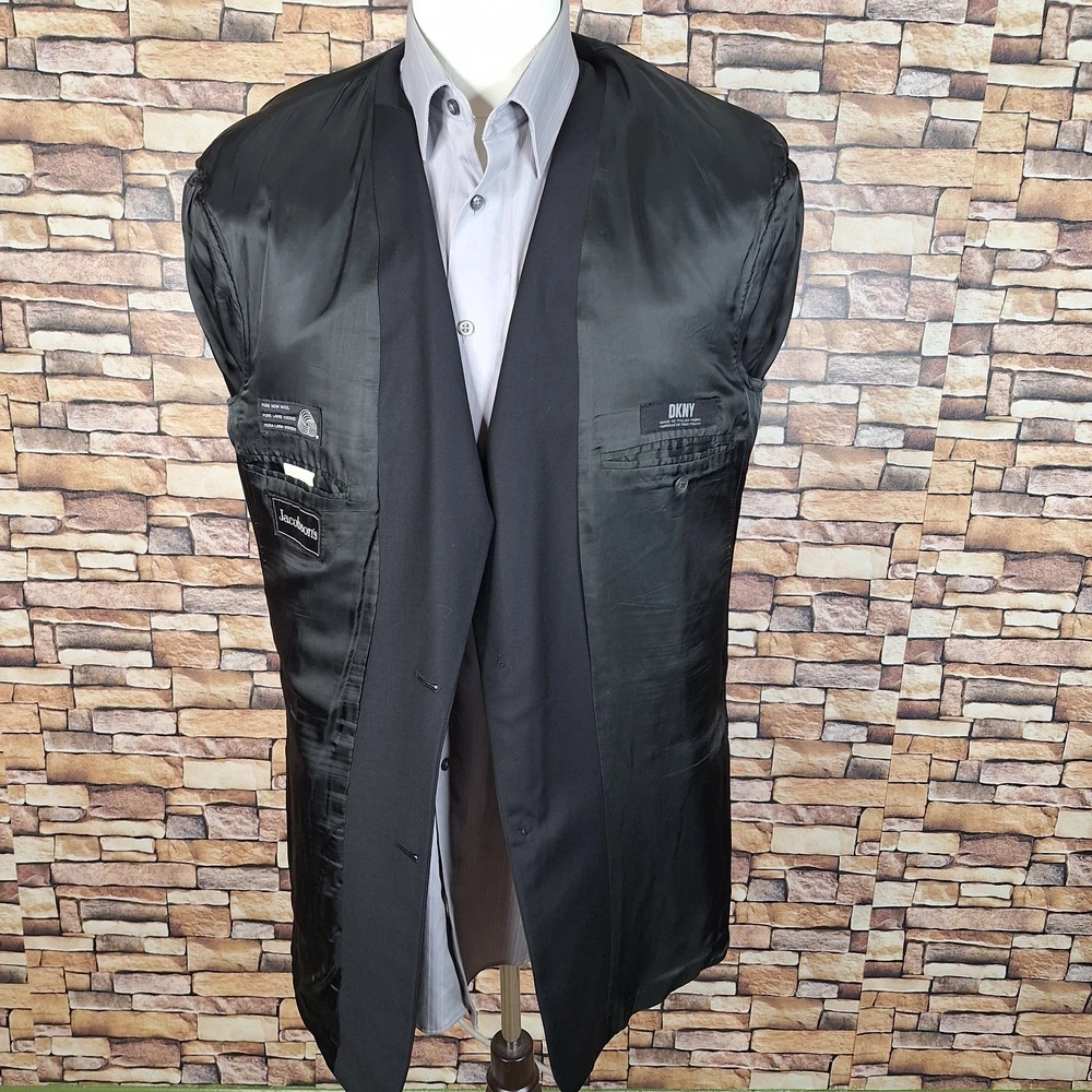 DKNY Blazer Jacket Mens 42R Black Ventless Italian Wool Quality used condition. Please check out the measurements before buying to ensure a perfect fit. Shirt Size on Label 42R/L EST Shoulder- Hem 32.50'' Shoulder- Shoulder 20.00'' Shoulder- Wrist 25.00'' Armpit- Armpit 22.00'' Top button 20.00'' Everything ships within a day. Spot cleaned according to manufacturer's recommendations. Has a chance of wrinkling in the mail. Feel free to message me with any questions. Thank you very much. 4/3/25