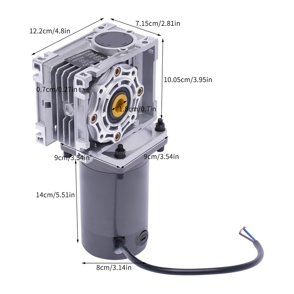 Key Features Build to Last: Our product uses high-quality cast aluminum and hollow steel tube material and is characterized by heat resistance, wear resistance, high quality, and long service life through die-casting and heat treatment. Powerful Motor: It adopts a single-phase pure copper motor, having the advantages of low calorific value, low loss, low noise, fast heat dissipation, and high return accuracy. Stable Operation: Both ends of the rotor are equipped with ball bearings, which can reduce friction and temperature during use to ensure stable operation. High Safety: The slow start function can effectively avoid current overshoot and protect the motor. Self-locking Function: With a self-locking function (clockwise/counterclockwise self-locking), the output shaft s DM09 Worm Gear Reducer Gearbox Electric RV Gear Motor High Torque 120W DC24V Key Features Build to Last: Our product uses high-quality cast aluminum and hollow steel tube material and is characterized by heat resistance , wear resistance , high quality, and long service life through die-casting and heat treatment. Powerful Motor : It adopts a single-phase pure copper motor, having the advantages of low calorific value, low loss, low noise, fast heat dissipation, and high return accuracy. Stable Operation: Both ends of the rotor are equipped with ball bearings, which can reduce friction and temperature during use to ensure stable operation. High Safety: The slow start function can effectively avoid current overshoot and protect the motor. Self-locking Function : With a self-locking function (clockwise/counterclockwise self-locking), the output shaft should not move even when the motor is power-off. High Flexibility: It has a reversing function that is flexible with normally open and closed control systems. Gapless Structure: Its gapless structure means free maintenance that is hermetically sealed. And it prevents the lubricant from easily losing, going bad, and being exchanged. Speed Adjustable : You can match it with a speed controller (not included) to adjust different speeds according to different products to achieve the desired effect. Flexible Installation: This product has been assembled when you receive it. And you can decide the installation place of this gear motor. Protective Package: To prevent the product from being damaged and bumped during transportation, we packed it with foam boxes and bubble pads to protect your products to the maximum extent possible. Buy with Confidence: We have been working hard to provide better service and quality for our customers, which is our goal. If there is any problem with our products, please contact us in time. Details Power Cable: The power cable uses pure copper coils, featuring good conductivity and a large current carrying capacity. Cap: The yellow cap can effectively protect the output bore when not in use. After removing it, you can insert the shaft in the hole. Application It is widely used in automatic barbecue/mixing/doors/windows, conveyor belts, conveyors, feeders, calender, extruders, peeling machines, blenders, cargo lifts, packaging machines, textile/printing/food machinery, vending machines, office/medical equipment, etc. Specifications Model: DM09 Gearbox: NLRV-040 Color: Gray Material: Cast Aluminum, Hollow Steel Tube Processes: Die-casting, Heat Treatment Shape: Square, Round Feature: Portable Type: DC Motor Gearbox Type: Worm Gearbox Motor: Pure Copper Motor Noise: About 50-60db Output Type: Hollow Bore Torque: 3.66kg/cm Voltage: DC 24V Power: 120W Speed: 1800RPM AMP: 6.8A Ratio: 1:50 (50K) Input/Output Flange Size: 9*9cm/3.5*3.5inch Output Bore Diameter: 18mm/0.7inch Installation Hole: 7mm/0.27inch Gear Motor Size: 9*8*14cm/3.5*3.2*5.5inch Connect Interface Size: 9*9cm/3.5*3.5inch Package Size: 30*14.5*10cm/11.8*5.7*3.9inch Net Weight: 5kg/lbs Gross Weight: 5.5kg/lbs Package Included 1* 120W Gear Motor Notes It is not suitable for positioning applications. Please note that the product does not include a speed controller. Based on the industrial standard, to meet the different needs of customers, our motor does not include a power cord. You need to purchase a power cord to connect. Please do not plug&unplug the power cable when the power is on. Please do not knock or beat the machine. The gear ratios available for this gearbox are: 10:1, 15:1, 20:1, 25:1, 30:1, 40:1, 50:1, 60:1, 80:1 and 100:1. The motor can run for a long time within the safe speed regulation range. The safety speed range of a small load: is 50% of full speed-full speed; The safety speed range of a large load: is 70% of full speed-full speed. Please allow the slight color difference caused by the shooting light and 1-3cm error due to manual measurement, and make sure you do not mind before you order. Payment Delivery details Terms of sales About us Contact us Payment We accept ebay payment 。 Fees such as import duties, taxes are not included in the item price or shipping costs. These charges are the buyer's responsibility. Delivery details Shipping: 2-9 working days to: USA Terms of sales We maintain high standards of excellence and strive for hundred percent customer satisfaction. Feedback is very important to us. We hope that you contact us immediately before you give neutral or negative feedback, so that we can address your concerns. It is impossible to address issues if we do not know about them! About us Your satis faction is our ultimate goal. We work hard to earn your trust and future business. Our certified technicians have tested each item before shipping. The unit comes with 1 year limited warranty on all manufacturing defects. a) If you receive a defective item, you may return it or ask for a discount. Please contact us within 14 days after you receive the package. b) What you returned must be intact and in its original packaging as re? u. Customer is responsible for shipping costs of the returned item. c) We will cover the cost of shipping back t with the shipping rate indic