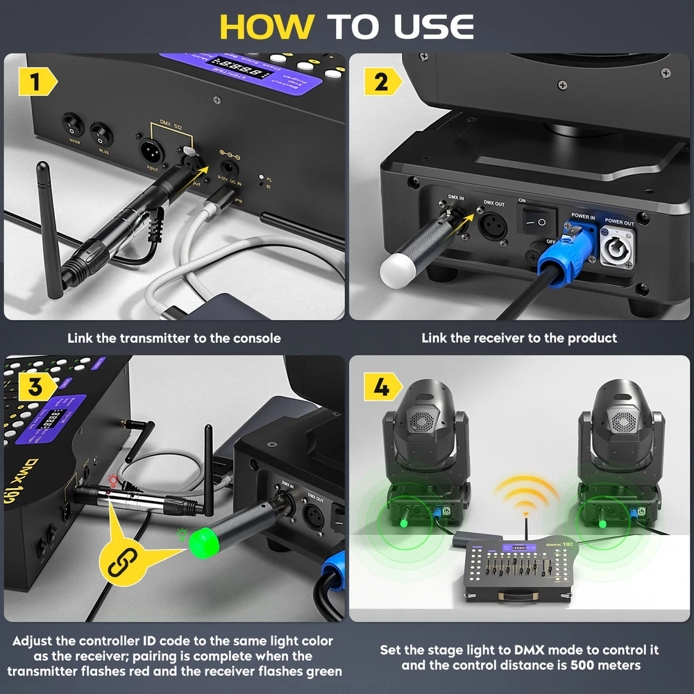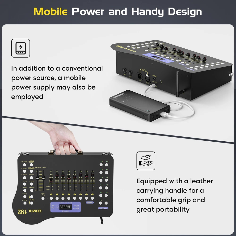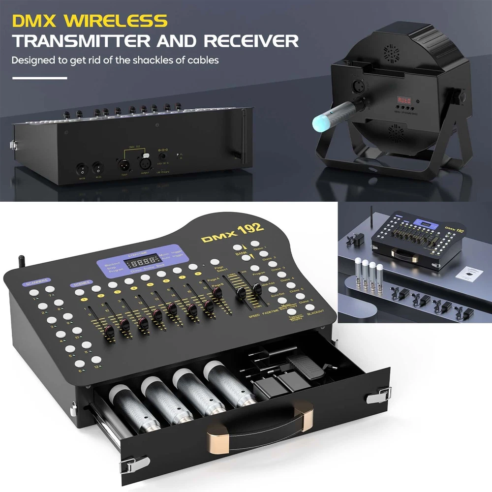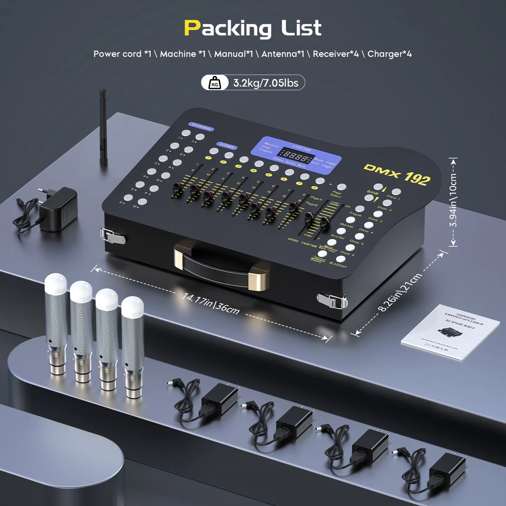 Description: This item is a standard universal DMX 512 controller, controlling up to 192 DMX channels. It is specially designed to control multiple light effects at once effortlessly. This is the perfect balance among cost, ease of use and remarkable features. It is perfect for those who really want to take advantage of their lighting and effects.Great for DJ's, school concerts, or any regular party. With a DMX controller you'll be able to customise lighting effects to perfectly suit your parties atmosphere and sound. Specifications: Color:black Material:stainless Wireless communication distance: 300 meters (open distance) CPU:32-bit ARM core Operating frequency band:2.400-2.4835GHZ Maximum transmit power:23dbm Receiving sensitivity:-94dbm Power input:9V1A Signal source:2.4g 192 DMX channels Auto mode program controlled by speed and fade lime sliders Fade time/speed Blackout master button Reversible DMX channels allows fixture to react opposite to others in a chase Manual override allows you to grab any fixture on the fly Built in microphone for music triggering ; Midi control over banks, chase, and blackout DMX polarity selector Power adapter input: AC 100-240V Power adapter output: DC 12V 1A Features: 192 DMX channels. 12 Scanners of 16 channels each. 30 Banks of 8 programmable scenes. 6 Programmable chases of 240 scenes. 8 Sliders for manual control of channels. 2 fader control. Fade time/speed. Blackout master button. Built in microphone for music triggering. DMX polarity selector. Package List: Power cord *1 Machine *1 Manual*1 Antenna*1 Built-in battery charging model receiver*4 On Jan 16, 2025 at 05:27:09 PST, seller added the following information: