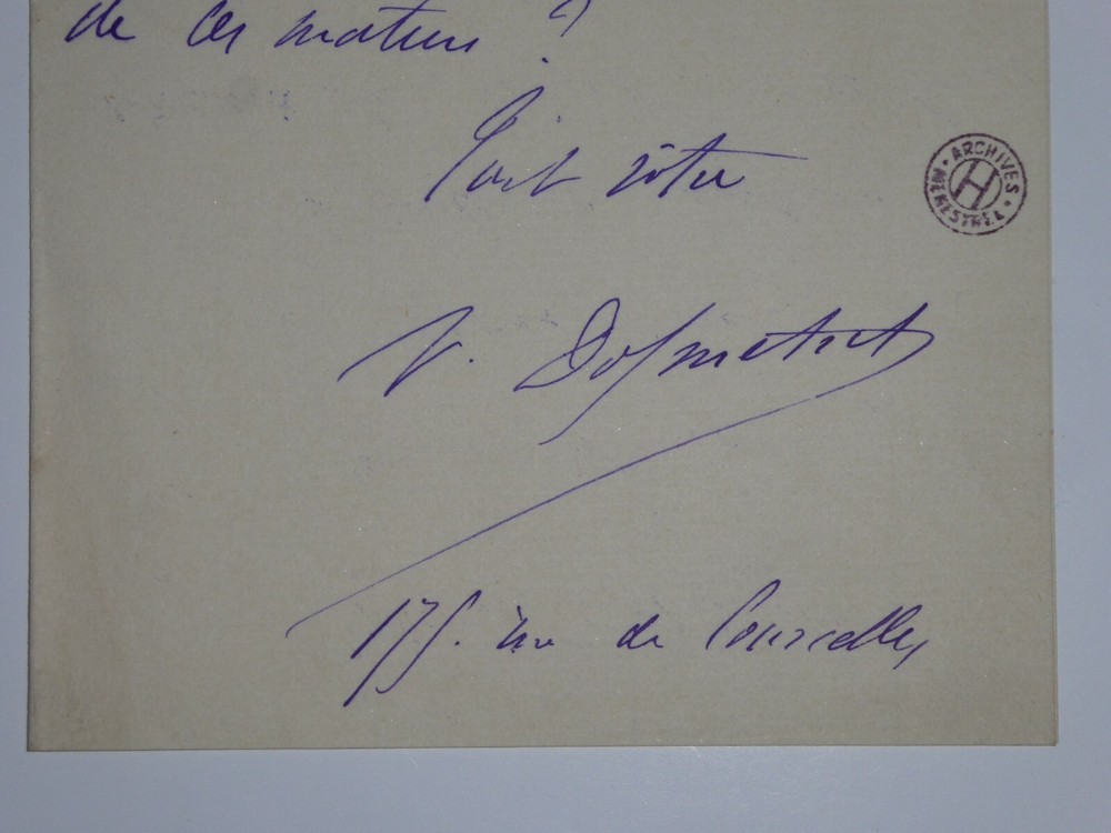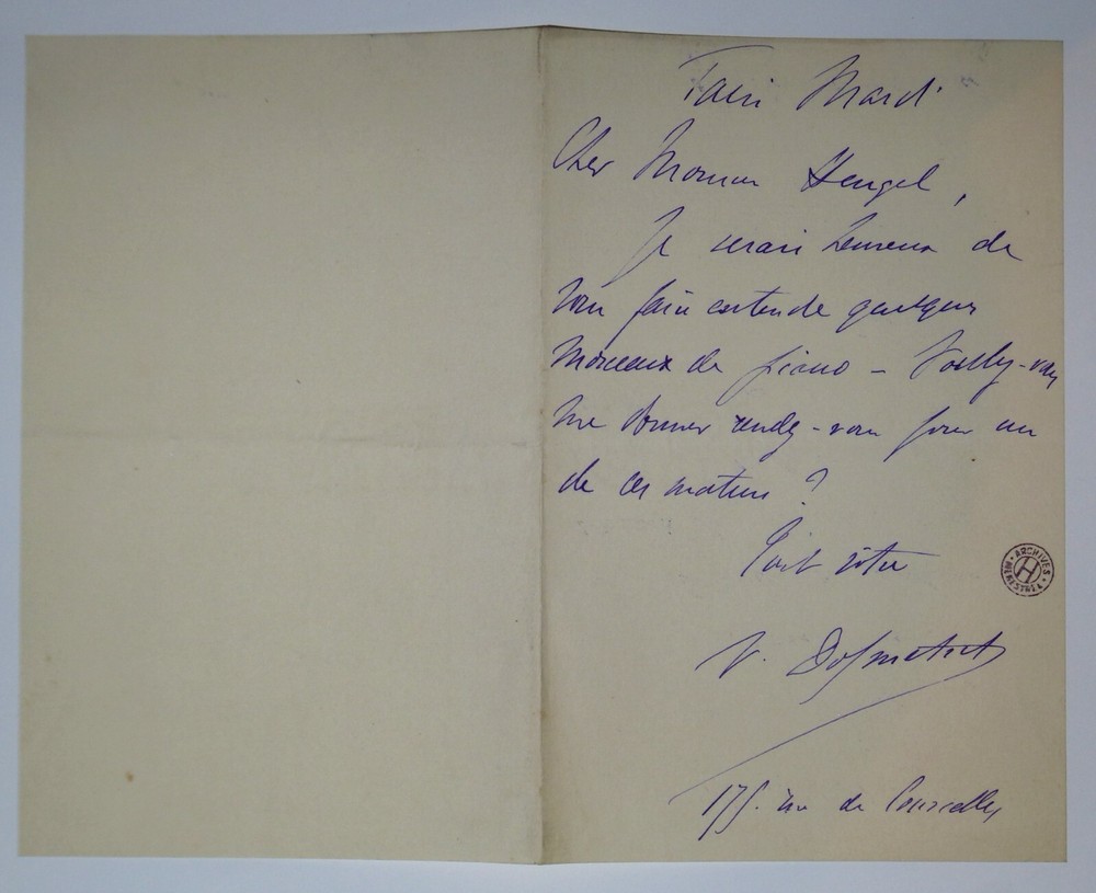 Victor DOLMETSCH. Lettre autographe signée. Lettre en une page adressée à Henri Heugel dans laquelle il explique qu'il souhaite lui faire entendre quelques morceaux de piano. Dimensions : 10.2 x 16 cm. 1 page. Etat : Bon état de conservation. Victor Dolmetsch, né le 11 août 1852 à Nantes et mort le 20 décembre 1904, est un compositeur et musicien français spécialisé en piano. Henri Heugel, né le 3 mai 1844 à Paris et mort le 11 mai 1916 dans la même ville, est l'auteur de plusieurs ouvrages littéraires estimés. Directeur de la maison d'éditions musicales le Ménestrel, il se retire en 1948, laissant les commandes à ses deux fils François et Philippe. En 1980, la maison Heugel est rachetée par les éditions Alphonse Leduc. Il fut nommé chevalier de la Légion d'honneur. Envoi soigné dans un emballage rigide et étanche. Satisfait ou remboursé. Si vous n'êtes pas entièrement satisfait, je reprends la marchandise avec retour à ma charge pour l'Europe et à la charge de l'acheteur pour le reste du monde. N’hésitez pas à visiter ma boutique et affiner vos recherches en fonction des catégories qui vous intéressent. Ma boutique L'Art Délivré. Lettres autographes, vieux papiers, livres anciens, photographies, gravures, timbres… Nous expertisons et/ou rachetons dans toute la France vos lettres, collections de lettres et livres anciens. Merci de votre visite. Jérôme KAYSER. Lettre en une page adressée à Henri Heugel dans laquelle il explique qu'il souhaite lui faire entendre quelques morceaux de piano. Victor Dolmetsch, né le 11 août 1852 à Nantes et mort le 20 décembre 1904, est un compositeur et musicien français spécialisé en piano. Henri Heugel, né le 3 mai 1844 à Paris et mort le 11 mai 1916 dans la même ville, est l'auteur de plusieurs ouvrages littéraires estimés. Directeur de la maison d'éditions musicales le Ménestrel, il se retire en 1948, laissant les commandes à ses deux fils François et Philippe. En 1980, la maison Heugel est rachetée par les éditions Alphonse Leduc. Il fut nommé chevalier de la Légion d'honneur. Satisfait ou remboursé. Si vous n'êtes pas entièrement satisfait, je reprends la marchandise avec retour à ma charge pour l'Europe et à