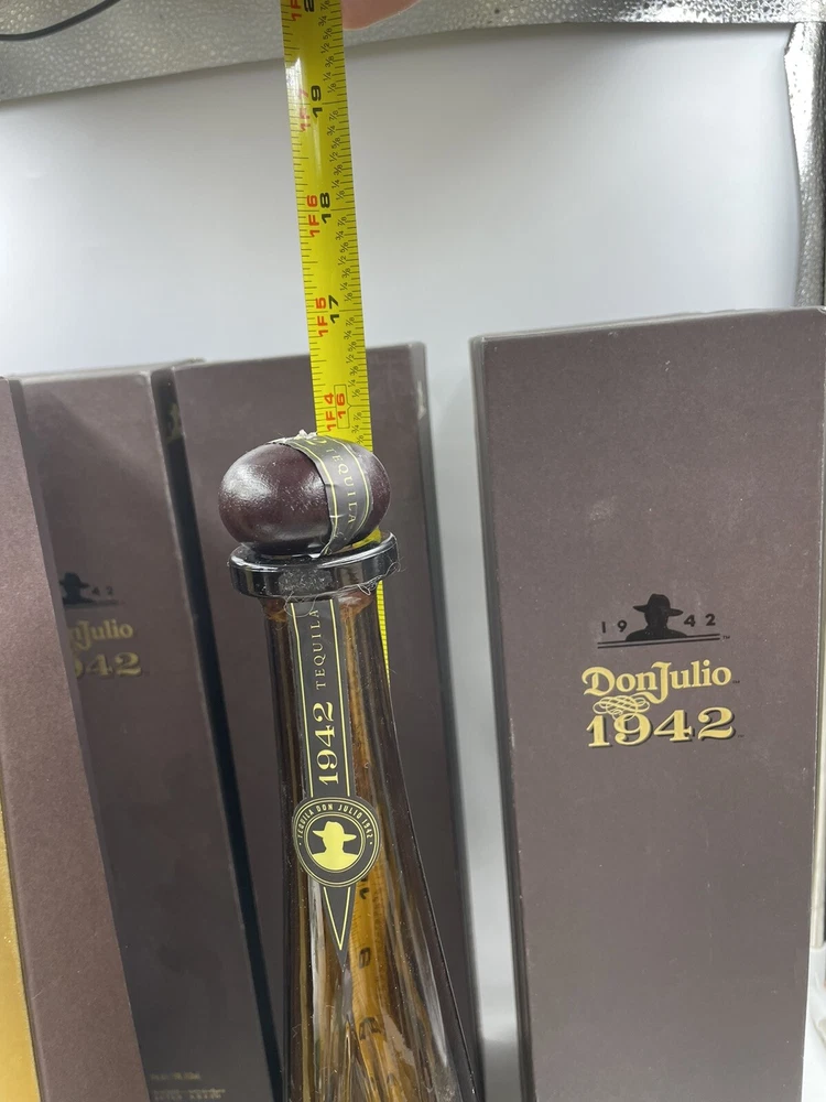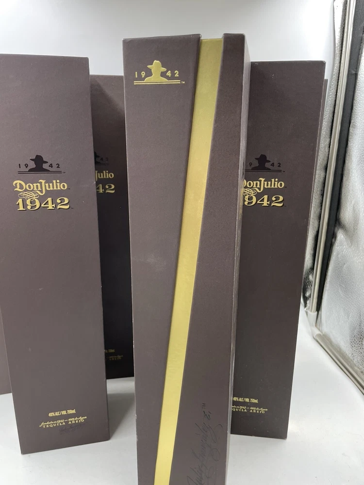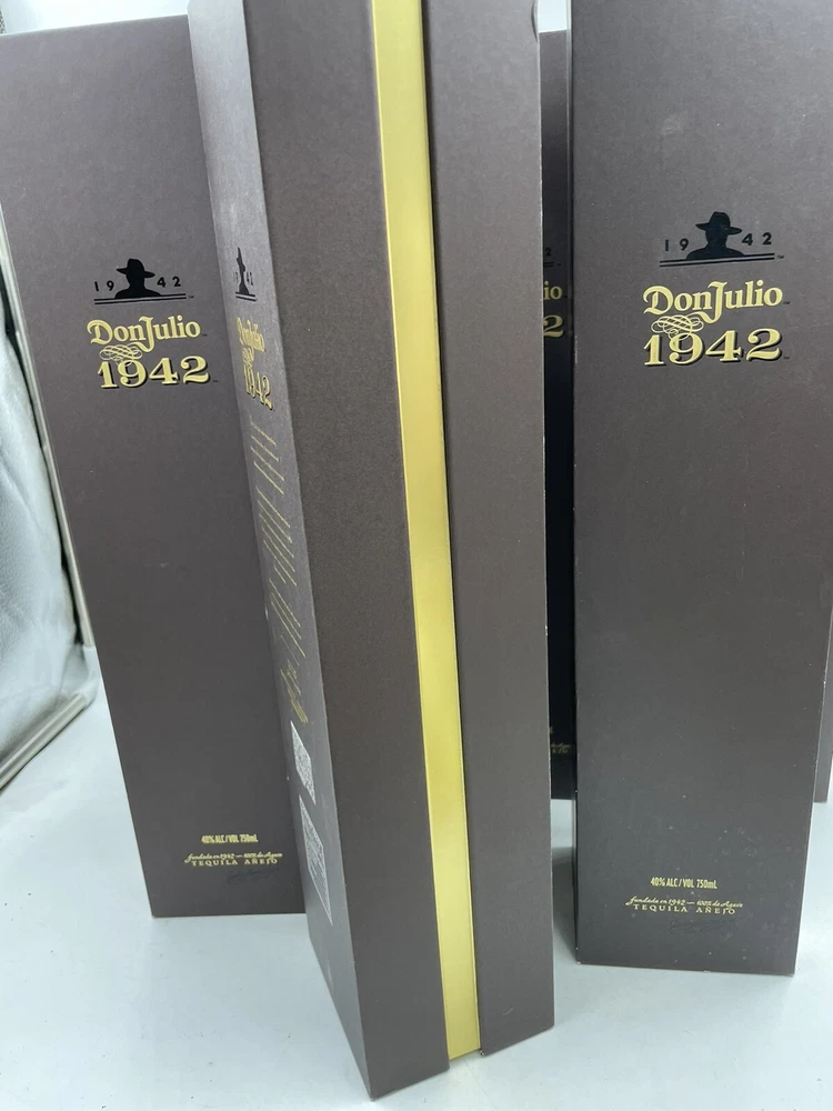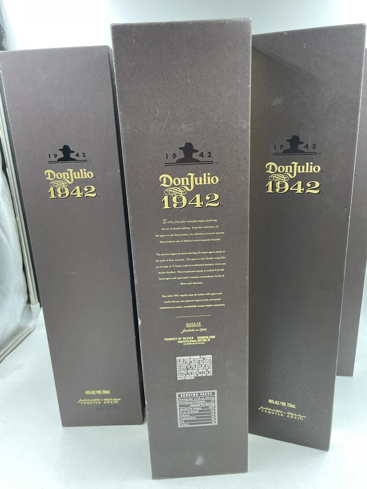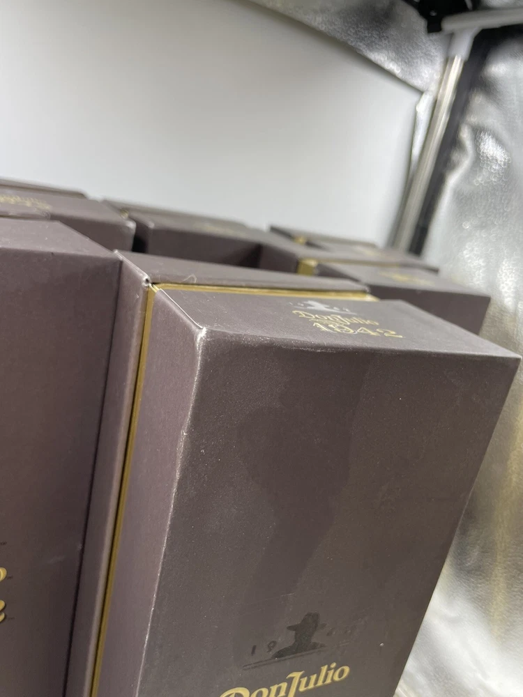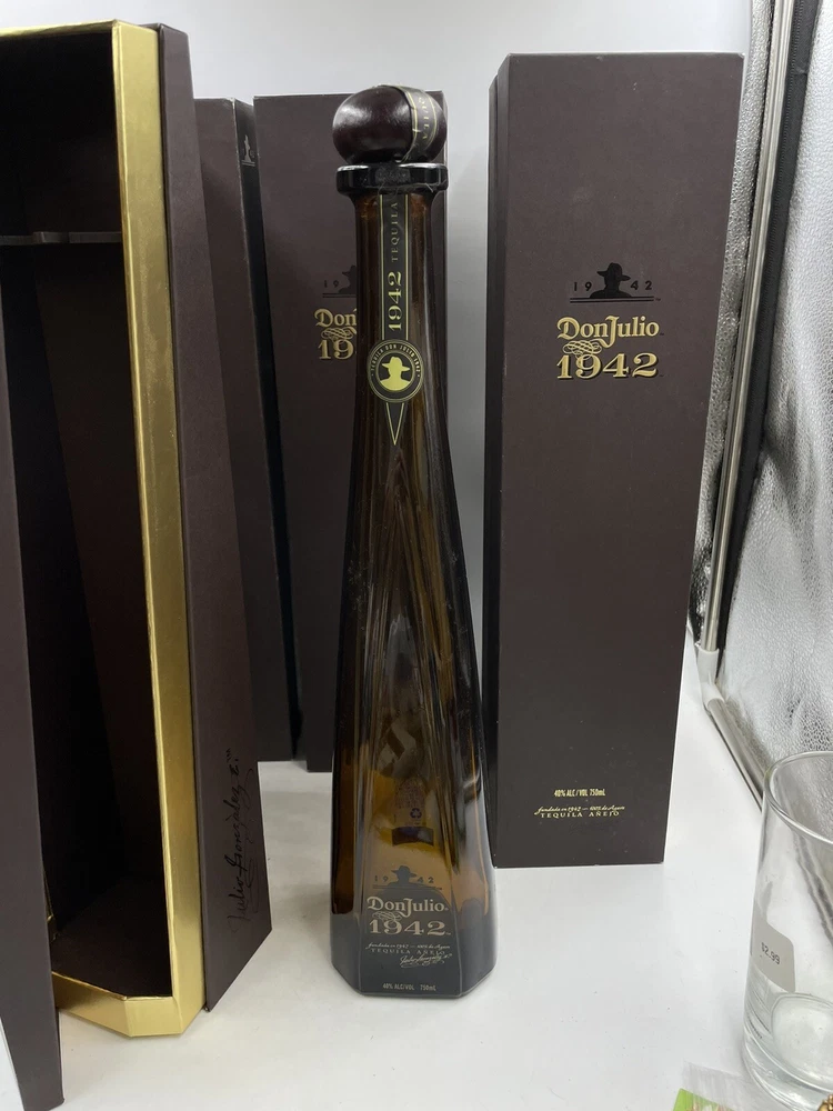 This empty bottle of Don Julio Anejo 1942 Tequila comes with its original box. The bottle is 750 ml in size and was made in Mexico, the home of tequila. The brown color and intricate design of the bottle make it a beautiful addition to any display. Whether you are a fan of Don Julio tequila or simply appreciate the artistry of liquor bottles, this item is sure to impress. Some boxes have some minor dings. Please see all pictures The bottle is being sold as a collectible and is not intended for consumption. It is in very good condition. Add this unique piece to your collection today.