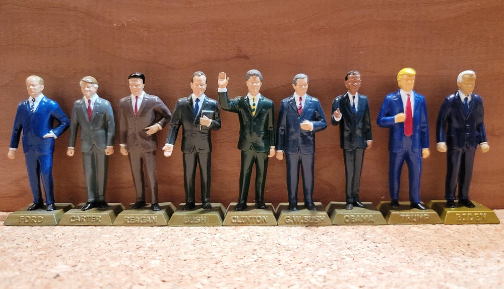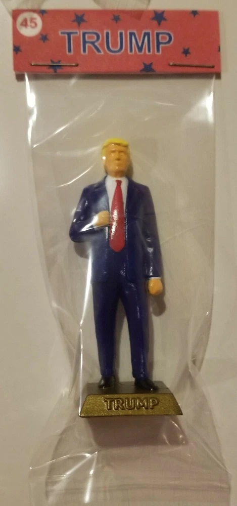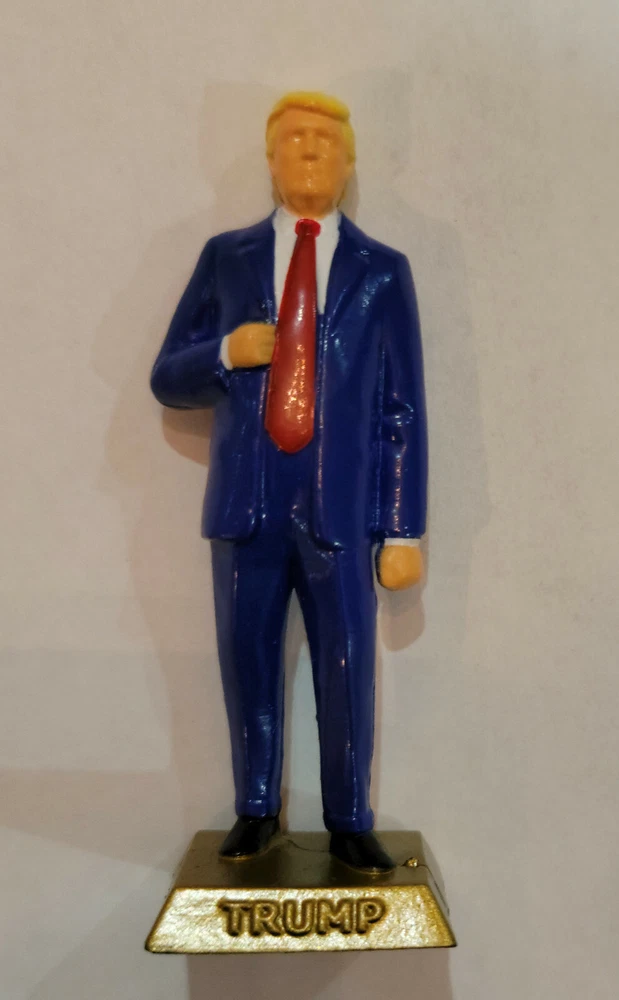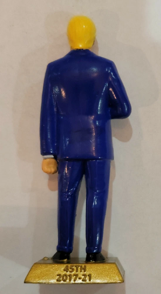 DONALD JOHN TRUMP 45th President of the United States Individually and Sequentially Numbered Figurine This listing is for a hand-painted, injection molded plastic figurine of President Donald J. Trump, made to look like the 3 inch Marx Presidents figurines of the 1950s and '60s. Tens of thousands of presidential figurines made by the Marx Toy Company were sold over the years. Thousands of these vintage collectors items have appeared on eBay as individual listings and in sets, with the most recent president being Richard Nixon. Infrequently, the rare Ronald Reagan figure appears (made when he was a candidate for president in 1968). Because Marx was sold in 1972, they never made figurines of presidents Gerald Ford, Jimmy Carter, George Bush, Bill Clinton, George W. Bush, Barack Obama, Donald Trump or Joe Biden . Starting in 2003, collector Patric M. Verrone began producing figurines in the Marx tradition. Thousands of these new figurines have been produced and have been featured in WIRED Magazine and The New Yorker . Like the vintage Marx product, this figurine is about 3 inches tall (60mm), machine cast in plastic, and painted with enamel paint. The name "TRUMP" appears on the front of the base. The back of the base says, "45TH 2017-21." Unlike the Marx figurines, each figurine is individually and sequentially numbered on a sticker on the bottom of the base. The original digital sculpt was created by Phil Ramirez of Ramirez Studios, in conjunction with Pretty in Plastic Design Studio in North Hollywood, California, and Design Masters in Toano, Virginia. Also for sale separately are figurines of U.S. presidents Gerald Ford, Jimmy Carter, Ronald Reagan, George Bush, Bill Clinton, George W. Bush, Barack Obama, and Joe Biden. The nine president figurines are also available as a set . Also available is a plastic display stand, designed in the manner of the Styrofoam stand that accompanied the 1970 releases of the Marx sets. It can hold up to 49 figurines. These stands are also individually and sequentially numbered. A listing photo shows the entire set, from George Washington to Joe Biden, displayed on the stand. Figurines of Vice President Kamala Harris, First Lady Jill Biden, presidential candidates, Supreme Court justices, and other Famous Americans designed in the Marx tradition are available by special order.