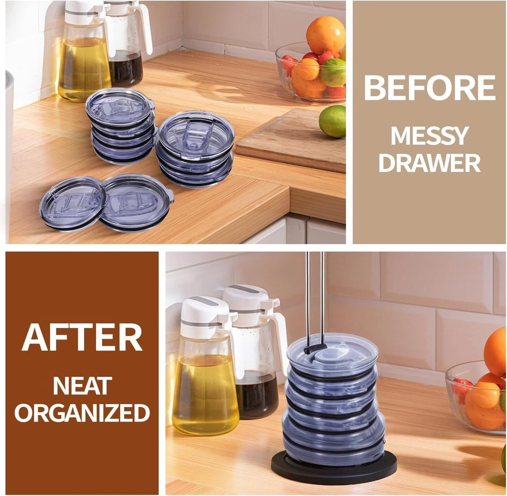 DOSTK 2PC Tumbler Lid Organizer, Tumbler Lid Holders for Kitchen Storage & Organization, Space - Saving Cup Lid Organizer for Yeti Tumbler & Stanley Tumbler & Simple Modern Tumbler Lids, Silicon Base Product Details Assembly Required: No Manufacturer: DOSTK Part Number: 2Pack White&Black Item Weight: 6.4 ounces Product Dimensions: 0.59 x 3.9 x 7.8 inches Country of Origin: China Item model number: 2Pack White&Black Batteries Included?: No Batteries Required?: No Material: Stainless Steel Brand: DOSTK Item dimensions L x W x H: 0.59 x 3.9 x 7.8 inches Shape: Rectangular prism Base Type: Pedestal Material: Made of silicone base + premium stainless steel, rustproof and waterproof to ensure long time use. No screws or manual fixing is needed. Stable Base: The tumbler Lid Holders has a weighted base, can help you one hand-operate easily, and the base is made of eco-friendly silicone to keep the lid holder in place when you place the lid. It also prevents the mental scratching of your countertop. Simple & Effective: Our tumbler lid organizer can help your cup lids from being scattered all over the place, No more rummaging through cluttered drawers or cabinets and find the tumbler lid replacement you need within seconds. Compatibility: This cup lid organizer can store up to 10 tumbler lids. It fits both of drinking lid and straw lid (NOTE: Straw Hole Over 0.59″). Perfectly compatible with Yeti lid, Stanley lid, Simple Modern lid, etc. Space Saving: Cup lid organizer features a foldable, stackable design that saves countertop space. It's a perfect solution for small kitchens, apartments, or any space where efficient use of space is paramount, You will love it!