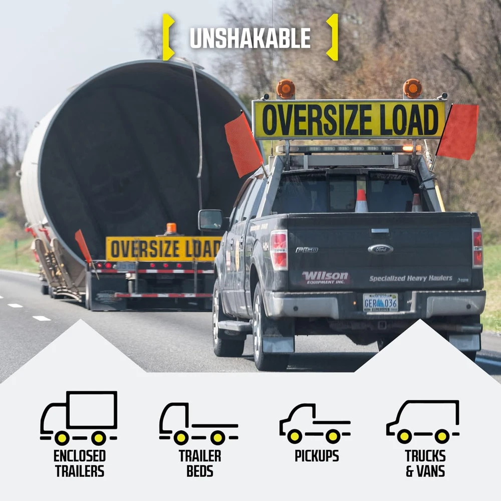 road, keeping you and others safe. The spring-loaded design makes it super convenient—just pop it on and off in seconds. The mount is solid and holds tight, no wobbling even at high speeds. Perfect for trucks and oversized loads, this flag stands out clearly day or night. A must-have for anyone hauling large cargo—simple, effective, and reliable!