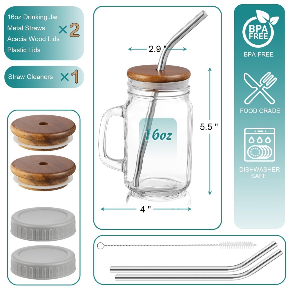DRASTAR Mason Jar Cups with Handle,16 oz Glass Coffee Mugs with Straws and Acacia Lids & Airtight Lids, Drinking Glass Cups Set of 2, Glass Cup for Iced Coffee, Smoothie, Overnight Oats Containers Product Details Color: Clear Size: 16 oz Brand: DRASTAR MPN: Does not apply UPC: Does not apply EAN: Does not apply Brand: DRASTAR Color: Clear Special Feature: Transparent Style: Mason jar Recommended Uses For Product: Home Brand: DRASTAR Color: Clear Special Feature: Transparent Style: Mason jar Recommended Uses For Product: Home Included Components: Lid, Straw Specific Uses For Product: Cold Drinks, Storage Shape: Round Pattern: Solid Product Care Instructions: Machine Wash, Hand Wash Only Age Range (Description): Adult Material Feature: glass Reusability: Reusable Unit Count: 2.0 Count Item Weight: 1.85 Pounds Material Type Free: Lead Free Number of Items: 1 Package Type: protective packaging Manufacturer: DRASTAR Size: 16 oz Product Dimensions: 5.5 x 5.5 x 6.6 inches Item Weight: 1.85 pounds Country of Origin: China Date First Available: April 8, 2024 2 KINDS OF LIDS: The iced coffee cup comes with two stainless steel metal straws, 2 acacia wood lids, and 2 plastic lids for straws & twist tops. These glasses with lids are perfect for keeping bugs and animal hair out of your drinks2 KINDS OF LIDS: The iced coffee cup comes with two stainless steel metal straws, 2 acacia wood lids, and 2 plastic lids for straws & twist tops. These glasses with lids are perfect for keeping bugs and animal hair out of your drinks MULTIFUNCTIONAL: These are some great glasses for chilled drinks like smoothies or sweet tea, iced coffee, lemonade, iced smoothie, traditional cocktails, cold beverages, soda and beer. Also, you can use this glass to store oatmeal, macaroni, and so on (no more than 160F for hot drinks) EASY TO USE & DISHWASHER SAFE: 16 oz Mason jars with lid set of 2 ensure a comfortable grip, making it easy to hold and carry while taking the load off your hands. Mason jar mugs with lids are dishwasher safe (please hand wash the lids) QUALITY &STYLISH: Glass tumblers with straw and lid are made of lead-free thick glass, BPA free. The acacia wood lids are less prone to mold and cracking than bamboo lids and look better in photos PRACTICAL GIFT: Great for giving these mason jar cups as gifts to friends, such as bridal showers, birthdays, housewarmings, Christmas, etc., ideal for parties, holidays, barbecues, and picnics. If you have any problem with this glass cup, please contact us