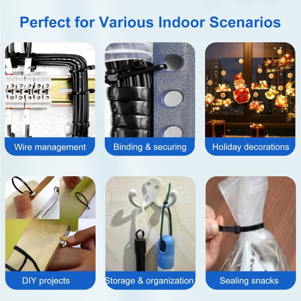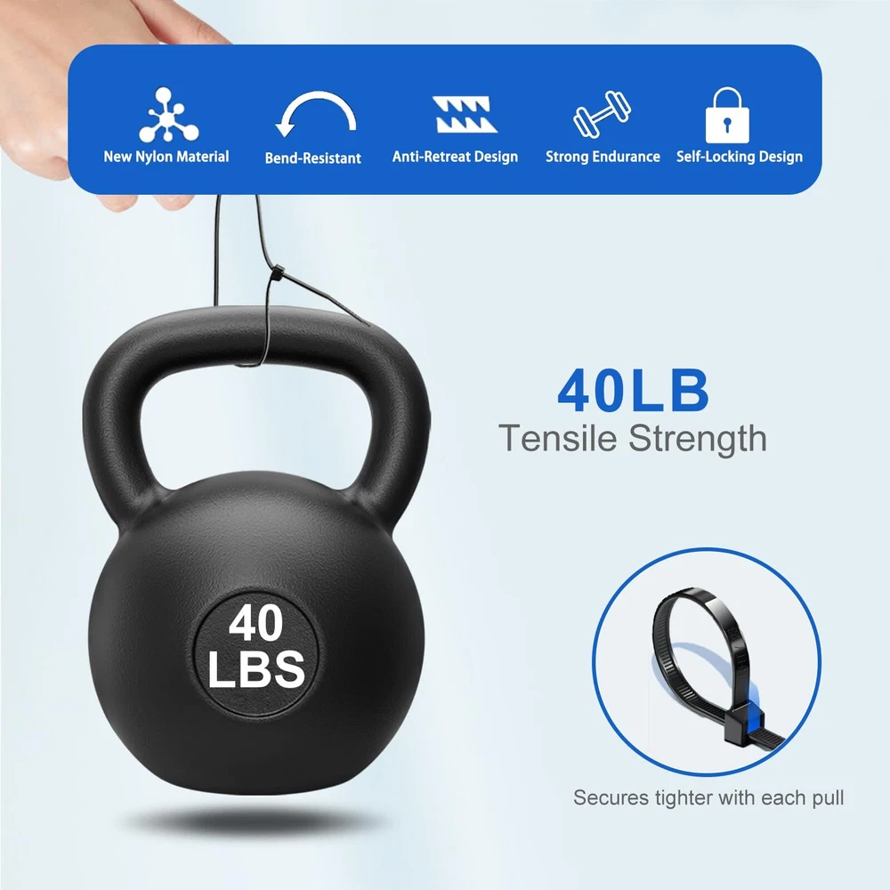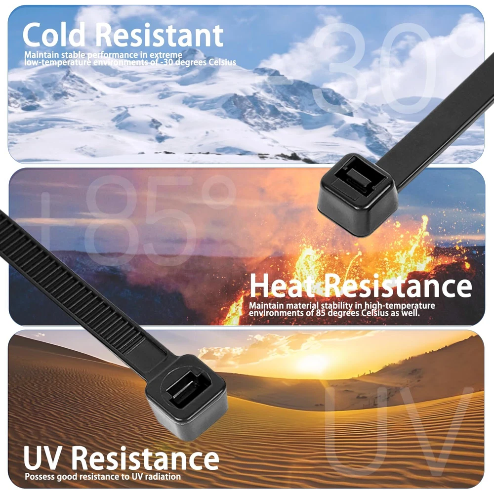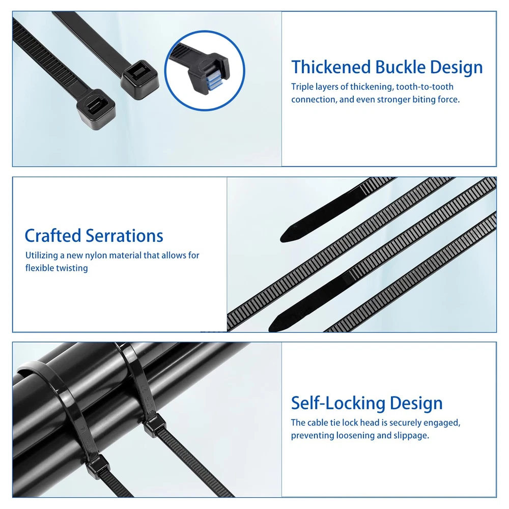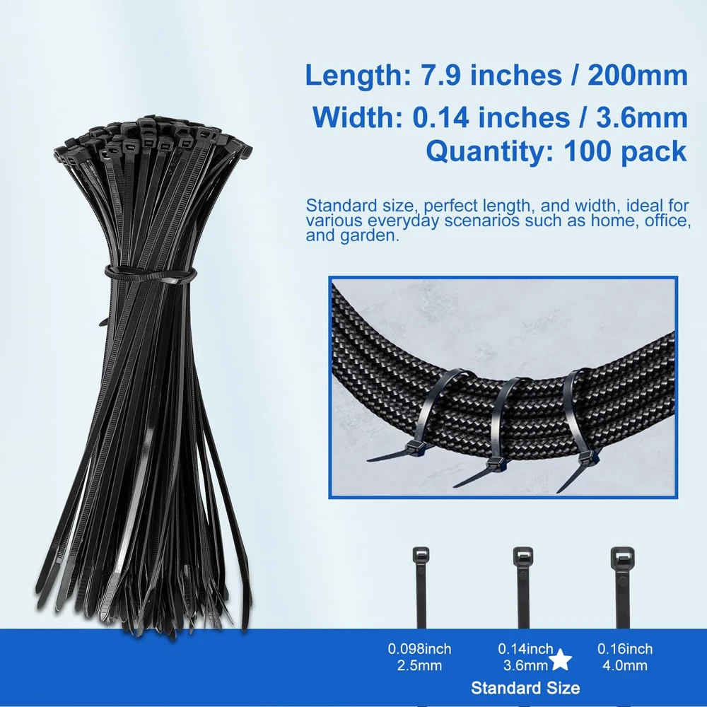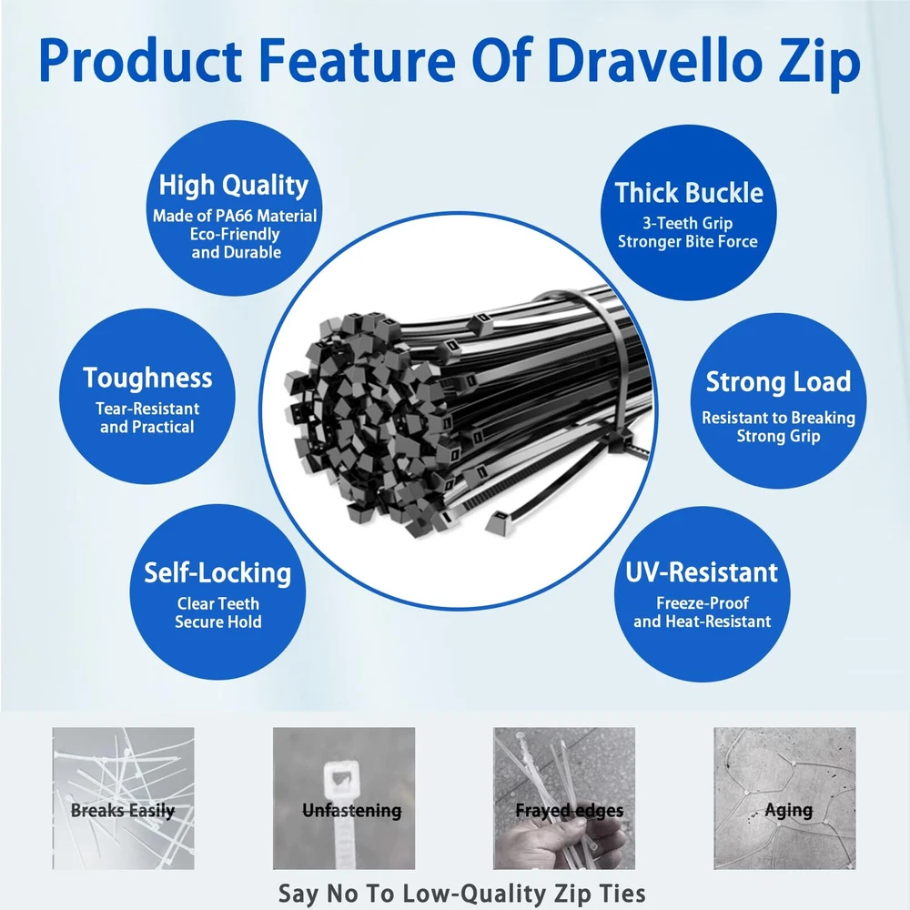 DRAVELLO Nylon Zip Ties, Black, 8 Inches, 100PCS Brand Vision DRAVELLO is dedicated to innovation and excellence, offering high-performance, versatile nylon zip ties. Exceptional Quality DRAVELLO zip ties provide outstanding UV resistance and chemical durability, ensuring excellent performance in harsh environments and guaranteeing your safety. Superior Tensile Strength Each zip tie has a tensile strength of 40 lbs (18.1 kg), significantly higher than standard products. The 0.15-inch (approximately 0.4 cm) width design offers enhanced sturdiness and stability for various applications. Self-Locking Design DRAVELLO zip ties feature an easy-to-use self-locking mechanism, ensuring quick and secure fastening. The integrated structure enhances durability and consistency, simplifying your tasks. Versatile Applications Ideal for organizing electronic cables, securing household items, or outdoor repairs, DRAVELLO zip ties are the perfect solution. The 8-inch (20.3 cm) length is great for managing cables and keeping spaces tidy, as well as for gardening and hanging items. Warranty DRAVELLO offers a full refund for any quality issues within the warranty period, ensuring a worry-free purchase. Usage Tips 1.Keep out of reach of children. 2.Store sealed to extend lifespan. 3.Use within the recommended temperature and tensile strength range. Choose DRAVELLO for quality and service that exceed expectations, making every use a pleasant experience. 【Versatile 8-Inch Zip Ties】: 0.14 inch standard size, 40 lbs tensile strength, 100 pack, strong and flexible zip ties suitable for various applications. 【High-Quality Material】: Made from Industrial-strength Nylon66, withstand temperatures from -40℉ to 185℉. weatherproof, UV-resistant, Features strong load ability, anti-aging and built for high toughness and durability. 【Powerful Self-Locking Design】: Clear teeth grooves provide a firm grip, and the self-locking mechanism ensures a secure hold, preventing accidental release. 【Wide Applications】: Widely used in home, office, or garden use. Perfect for cable management, gardening, garage organization, decoration, DIY projects, and temporary repairs. 【Cost-Effective and Great Value】: A high-quality product with excellent craftsmanship. DRAVELLO zip ties are designed for ease of use and outstanding durability, ensuring a superior user experience.