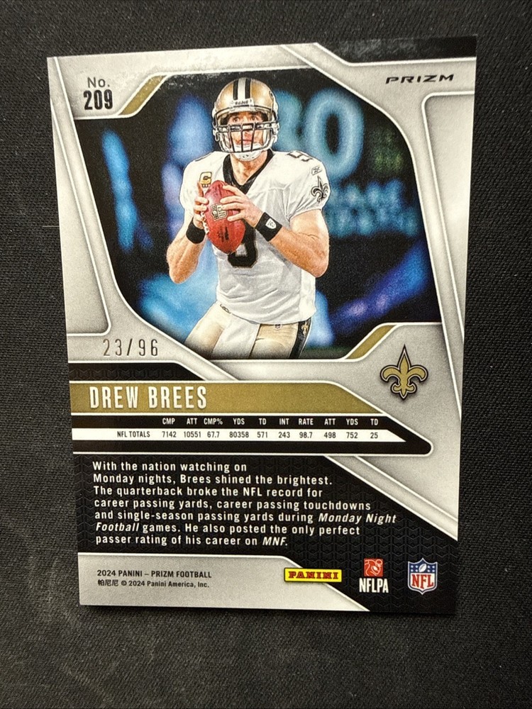 Capture a piece of football history with this 2024 Panini Prizm Drew Brees Blue Sparkle card, showcasing the icon quarterback of the New Orleans Saints. This eye-catching card is part of a limited print run of just 96, making it a coveted collectible for enthusiasts and fans alike. The Blue Sparkle parallel adds a unique shimmer to your collection, celebrating Drew Brees's legacy in the NFL. Crafted from high-quality card stock and measuring a standard size, this card is not autographed, ensuring the focus remains on the stunning design and Brees's prestige. It's an original piece, manufactured in the United States, and designed to commemorate the Super Bowl season. Whether for display or trade, this card is a must-have for any serious collector or football aficionado.