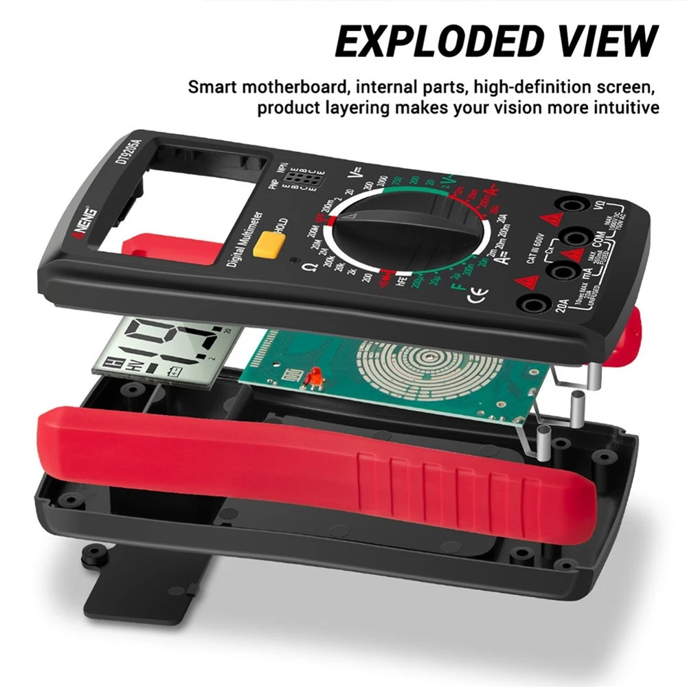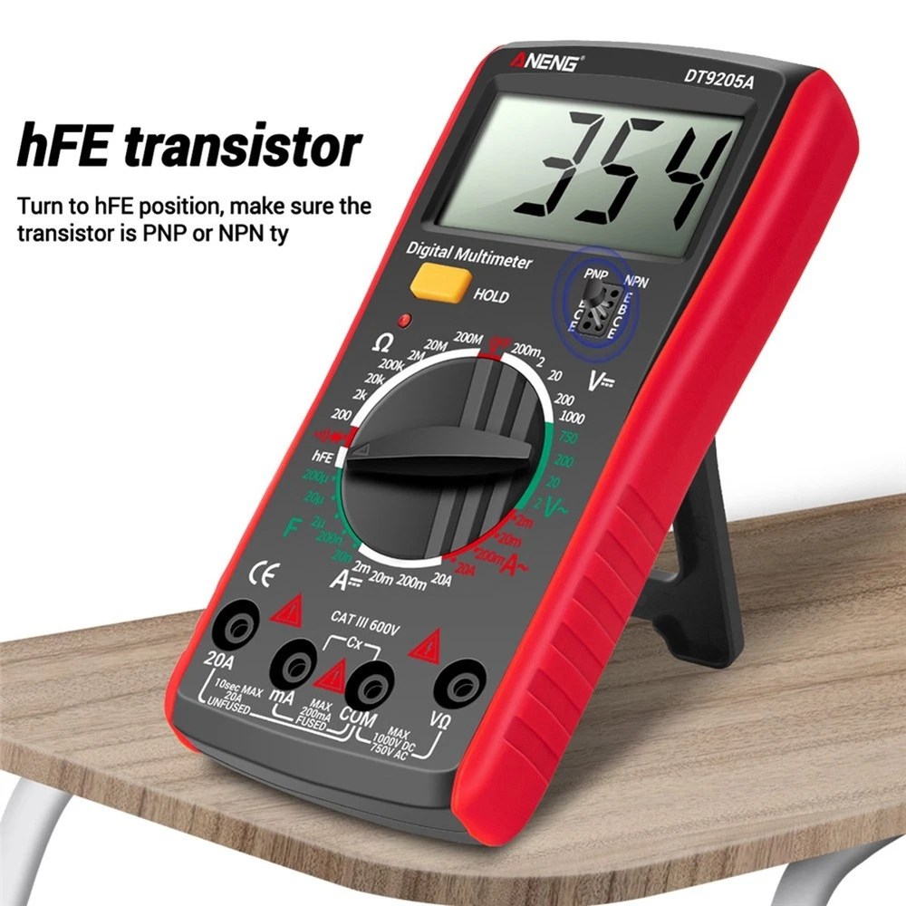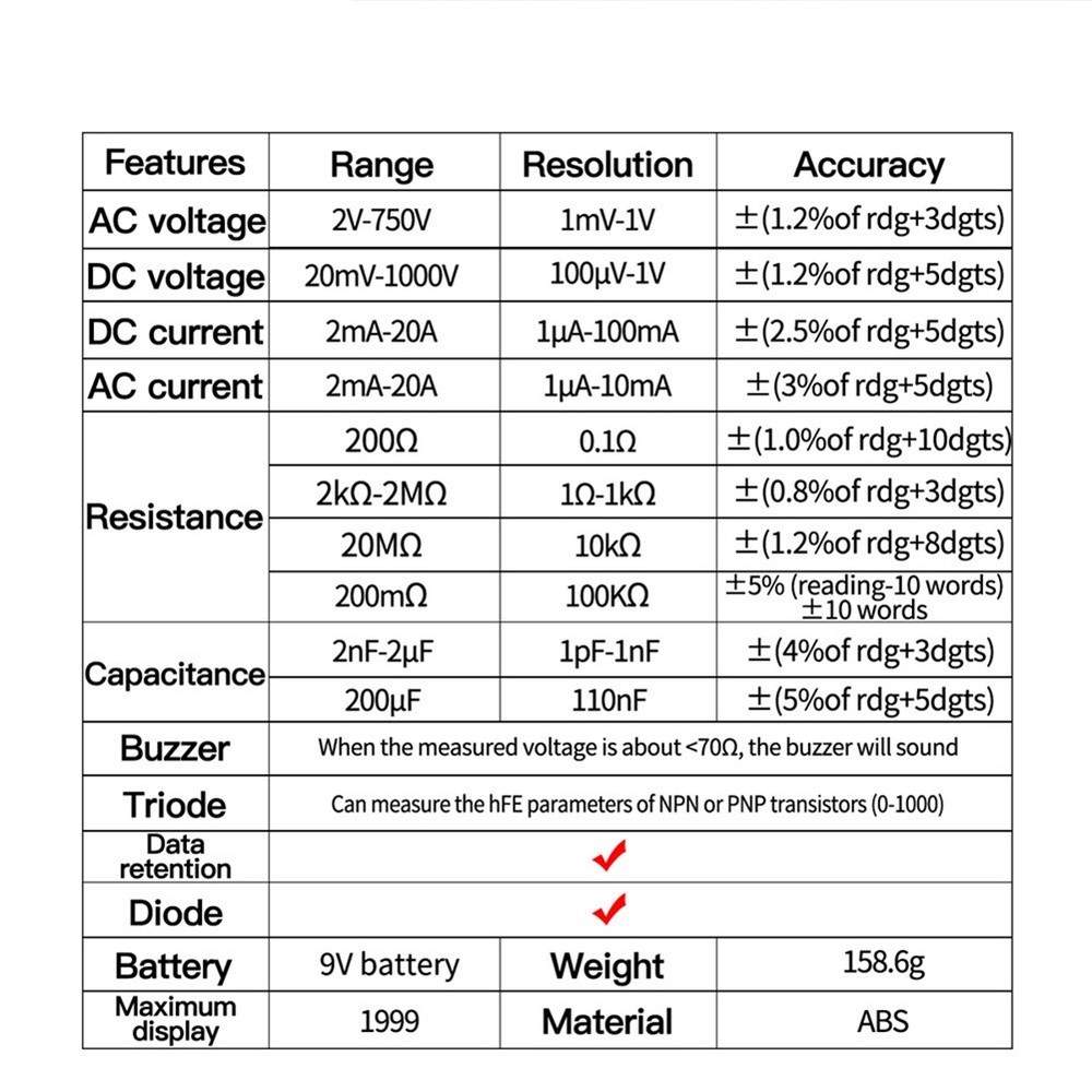 DT9205A Digital Multimeter Transistor Tester Elektrisches NCV Test6119 Gleichspannung: 200 m-2-20-200-1000 V + / - 0,5 % Wechselspannung: 200 m-2-20-200-700 V + / - 1,0 % Gleichstrom: 2 m - 20 m - 200 m - 20 A + / - 1,0 % Wechselstrom: 2 m - 20 m - 200 m - 20 A + / - 1,5 % Widerstand: 200-2K-20K-200K-2M-20M-200M + / - 1,0 % Kapazität: 20n-200n-2u-20u-200uF + / - 4,0 % Messwiderstandsbereich: 200 ROM 3-stelliges LCD, maximaler Anzeigewert 1999 Diode: Triode: Stromversorgung: 9V 6F22 Batterie (nicht im Lieferumfang enthalten) Betriebstemperatur: 0 - 40 ° Farbe: Rot Material: Kunststoff Größe: ca. 195 x 90 x 35 mm Verpackungsinhalt: 1 x DT9205A Multimeter 1 x Testkabel