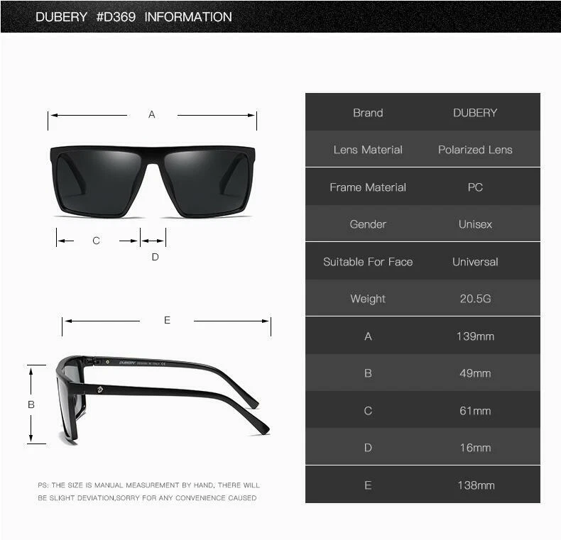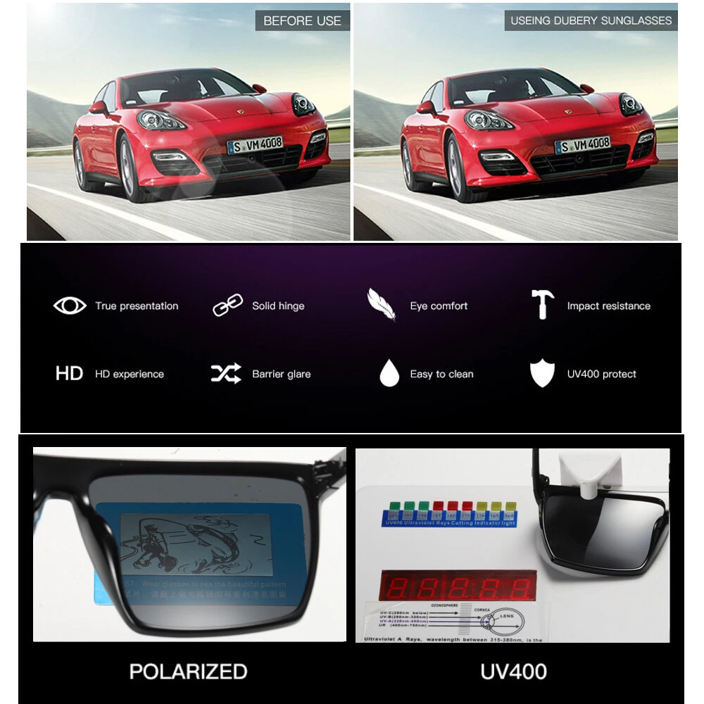 DUBERY Men Women Polarized Sport Sunglasses Square Driving Fishing Glasses UV400 Description Brand:DUBERY Frame Material : Plastic Lens Material:Polycarbonate Visible Perspective Rate: 99% Anti-UV rating: UV400 Whether polarized : Yes. Gender:Men/Women Lens width: about 61 mm Lens height: about 49 mm Bridge: about 16 mm Frame Width: about 139 mm Temple Length : about 138 mm Package included: 1*Sunglasses(Not include boxes and other accessories) Note: 1. Due to the different monitor and light effect, the actual color of the item might be slightly different from the color showed on the pictures. Thank you! 2. Please allow 1-3mm measuring deviation due to manual measurement. Brand DUBERY MPN Does Not Apply Style Square Lens Technology Polarized Frame Material Plastic Temple Length 138 mm Country/Region of Manufacture China Theme Classic, Designer, Logo, Outdoor, Sports Frame Width 139 mm Model D369 Frame Color Multicolor Department Men Lens Material Mirror, Polycarbonate UV Protection UV400 Bridge Width 16 mm Features Reflective Lens Height 49 mm Lens Width 61 mm Personalized No Type Sunglasses