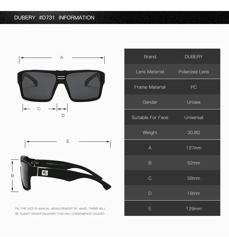 DUBERY Unisex Polarized Square Sunglasses Oversize Driving Fishing Sport Glasses Description Brand: DUBERY Condition: New without Tags Frame Material : Plastic Lens Material:TAC Anti-UV rating: UV400 Whether polarized : Yes. Gender: Men/Women Lens width: about 58 mm Lens height: about 52 mm Bridge: about 18 mm Frame Width: about 137 mm Temple Length: about 129 mm Package included 1* Sunglasses(Not include boxes and other accessories) Note: 1. Due to the different monitor and light effect, the actual color of the item might be slightly different from the color showed on the pictures. Thank you! 2. Please allow 1-3mm measuring deviation due to manual measurement ! Features Oversized, Reflective UV Protection UV400 MPN Does Not Apply Department Unisex Adults Frame Color Multicolor Frame Material Plastic Country/Region of Manufacture China Model D729 Brand DUBERY Lens Material Mirror, TAC Style Square Personalized No Lens Technology Polarized Theme Classic, Designer, Logo, Outdoor, Sports Type Sunglasses Temple Length 129 mm