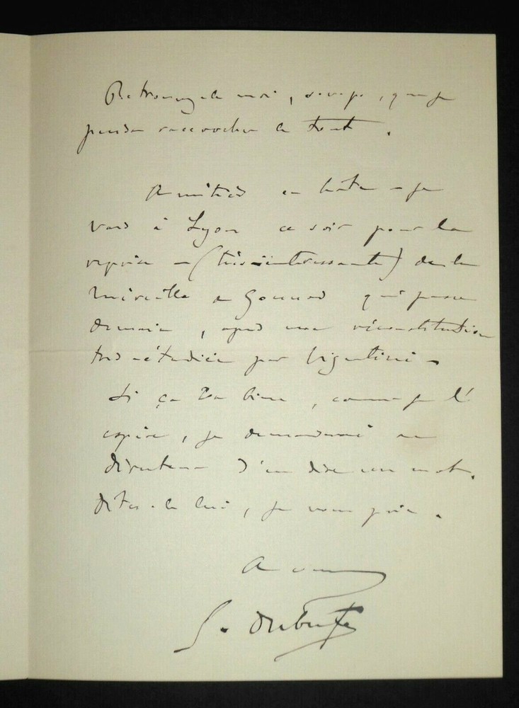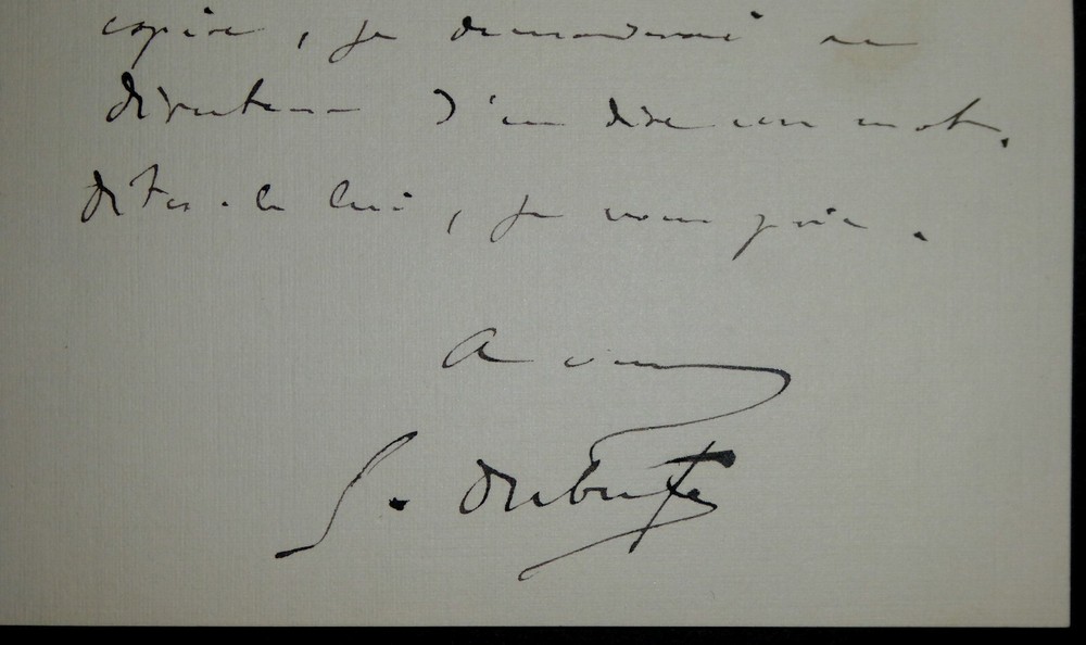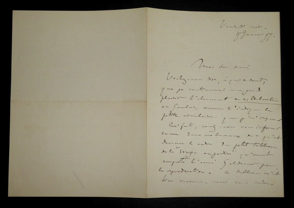 Guillaume DUBUFE. Lettre autographe signée, 4 janvier 1897. Il parle d'un petit tableau de "la vierge au jardin". Etat : Bel état. Dimensions : 17 x 12.5 cm. 2 pages. Guillaume Dubufe, né à Paris le 16 mai 1853, et mort en mer au large de Buenos Aires le 25 mai 1909, est un peintre et illustrateur français. Wikipédia Envoi soigné dans un emballage rigide et étanche. N’hésitez pas à visiter ma boutique et affiner vos recherches en fonction des catégories qui vous intéressent. Ma boutique L'Art Délivré. Lettres autographes, vieux papiers, livres anciens, photographies, gravures, timbres… Nous expertisons et/ou rachetons dans toute la France vos lettres, collections de lettres et livres anciens. Merci de votre visite. Jérôme KAYSER. Guillaume DUBUFE. Lettre autographe signée, 4 janvier 1897. Il parle d'un petit tableau de "la vierge au jardin". Etat : Bel état. Dimensions : 17 x 12.5 cm. 2 pages. Guillaume Dubufe, né à Paris le 16 mai 1853, et mort en mer au large de Buenos Aires le 25 mai 1909, est un peintre et illustrateur français. Wikipédia Envoi soigné dans un emballage rigide et étanche. N’hésitez pas à visiter ma boutique et affiner vos recherches en fonction des catégories qui vous intéressent. Ma boutique L'Art Délivré. Lettres autographes, vieux papiers, livres anciens, photographies, gravures, timbres… Nous expertisons et/ou rachetons dans toute la France vos lettres, collections de lettres et livres anciens. Merci de votre visite. Jérôme KAYSER.