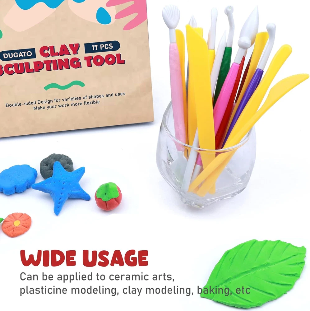 All The Clay Sculpting Tools You Need: This modeling clay tool provides you with all the necessities for clay sculpting. The package includes 7 double-ended tools, 2 pointed tools, 1 scraper, and 7 different plastic modeling tools. These model magic tools are specifically designed for various tasks such as carving, shaping, modeling, scraping, cutting, brushing, smoothing, and intricate detailing. The Best Quality Clay Dough Tools: Made from lightweight and safe plastic material, these clay accessories for young individuals are highly suitable for use. They not only facilitate the development of young individual's manual creativity but also encourage them to unleash their imagination to the fullest extent. Enhance Your Creative Work: With our versatile double-head clay shaping tools, you'll enjoy increased flexibility in your artistic endeavors. Our double-head sculpting tools feature a variety of shapes, including spherical, shovel, cone, and shell shapes, catering to the intricate details of your work. Best Gift For Creatives: Put a smile on a friend or family member's face! These modeling clay accessories can help you shape different clay patterns that you want, and can also be used to create delicate cake modeling, flower pattern carvings, etc. This tool kit is the perfect choice for creatives, whether they're beginners or an adult. Peaceful Shopping Experience: We stand behind the quality of the clay tool set, ensuring your utmost satisfaction. In the unlikely event that this set does not meet your expectations, please don't hesitate to contact us. We are dedicated to providing a refund process that is both easy and stress-free. Product Description About Us DUGATO provides a variety of art and craft supplies for all skill levels, ages and genders. We focus on making premium tools for painting enthusiasts and inspire to express their personality We are committed to providing you the most satisfying experience with positive attitude. Product Features Variety of Shape: includes 17 different double ended tools, providing you large amount of shapes to cut, curve, made petal shape, spherical shape, shell shape, leaf shape Safe Materials: made from high quality, long-lasting and safe plastic, don’t have to worry about that your clay tools will contaminate your cakes or cookies, or plastic scraps on your ceramics. Comfortable Grip: The handle of the plastic clay tools is straight with rough section between the nib and the body of the tool, have a more firmly grip, comfortable grip even you have a sweaty hand. Wide Application: This set is suitable for homes, schools can be applied with many material like clay, plasticine clay, model magic, polymer clay, air dry clay Premium Material The clay sculpting tool is well made with high quality, durable and safe material plastic and metal. So your kids can play safely without worrying about safety or easily broken parts with colorful appearance. Non-slip Handle Each tool is designed with rough section between the nib and the body of the tool on both heads. You can have a comfortable grip when using even with your sweaty hands No Sharp Points & Edge Our tool is designed to easily cut through clay, but do not have really sharp point or edge that can tickle your kids or able to make some serious damage to them. Wide Application You can use this tool for many types of clay from plasticine clay, model magic, polymer clay, air dry clay…or to make some cute patterns to your cakes, cookies and sugar paste Double - Headed Each clay tool has 2 different shapes, increase more shape available for you to create your work , save space and money with this smart design Inventive Work Suitable for beginner and professional level, to cut, smooth, carve , shape , sculpt in many occasions such as parties, wedding, celebrations, homes, or classes. MAKE YOUR OWN CLAY & SCULPT AWAY! Perfect Gift for Children : This set of children's plastic clay sculpture tools is suitable for home and school use. Our carving tools can be easily DIY, not only can exercise children's manual creativity, but also allow them to use their imagination. This will bring happy crafting time to the children and help the family's crafting time. Warm Tips: Our clay tools can be thoroughly cleaned with soap water Please store in cool place and avoid direct sunlight Package Includes: 7 double-ended tools 7 kinds of plastic modeling tools 2 pointed tools 1 scraper Sizes (approximately): 14-18cm/5-7inch Material: Plastic , Metal Gift Box