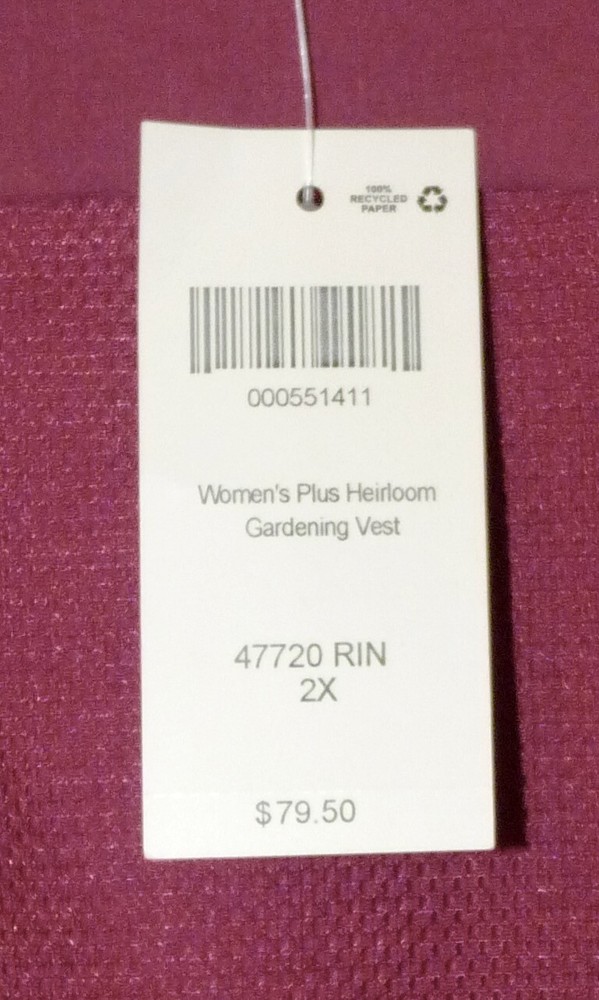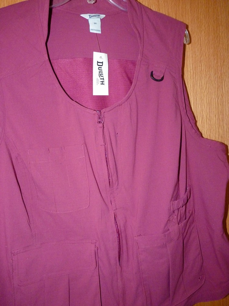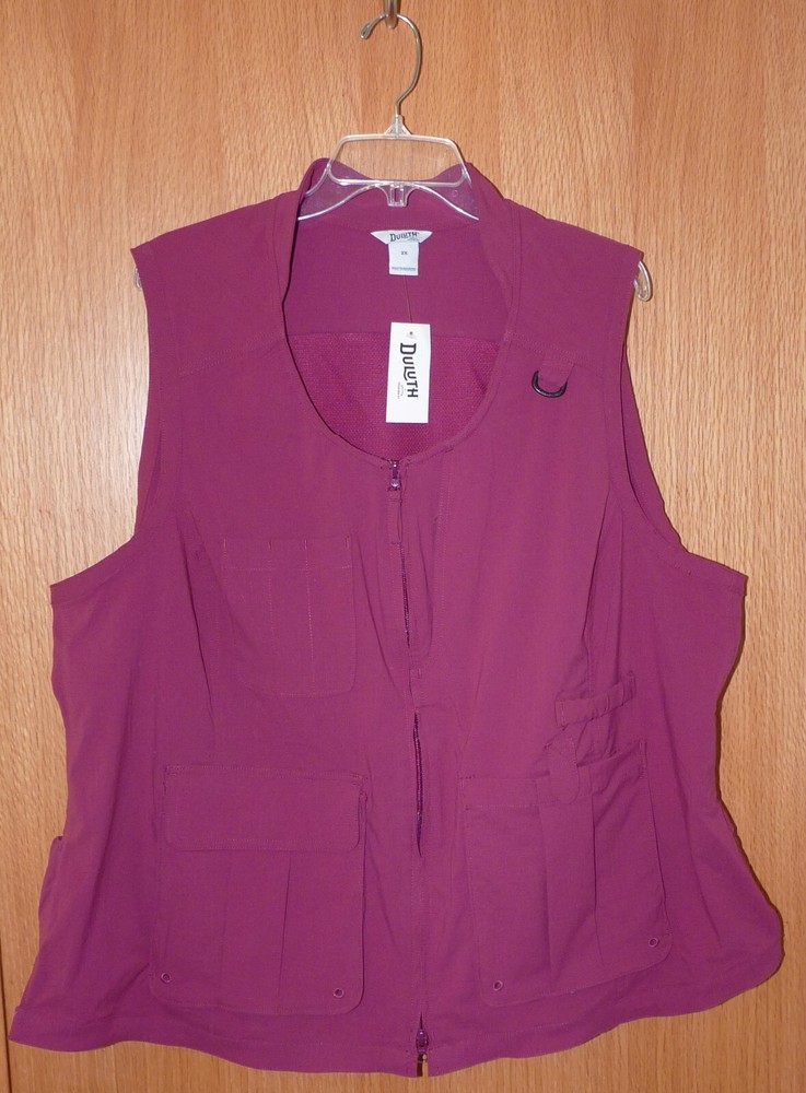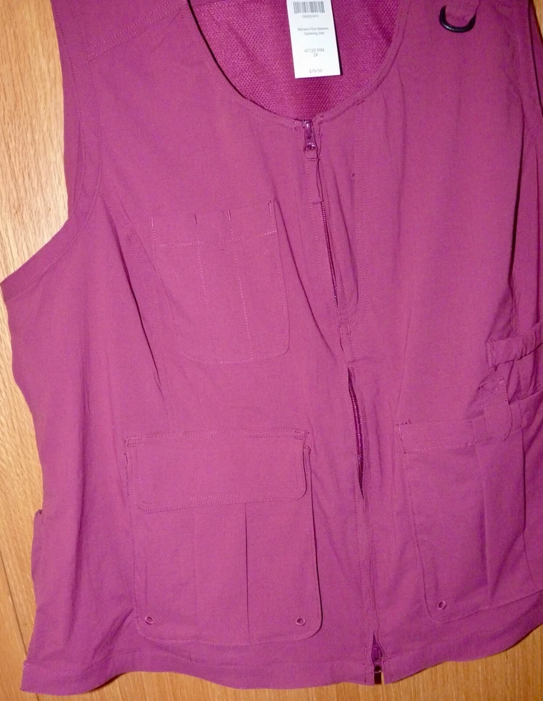 This great NEW gardening vest, size 2X, is from Duluth Trading Co. It’s the Women’s Plus Heirloom Gardening Vest in a dark burgundy red (no longer sold in the stores or online!). Here’s the manufacturer’s description: More Than a Vest, a Virtuoso! Heirloom Gardening Vest Tired of bulky, pouchy pockets in all the wrong places? We got input from gardeners, DIYers, travelers and other people who need a truly useful vest. The end result? Our innovative Heirloom Gardening® Vest. Light yet durable 4.8-oz. DuluthFlex® ripstop fabric resists snags and tears and packs serious flexibility. Plus, there's loads of smart pockets – 10 to be exact – so you can stash your phone, measuring tape and clippers and still have room for more. Dirt in your pockets? No problem. Spillway Spots in the lower front pockets allow sand and grime to fall out easily. And for cooling, we hid mesh underneath the back panel to keep air flowing without snagging every time you brush up against prickly characters like rosebushes or a rogue nail. Features 4.8-oz. DuluthFlex® ripstop fabric is super-stretchy, strong and abrasion resistant Dirt brushes right off – keep it in the garden! 10 pockets, including dual-entry front pockets and interior zip pockets Elastic strap above left pocket secures a trowel or pair of gloves Spillway Spots in the pockets allow sand and dirt to escape UPF 30 sun protection Sun collar protects your neck from harmful rays Princess seams for a beautiful, not boxy, fit 96% ripstop nylon/4% spandex Machine wash Measurements for this size 2X are: bust-54”, hip-57”, length-29”. This fun and versatile vest is new, with the original tag, and retailed for $79.50. It will make a terrific addition to your wardrobe! Please contact me with any questions!