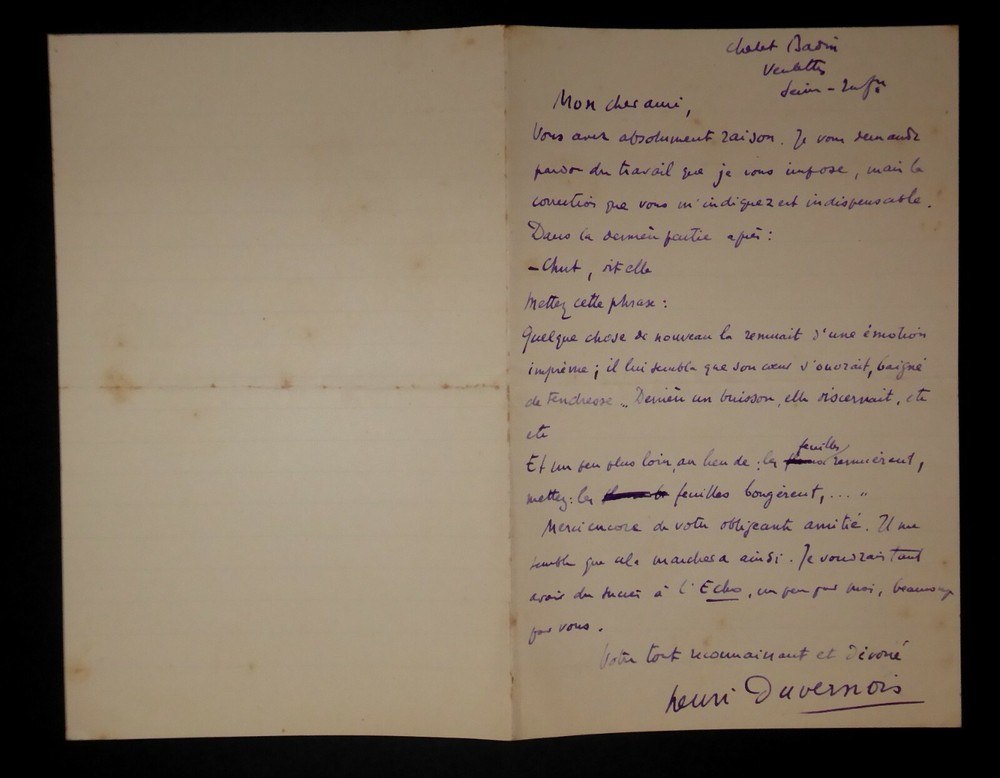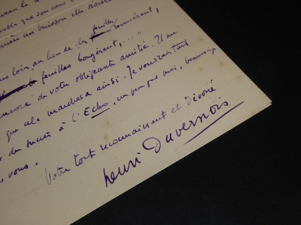 Henri DUVERNOIS. Lettre autographe signée. Lettre d'une page adressée à un confrère dans laquelle il exprime son souhait de modifier une ligne d'un manuscrit, sous les bons conseils de son correspondant : "Vous avez absolument raison. Je vous demande pardon du travail que je vous impose, mais la correction que vous m'indiquez est indispensable." Cette modifications se situerait dans la dernière partie, à laquelle il souhaite ajouter un passage afin de préciser le ressenti du personnage en question : "Mettez cette phrase : Quelque chose de nouveau le remuait d'une émotion imprévue; il lui sembla que son coeur s'ouvrait, baigné de tendresse... Derrière un buisson, elle discernait, etc." ainsi que ce passage "Et un plus loin, au lieu de : les feuilles remuèrent, mettez : les feuilles bougèrent, ..." Il ajoute aussi : "Je voudrais tout avoir du succès à l'Echo, un peu pour moi, beaucoup pour vous." Cette lettre semble donc être destinée à son éditeur. Dimensions : 11.2 x 17 cm . 1 page. Etat : Bon état de conservation malgré la présence de rousseurs. Henri Duvernois, nom de plume d'Henri-Simon Schwabacher, est un écrivain, scénariste et dramaturge français, né le 4 mars 1875 à Paris, ville où il est mort le 30 janvier 1937. Wikipédia Envoi soigné dans un emballage rigide et étanche. Satisfait ou remboursé. Si vous n'êtes pas entièrement satisfait, je reprends la marchandise avec retour à ma charge pour l'Europe et à la charge de l'acheteur pour le reste du monde. N’hésitez pas à visiter ma boutique et affiner vos recherches en fonction des catégories qui vous intéressent. Ma boutique L'Art Délivré. Lettres autographes, vieux papiers, livres anciens, photographies, gravures, timbres… Nous expertisons et/ou rachetons dans toute la France vos lettres, collections de lettres et livres anciens. Merci de votre visite. Jérôme KAYSER. Lettre d'une page adressée à un confrère dans laquelle il exprime son souhait de modifier une ligne d'un manuscrit, sous les bons conseils de son correspondant : "Vous avez absolument raison. Je vous demande pardon du travail que je vous impose, mais la correction que vous m'indiquez est indispensable." Cette modifications se situerait dans la dernière partie, à laquelle il souhaite ajouter un passage afin de préciser le ressenti du personnage en question : "Mettez cette phrase : Quelque chose de nouveau le remuait d'une émotion imprévue; il lui sembla que son coeur s'ouvrait, baigné de tendresse... Derrière un buisson, elle discernait, etc." ainsi que ce passage "Et un plus loin, au lieu de : les feuilles remuèrent, mettez : les feuilles bougèrent, ..." Il ajoute aussi : "Je voudrais tout