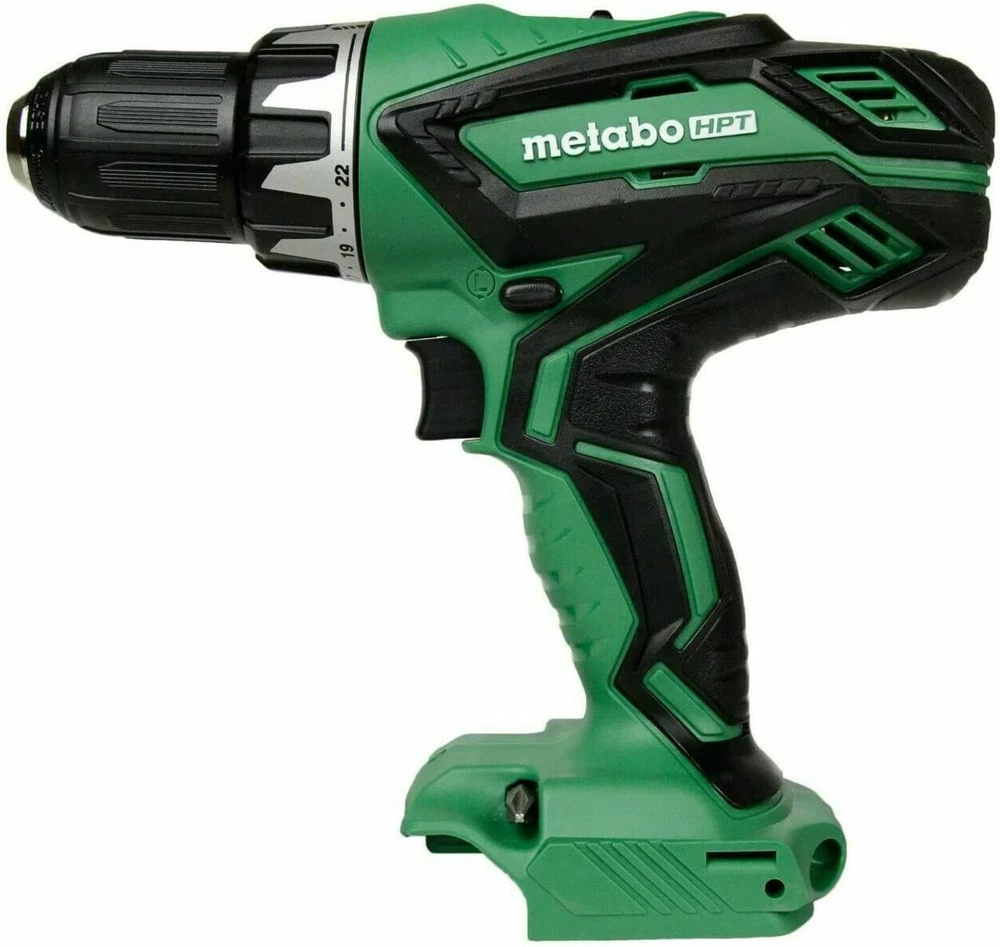 22+2 stage clutch, delivers 22 torque settings, a drill mode and a hammer drill mode to properly match the torque to the application Powerful 487 in/lbs of torque and up to 1,400 RPM and 19,600 BPM to handle tough jobs LED light effectively illuminates dark work spaces, 1/2 in keyless ratcheting chuck,for quick ans simple bit replacements Responsive variable speed trigger provides complete control during operation Tool Only, Battery and Charger Sold Separately The Metabo HPT DV18DGLP4 (Tool Only) features a compact, yet efficient battery. With 487 in/lbs of torque, this hammer drill can power through any tough job with ease. A convenient LED light illuminates dark work spaces and a keyless 1/2 in chuck provides simple bit replacements. It also features a 22+2 stage clutch with 22 torque settings, a drill mode and hammer mode for precision and control. Tool Only, Battery and Charger Sold Separately. Hitachi Power Tools is now Metabo HPT. Different name, same tools, same warranty, same batteries, same color scheme, same packaging, same innovation. Hitachi 18 volt batteries will work in Metabo HPT 18 volt tools and vice versa.