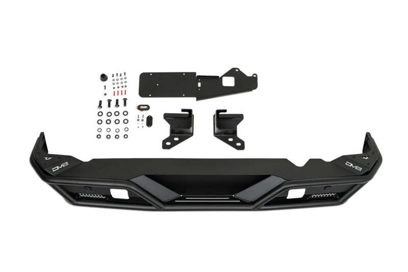 DV8 Offroad?s 6th Gen Bronco Competition Series Rear Bumper is a steel tube & plate constructed low-profile bumper inspired by desert racing. Towards either side of the bumper are light mounts suited for 3-inch LED light pods. Its low-profile design allows you to fit up to a 37-inch spare tire. The OEM reverse sensors are integrated into the bumper via mounting holes, this retains full functionality of the feature. It also accommodates the factory hitch. There are two, paintable aluminum accent panels that help cut weight and add to the style of the bumper. Installation is a simple bolt-on process. 2021-2023 Ford Bronco