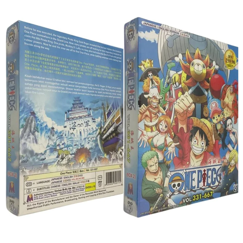 DVD Anime One Piece Box.2 TV Series (Vol.331-667) ~ English Dubbed All Region Synopsis: Before he was executed, the legendary Pirate King Gold Roger revealed that he had hidden the treasure One Piece somewhere in the Grand Line. Now, many pirates are off looking for this legendary treasure to claim the title Pirate King. One pirate, Monkey D. Luffy, is a boy who had eaten the Devil's Fruit and gained rubber powers. Now he and his crew are off to find One Piece, while battling enemies and making new friends along the way. Features and further details Title : One Piece Box 2 Vol. 331 - 667 (English Dubbed) Details: No Of Disc : 15 Disc Language : Japanese / English (Attn - Episode 492 - 542 - 590 : Japanese) Subtitle : Chinese / English Format : DVD / NTSC & All Region Code (16.9) Genres: Action, Adventure, Fantasy Weight : 441g Contact us We can be contacted at any time through eBay messages if you have any questions, comments or product requests. We will respond to you within 24 hours and do our best to help you out! We encourage our customers to contact us with any questions or concerns! We'd like to be sure you are completely satisfied with your purchase. Payment We accept payment via eBay - managed payment Shipping We are using standard international shipping. Handling time is 1-3 business working days. Your goods will be shipped with valid tracking number. All products is packed , layered with bubble wrap to reduce damages during shipment delivery. Estimated delivery is between 11 to 23 business working days. We also provide express shipping as an option. Estimated delivery is between 5 to 8 business days. **Rest assured we will ensure your package arrives as soon as possible. However, the delivery may be delayed due to some unforeseen circumstances which is out of our control, such as bad weather, high postal traffic and the performance of shipping companies. Return If you have any problem with the order, do contact us via eBay message, we will be glad to assist you and resolve your problems as soon as possible. Items can be returned within 30 days in good condition. Note: Import duties, taxes and additional charges are not included in item price or shipping charges. Please be aware these custom import duties and taxes are buyer's responsibility. Free eBay listing template designed by © dewiso.com .