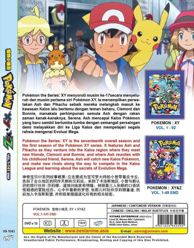 TITLE : POKEMON : XY + XY&Z Pokemon : XY Vol.1-92 End Pokemon : XY & Z Vol.1-49 End DESCRIPTION No of Disc : 12 No of Episode : 1 - 141 End Language : Japanese Subtitle : English / Chinese Format : DVD / NTSC & All Region Code (16.9) Shipping Time Tracking Number Provided To Track Your Shipment Delivery 10 to 18 Days Without Sat & Sun Working Days Payment Paypal Accepted Contact US Any Problems Or Enquiries Please E-Mail US Thanks Feedback Should Any Problem Arise, Please E-Mail To Let US Know & We Will Do Our Best To Rectify Any Problems Return Within 14 Days No Questions, Ask Return. Buyer Will Need Pay Return Postage WE SELLING ALL ORIGINAL PRODUCT AND SIRIM MALAYSIA APPROVE BY GOV DEPARTMENT Thanks For Shopping Have a Nice Days