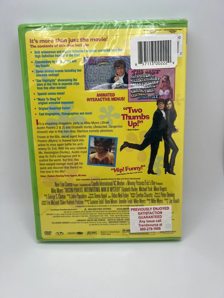 Genre:Comedy VideoActor:Mike Myers, Elizabeth Hurley, Michael YorkRelease Year:1997Format:DVDSub-Genre:Action / AdventureSubtitle Language:English, French, Spanishgtin13:0794043457722Producer:Mike Myers, Demi Moore, Jennifer Todd, Matty Simmons, Suzanne Todd, Todd MikeLanguage:English, FrenchUPC:0794043457722Run Time:90 min.Country/Region of Manufacture:United StatesMusic Artist:George S ClintonRating:PG-13Edition:Platinum EditionFeatures:Commentary, Deleted Scenes, Widescreen, With SubtitlesStudio:New Line Home VideoDirector:Jay RoachType:MovieMovie/TV Title:Austin Powers: International Man of MysteryCase Type:Tall/DVD Case