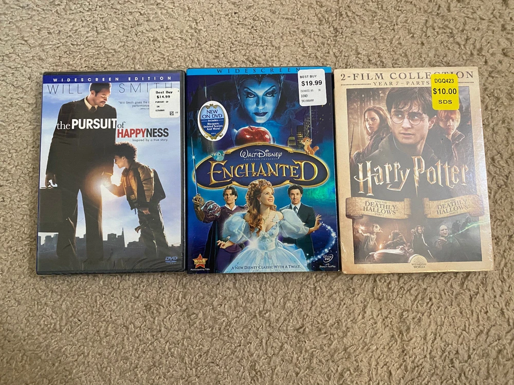PLEASE NOTE: DVDs have been visually inspected for cracks or major damage, and all cases are intact. These DVDs have not been tested in a player, so playback quality is unconfirmed Description : This extensive DVD lot includes a wide variety of popular movies, ranging from blockbuster series like Harry Potter and Star Wars to action, comedy, and family favorites. This collection is perfect for movie enthusiasts looking to expand their library with both new and classic titles. Here’s a breakdown of the details: Condition : DVDs have been visually inspected for cracks or major damage, and all cases are intact. These DVDs have not been tested in a player, so playback quality is unconfirmed. New/Sealed : Three DVDs are brand new and sealed, as pictured (includes The Pursuit of Happyness , Enchanted , and the Harry Potter two-film collection). Highlights : Harry Potter Series : Multiple films from the series. Star Wars Collection : Includes DVDs from both the original trilogy and the prequels. Variety of Genres : Action, comedy, romance, family films, and classics. Classic Titles : Includes cult classics and family hits like Cars , Rio , Moulin Rouge , and more. Lot Contents : Harry Potter Series (various titles) Star Wars (original and prequel trilogies, with bonus materials) The Pursuit of Happyness (sealed) Enchanted (sealed) Harry Potter and the Deathly Hallows Part 1 & 2 (sealed two-film collection) Assorted action, comedy, and family DVDs such as Rambo , The Dark Knight , The Rock , and more! This is a fantastic mix of DVDs, including beloved series and classics that offer hours of entertainment. Whether you’re a collector or just looking to enjoy some great movies, this lot has something for everyone. Please Note : These DVDs are sold as-is, without testing for playback, but are visually inspected and appear in good condition.